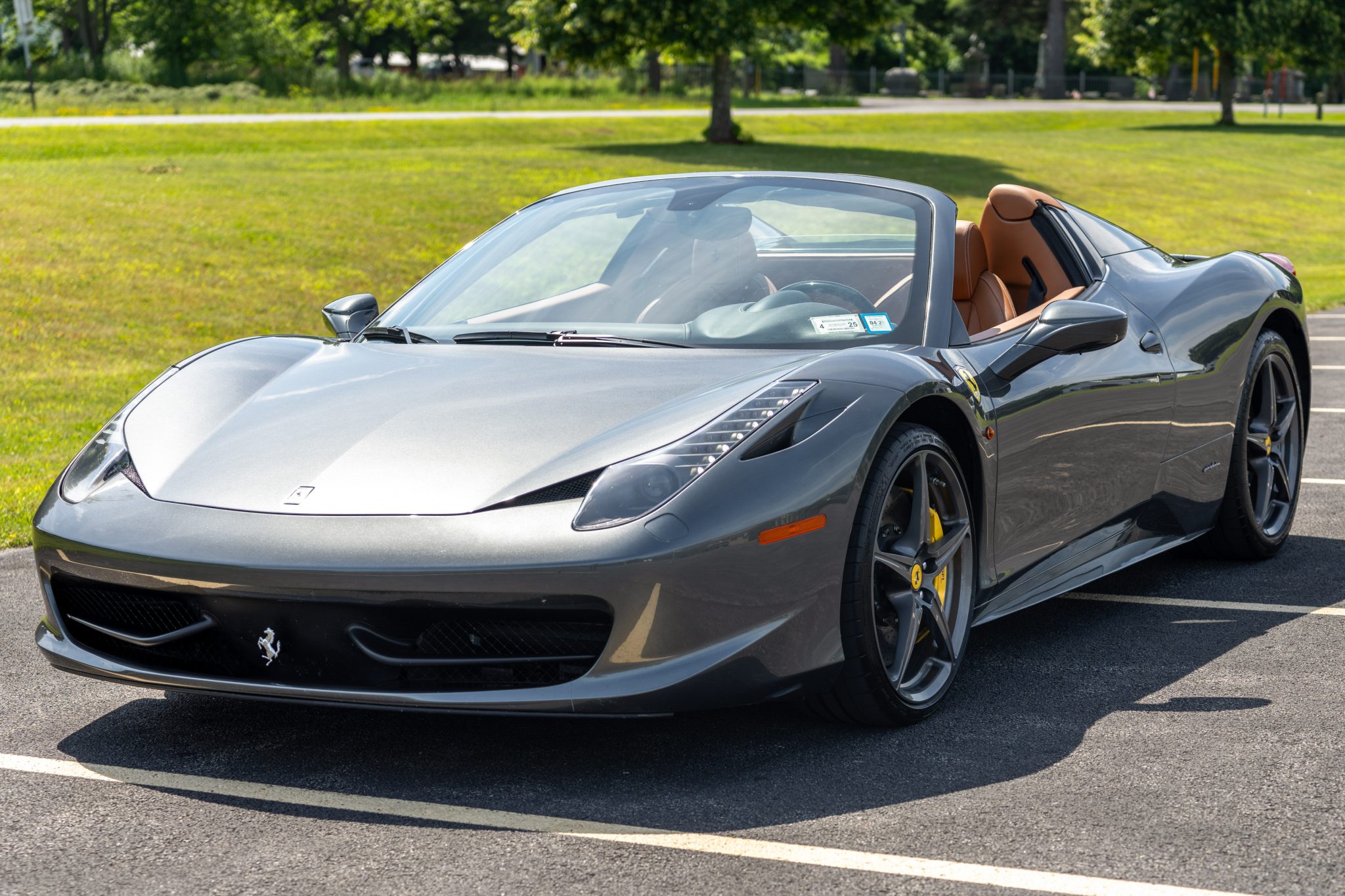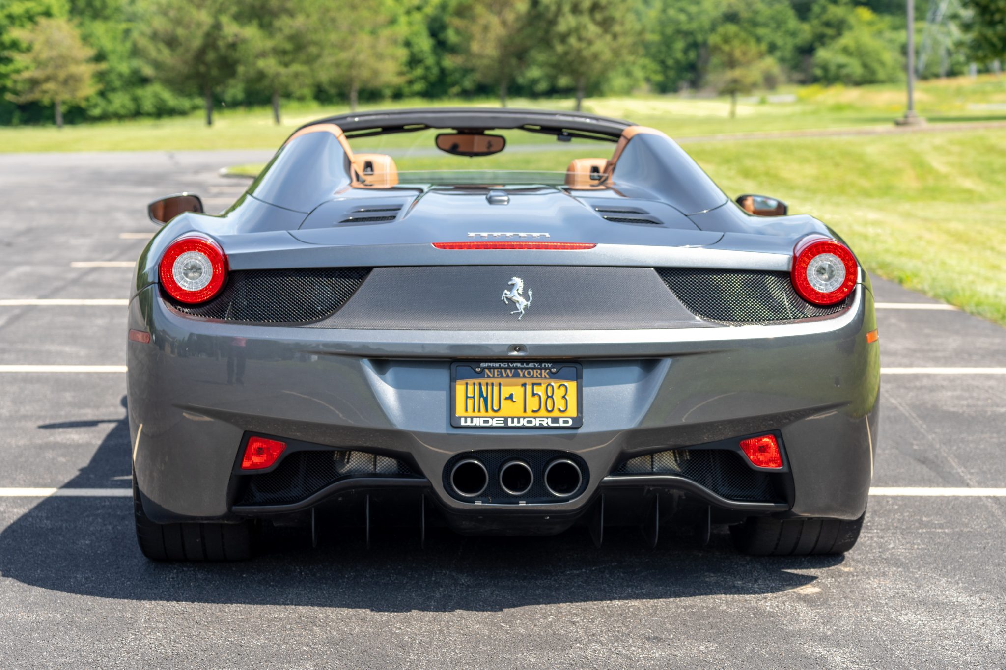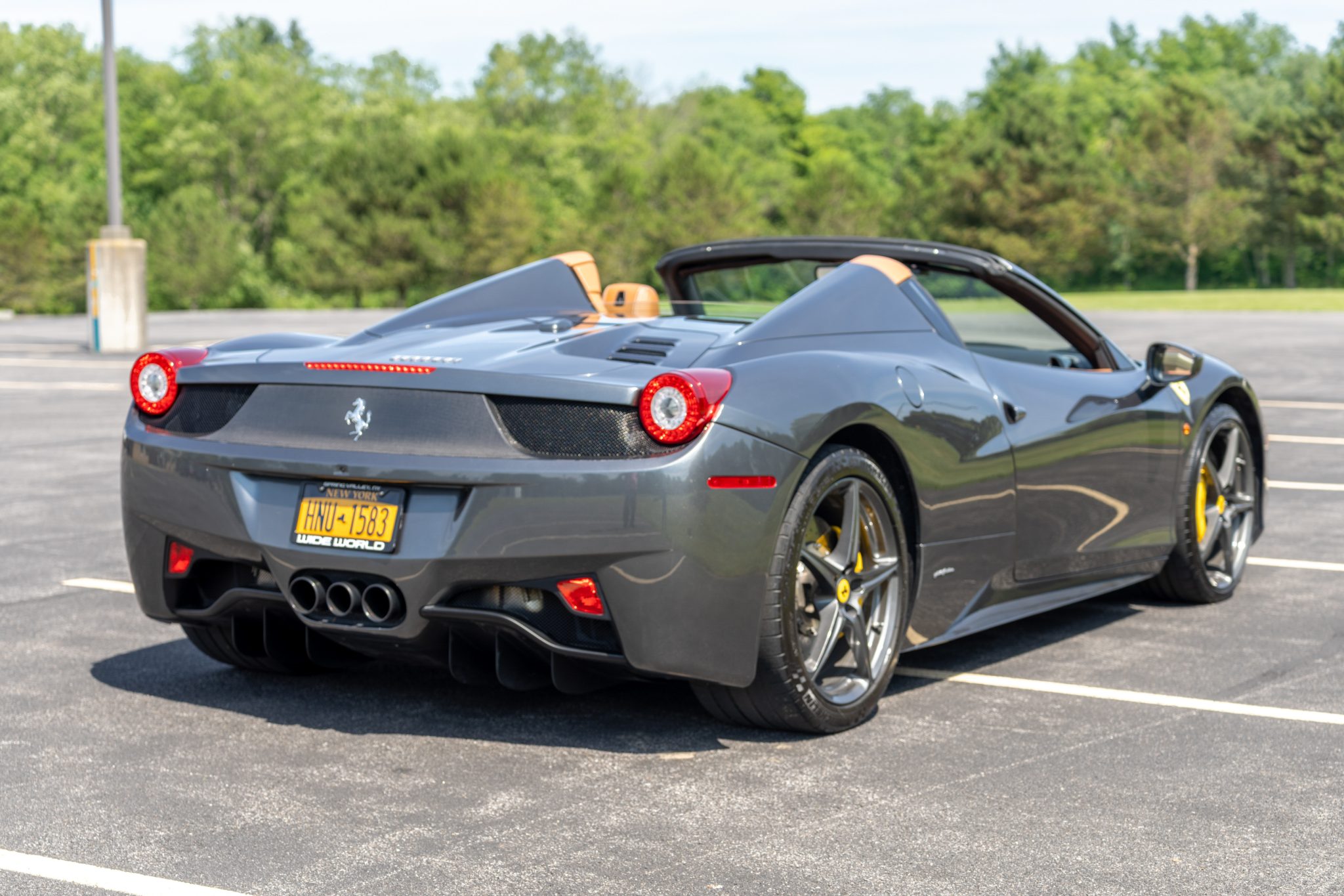Five-spoke 20″ alloy wheels are mounted with Michelin Pilot Super Sport tires that show 2015 date codes and measure 235/35 up front and 295/35 at the rear. The car is equipped with magnetorheological dampers and a suspension lift system, and braking is handled by yellow-finished Ferrari calipers over drilled carbon-ceramic rotors at all four corners. Scratches on two wheels have been repaired under current ownership.
