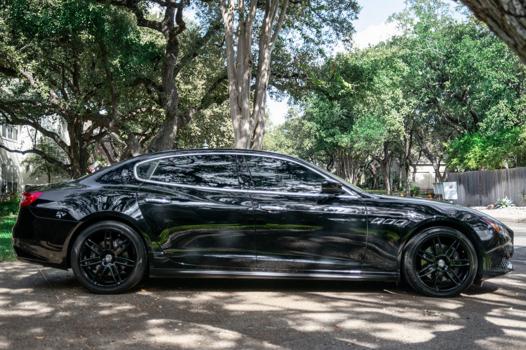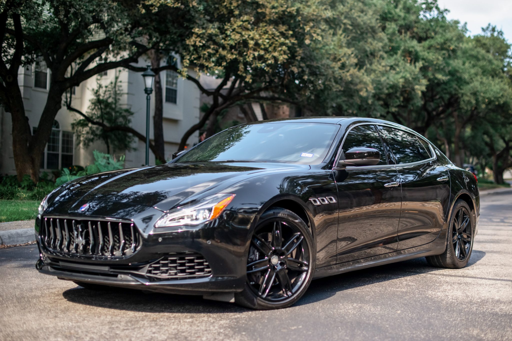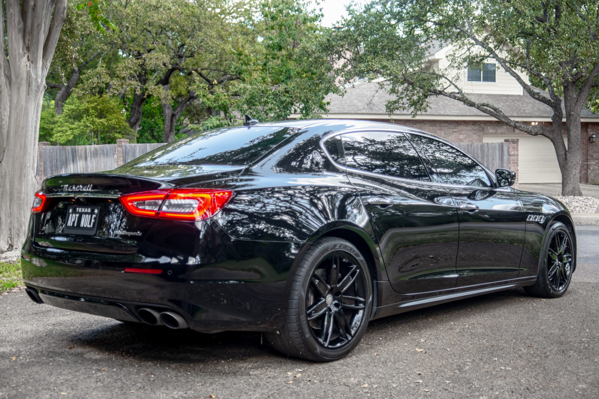 Black-finished 20″ split-spoke wheels are painted black and wear 245/40 front and 305/35 rear Pirelli P Zero tires that were installed in April 2022. The car is equipped with Skyhook suspension, and braking is handled by black Maserati-branded calipers over cross-drilled rotors at each corner.