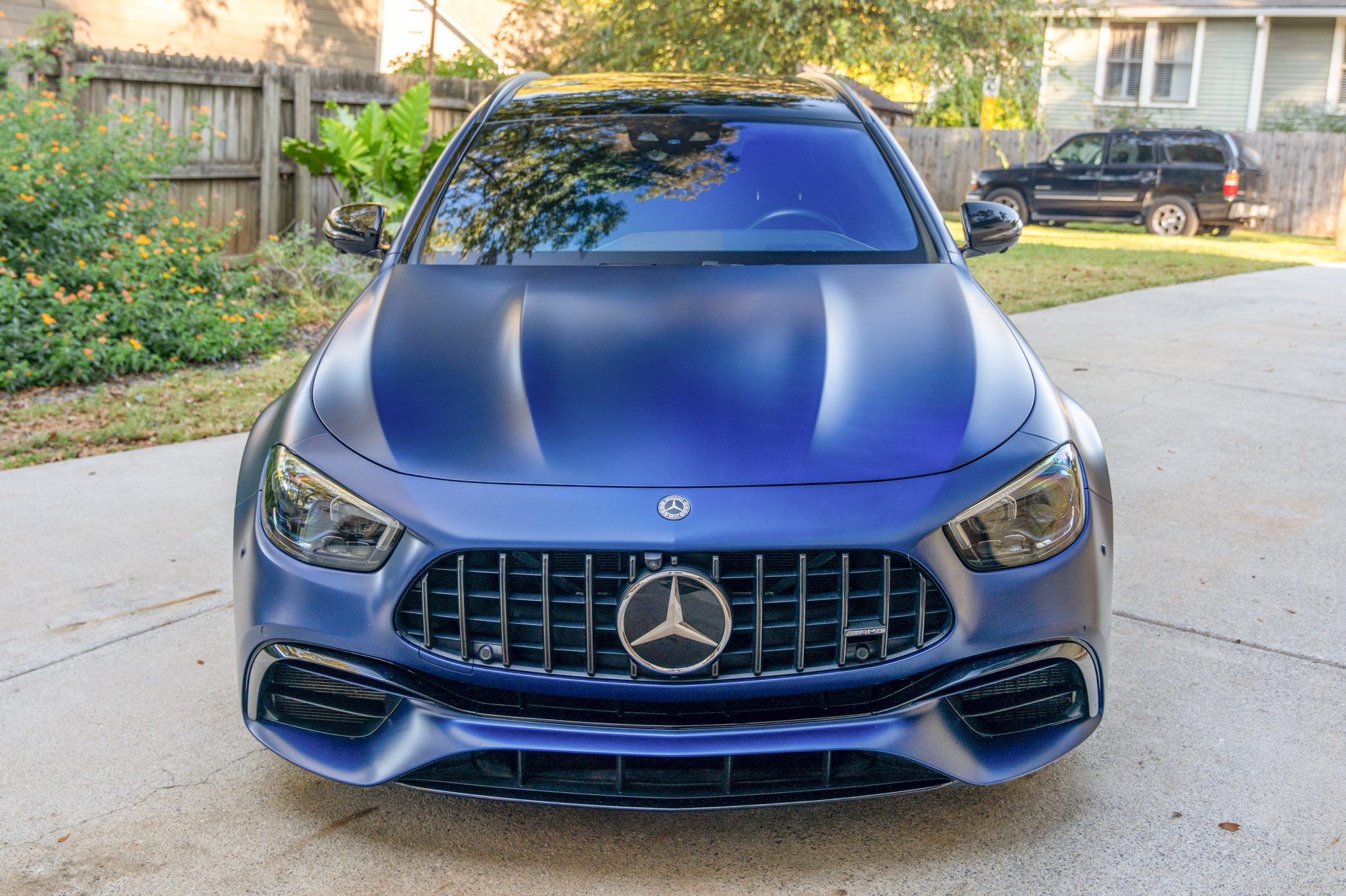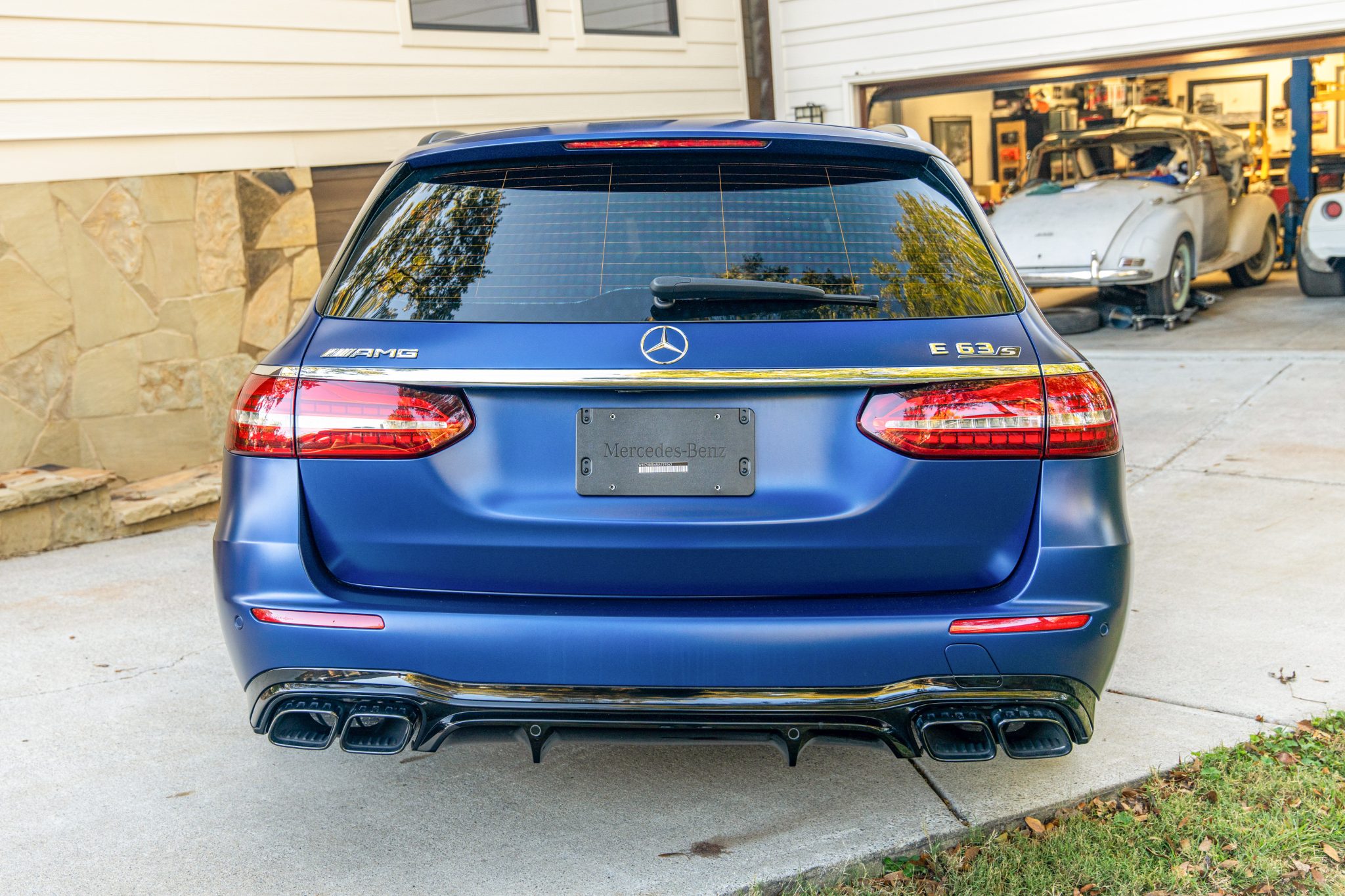 Matte black 20″ AMG forged cross-spoke wheels are mounted with mismatched tires. The car is equipped with an Air Body Control AMG Sport Suspension and an Electronic Stability Program (ESP). Stopping power is provided by gold-finished AMG-branded brake calipers over ceramic composite rotors at all four corners.
