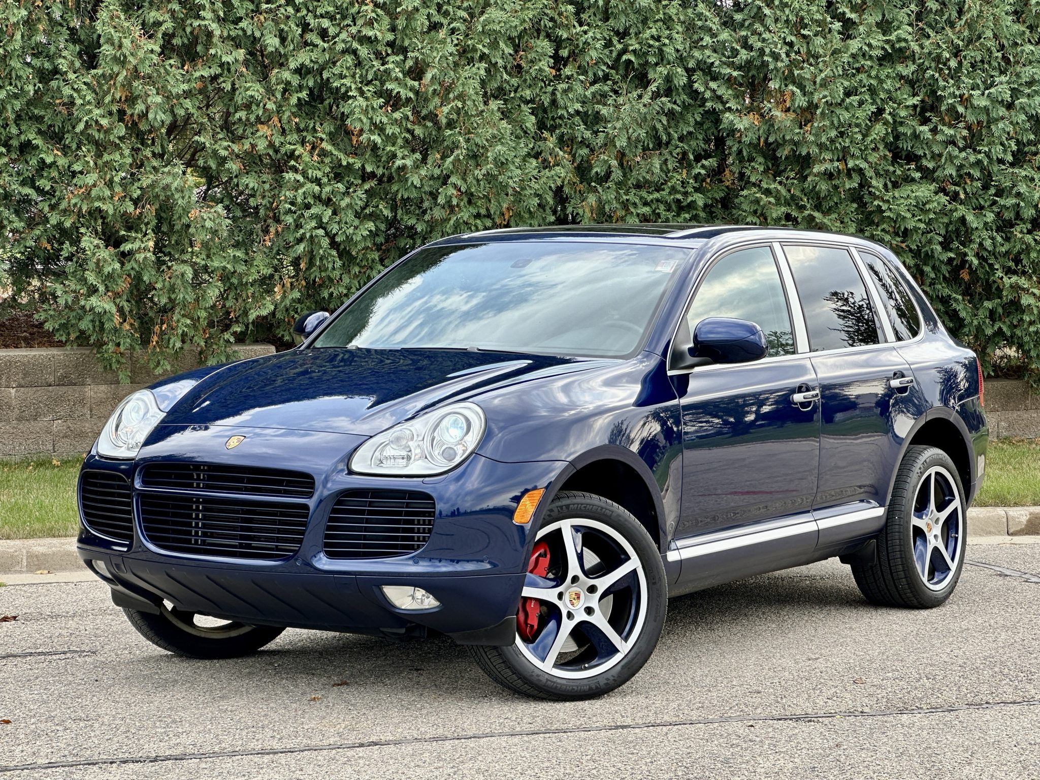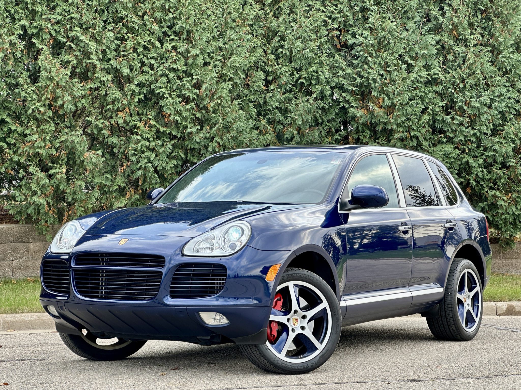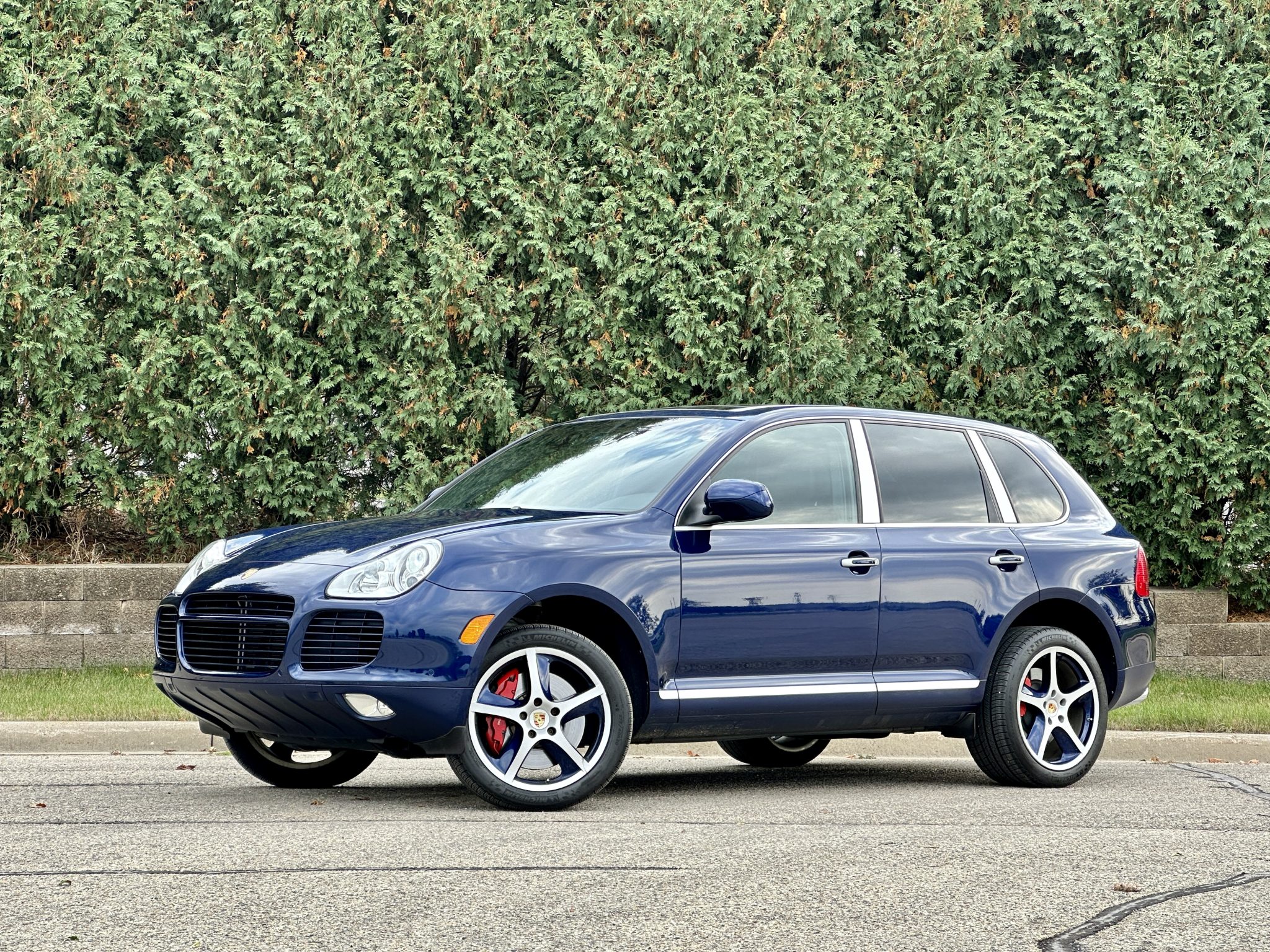 The 20″ Cayenne Sport Techno alloy wheels are finished in silver and Marine Blue Metallic and are mounted with Michelin tires. The SUV is equipped with an air suspension and Porsche Active Suspension Management (PASM). Stopping power is from Porsche-branded calipers over ventilated rotors at each corner.