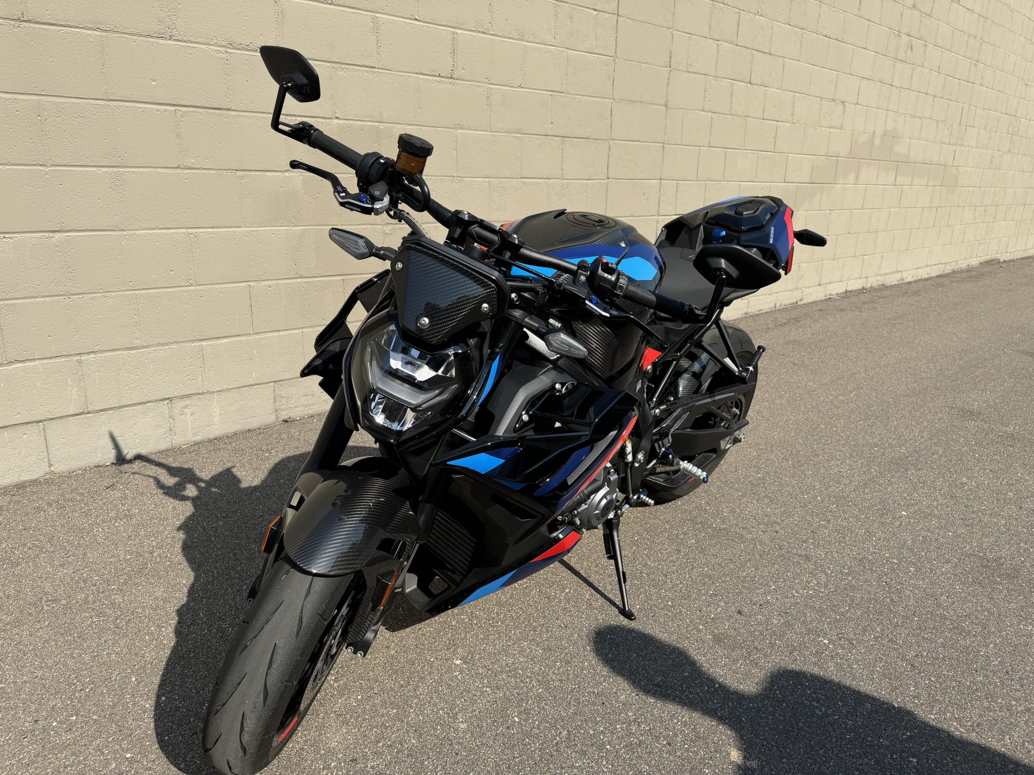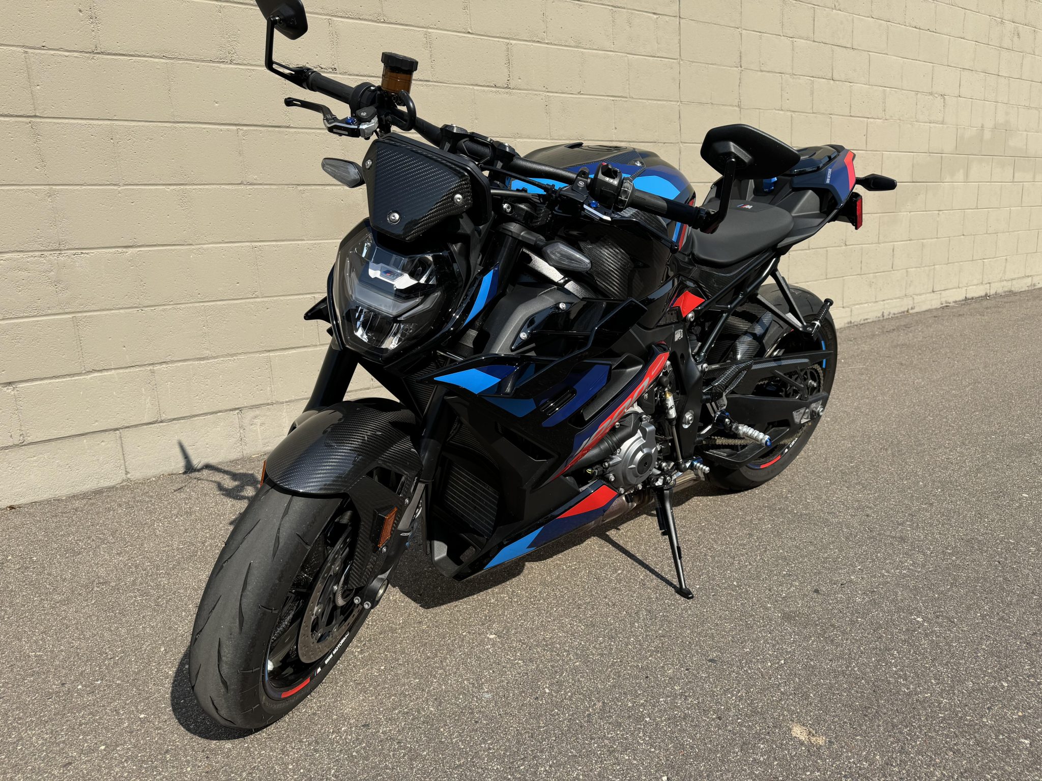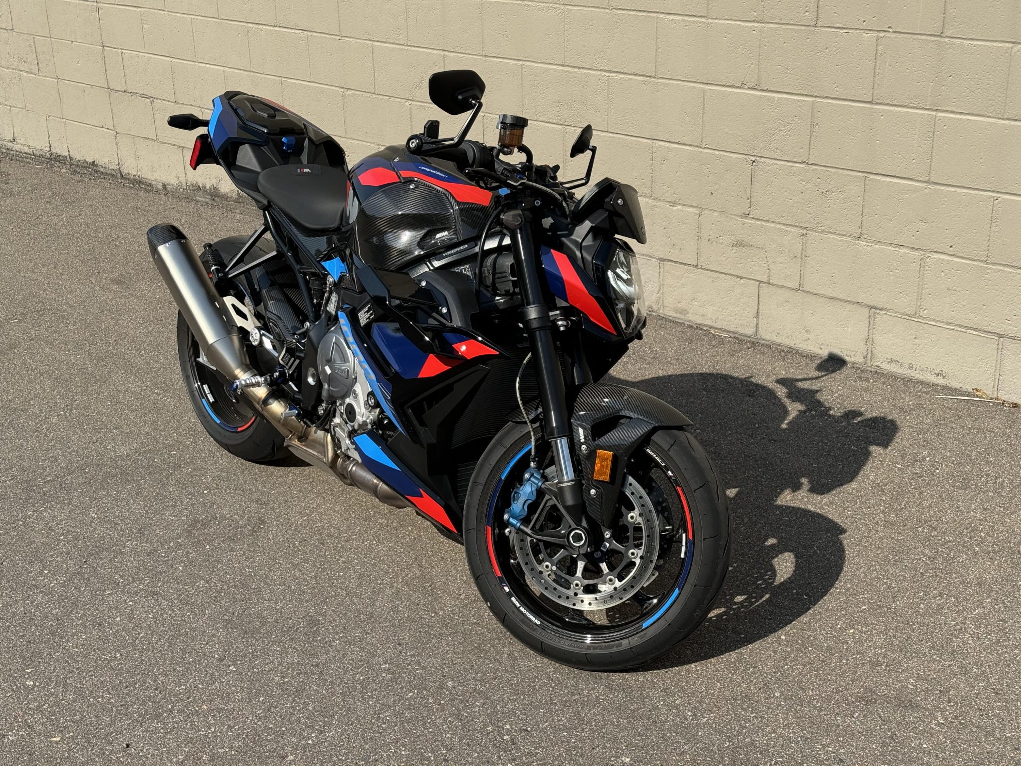 M Carbon 17″ wheels are mounted with 120/70 front and 200/55 rear Bridgestone Battlax Racing Street RS11 tires. Adjustable suspension consists of a 45mm inverted fork as well as a monoshock mounted to the swingarm. Stopping power comes from dual 320mm discs fitted with four-piston calipers up front and a single 220mm disc fitted with a single-piston caliper out back. BMW’s Ride Modes Pro and Dynamic Damping Control systems offer electronic damping and braking adjustments.