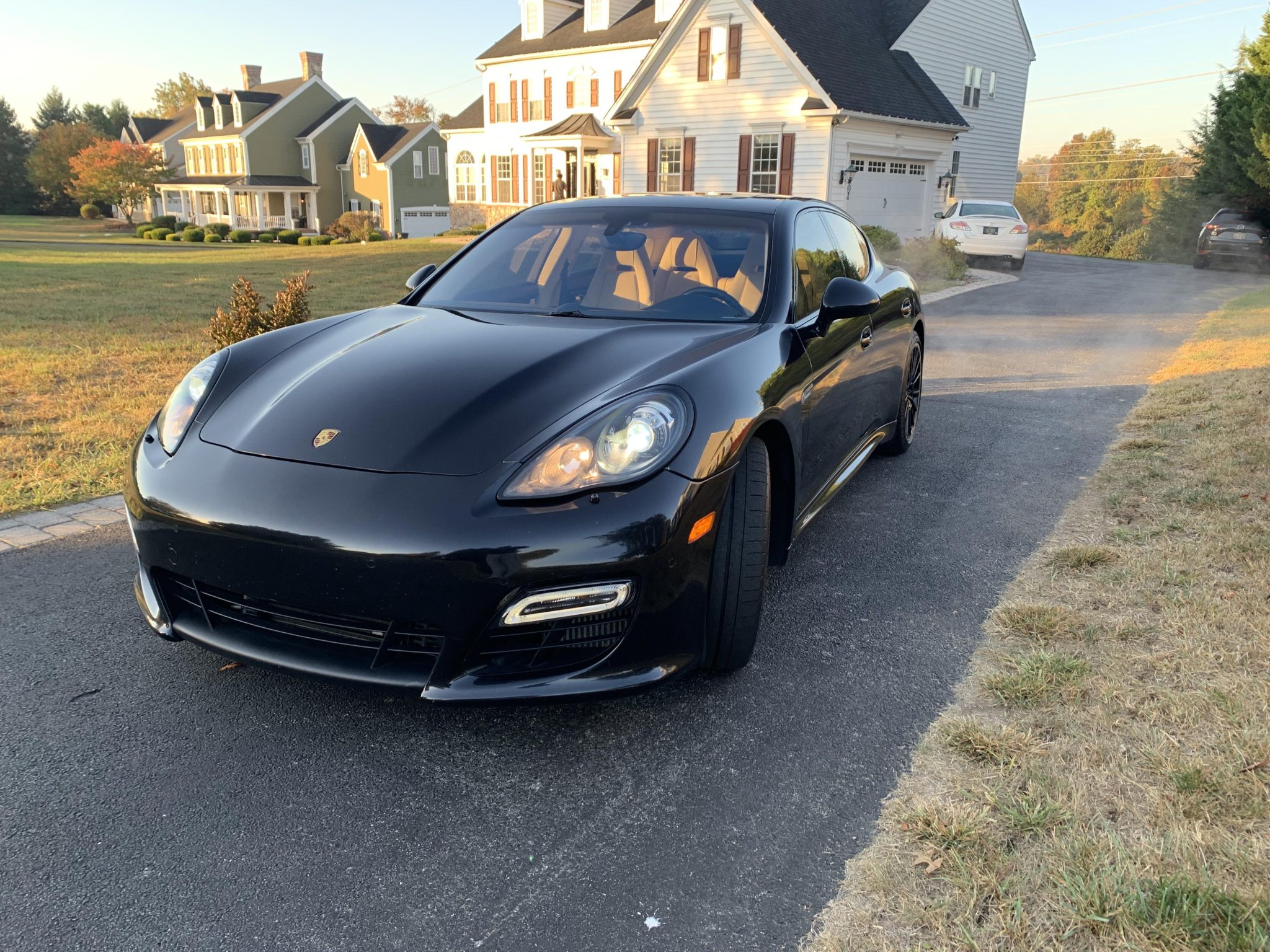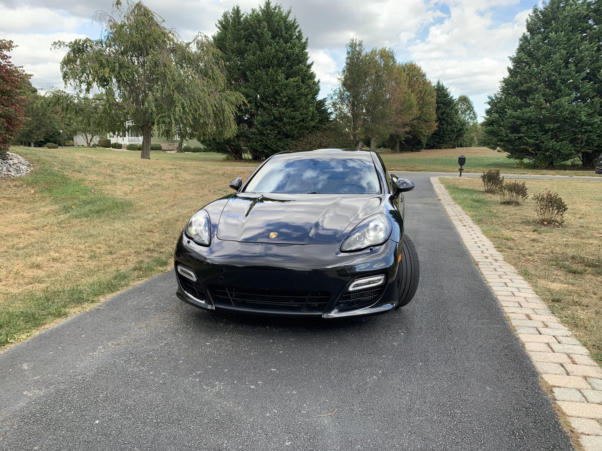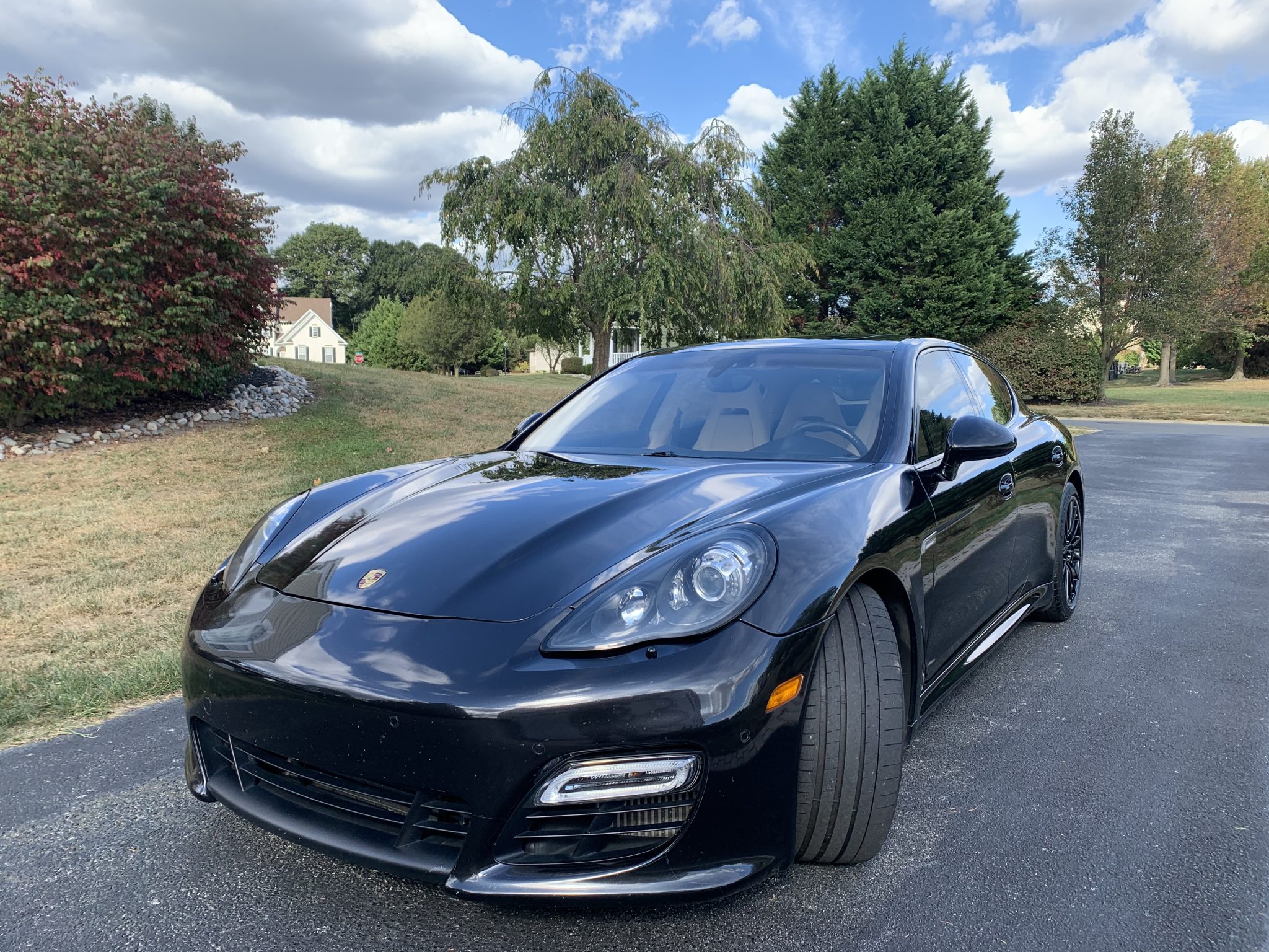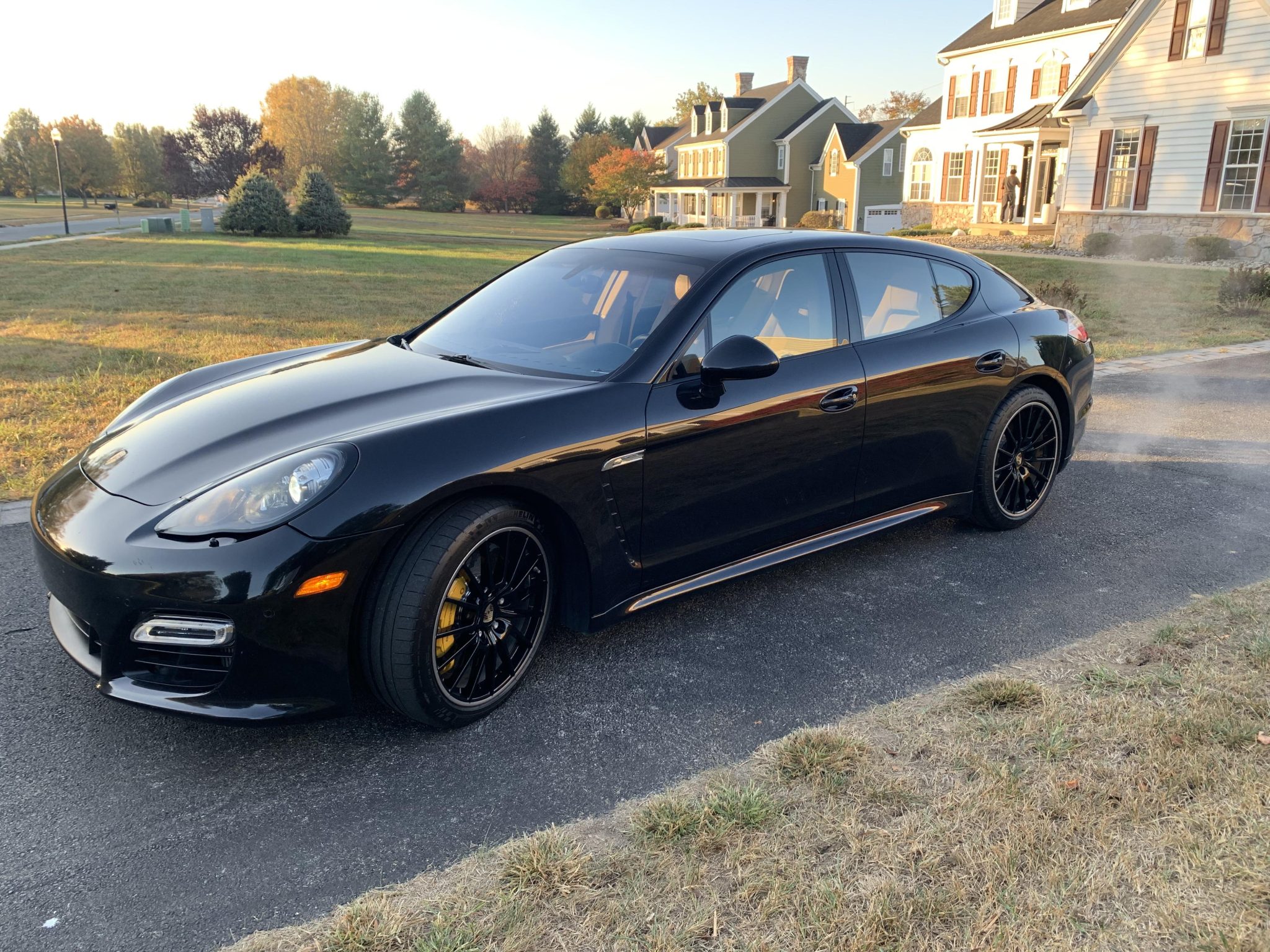 Black 20″ Panamera Sport alloy wheels have lighter outer rims and are mounted with Michelin Pilot Super Sport tires measuring 255/40 up front and 295/35 out back. The car was factory-equipped with adaptive air suspension and Porsche Active Suspension Management (PASM). Stopping power is provided by optional Porsche Ceramic-Composite Brakes (PCCB).