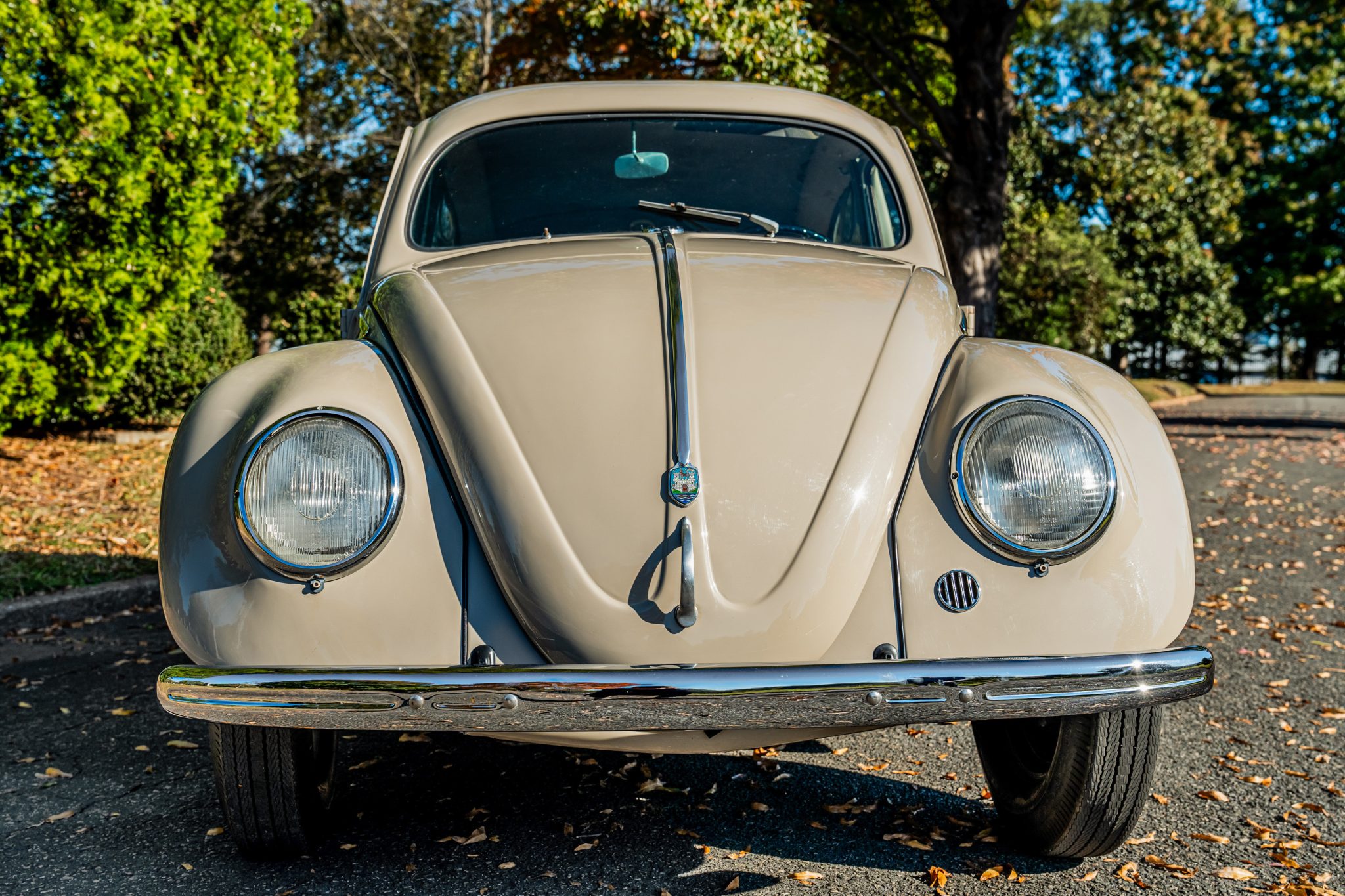 Body-color 16″ steel wheels wear chrome VW-stamped hubcaps and are mounted with a mixed set of 5.00/5.25-16 Excelsior and BFGoodrich bias-ply tires with Atlas Portawall whitewall inserts. Stopping power is provided by hydraulically actuated drum brakes.