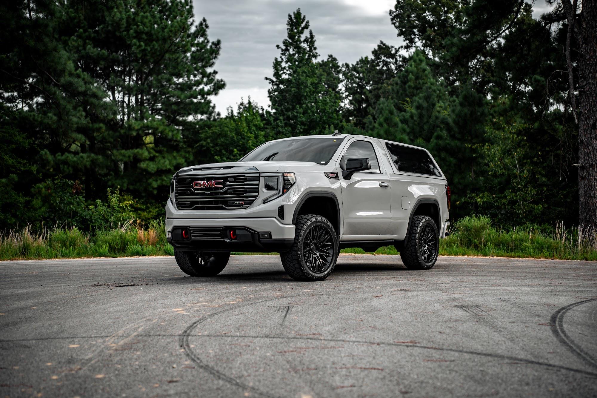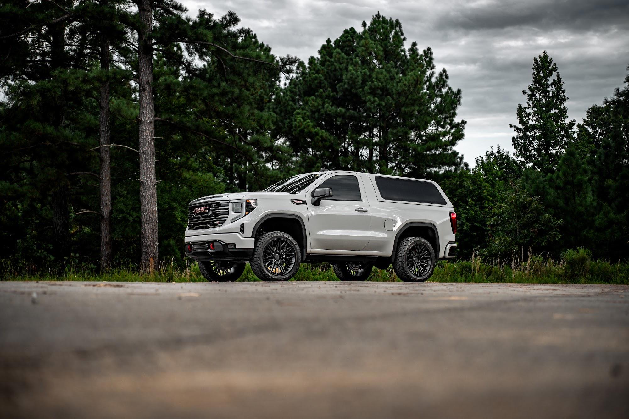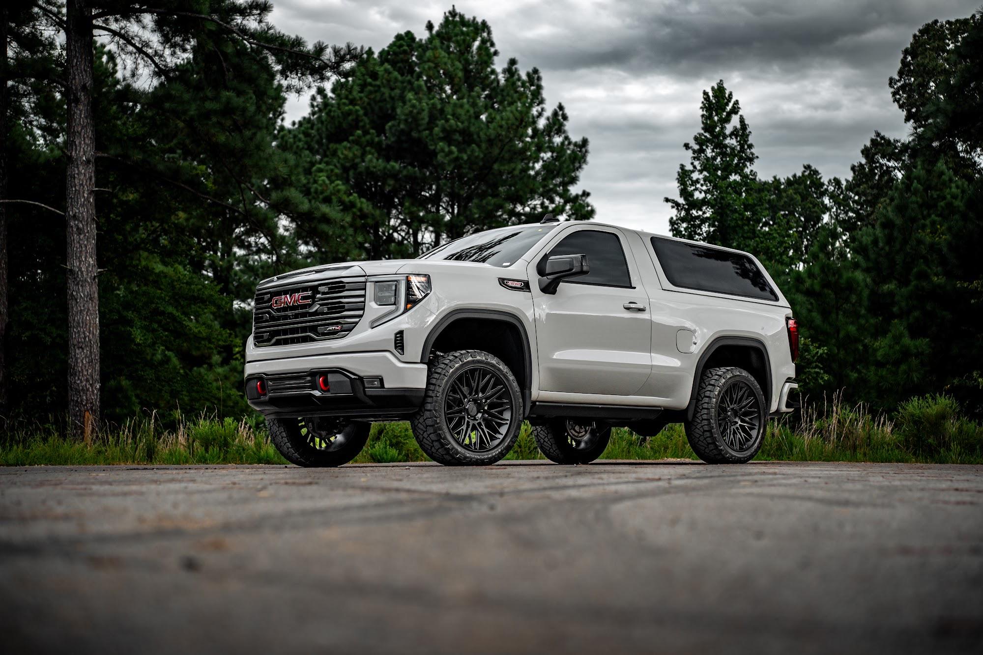 The 22″ Rotiform wheels are finished in black and are mounted with 285/50 Nitto Ridge Grappler tires. A non-matching spare is stored below the bed. The truck rides on a lifted suspension with Fox shocks and BDS front upper control arms. Stopping power is provided by four-wheel anti-lock disc brakes.