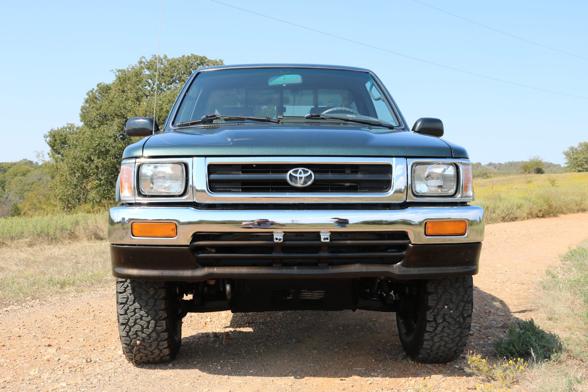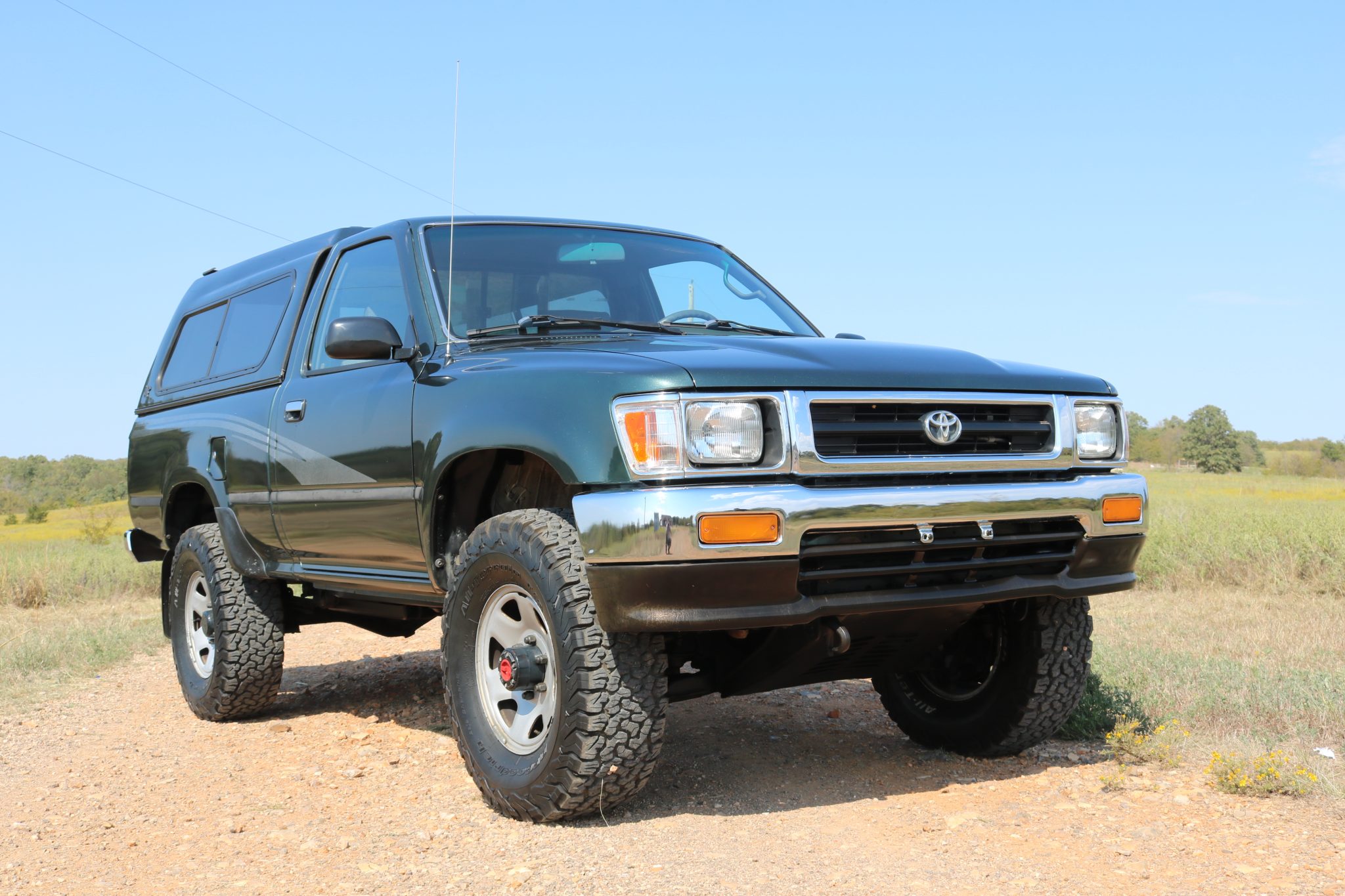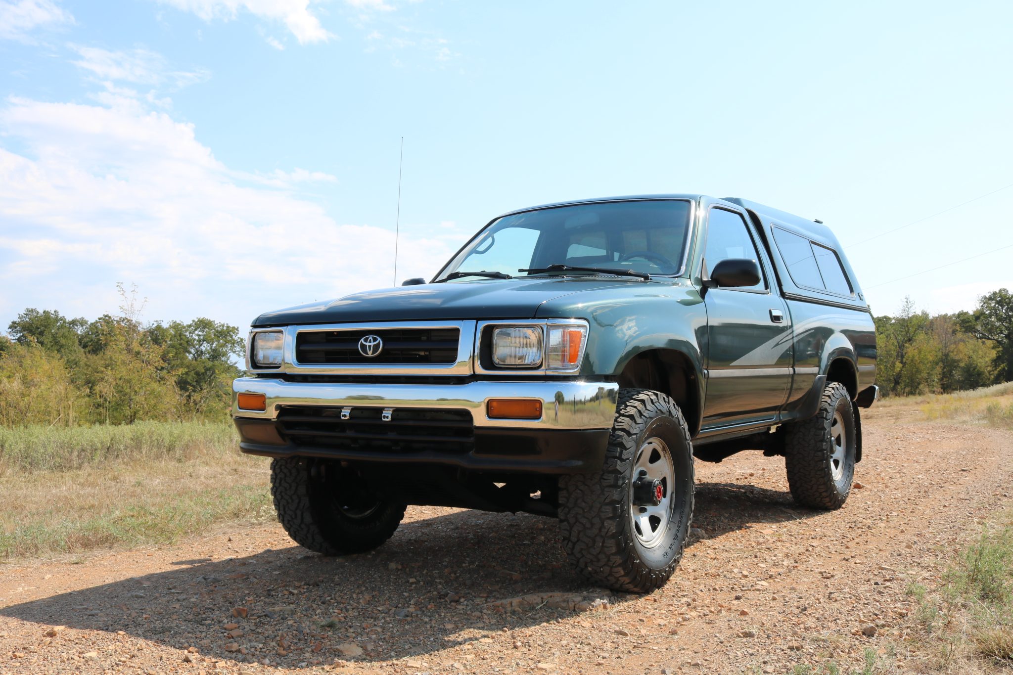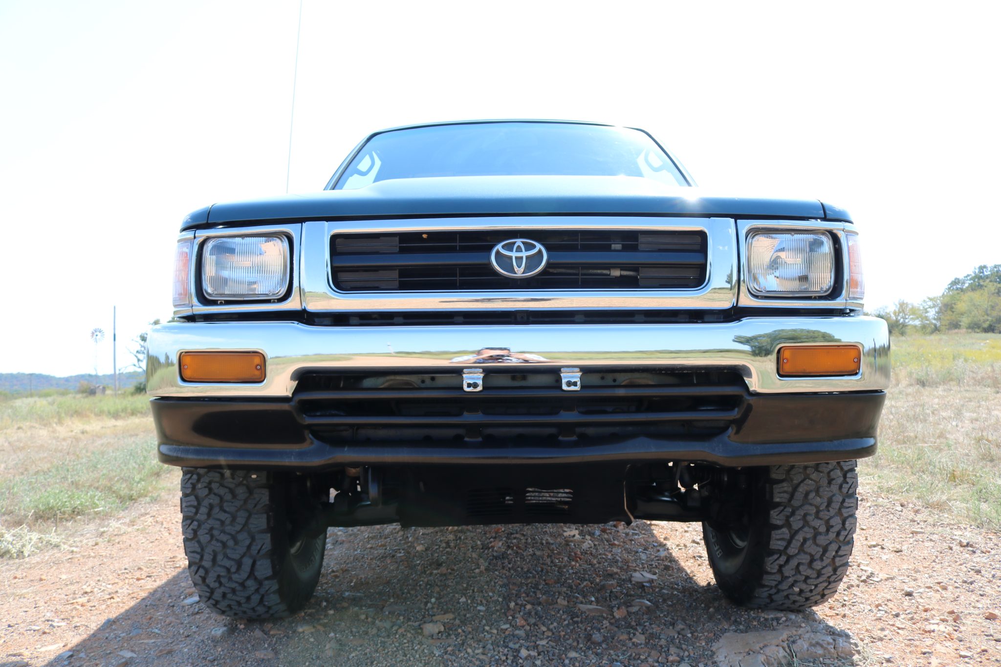 The 15″ six-hole steel wheels are mounted with 31×10.50″ BFGoodrich All-Terrain tires. The truck is equipped with manually locking front hubs, and braking is handled by power-assisted front discs and rear drums.
