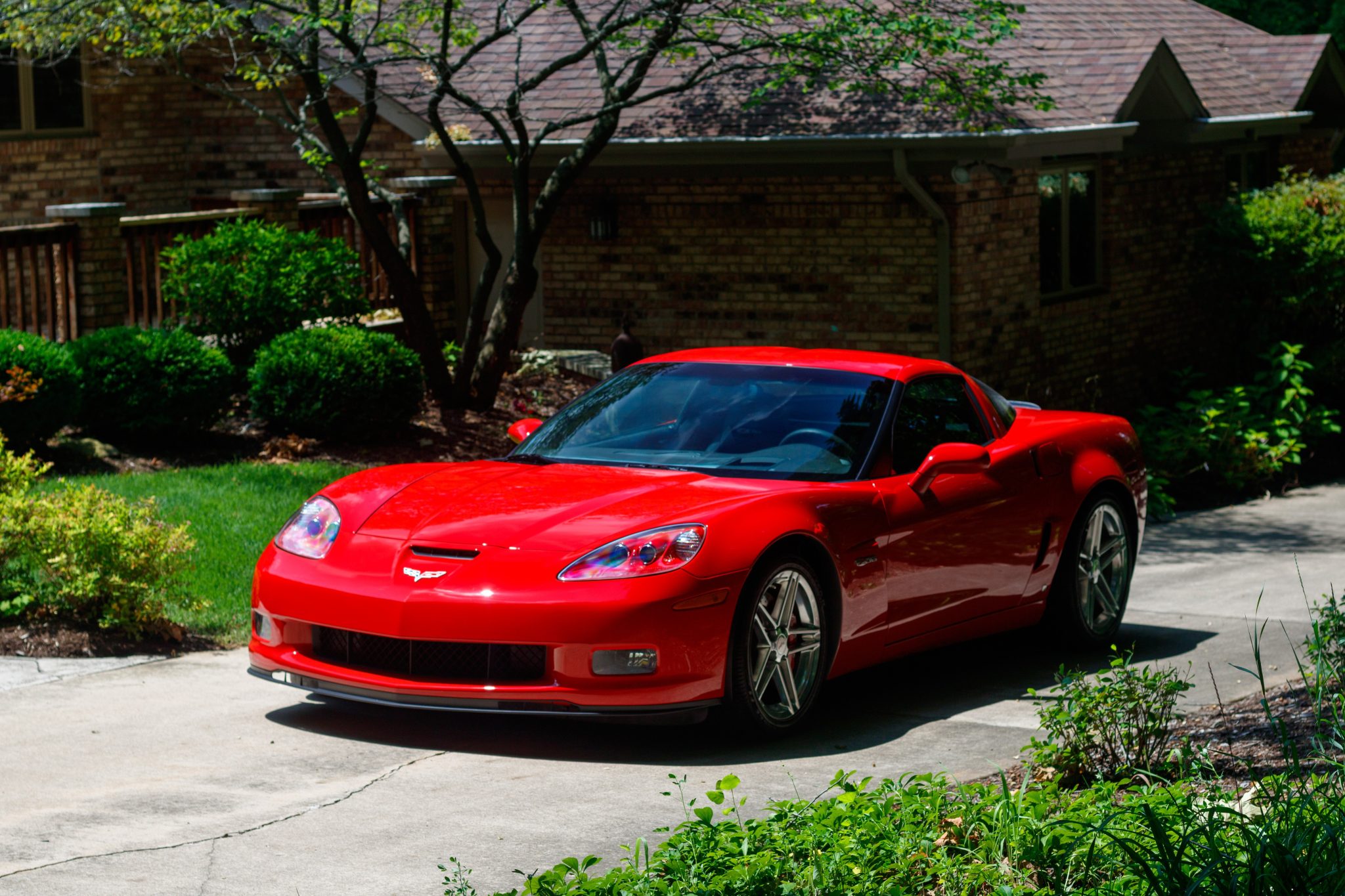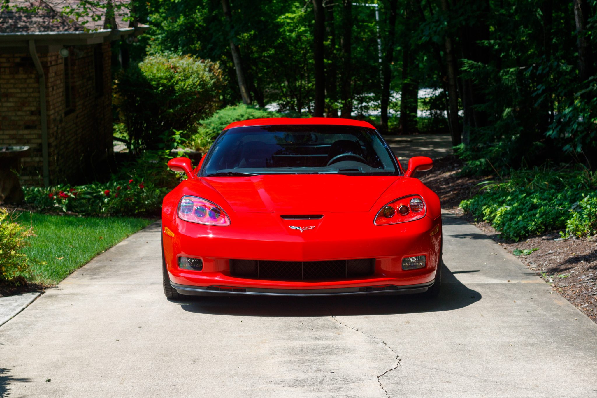 Polished staggered-diameter 18″ and 19″ double-spoke wheels are mounted with Goodyear Eagle F1 Supercar tires measuring 275/35 up front and 325/30 out back. Braking is handled by red-finished Corvette-branded calipers over cross-drilled and ventilated discs at each corner.