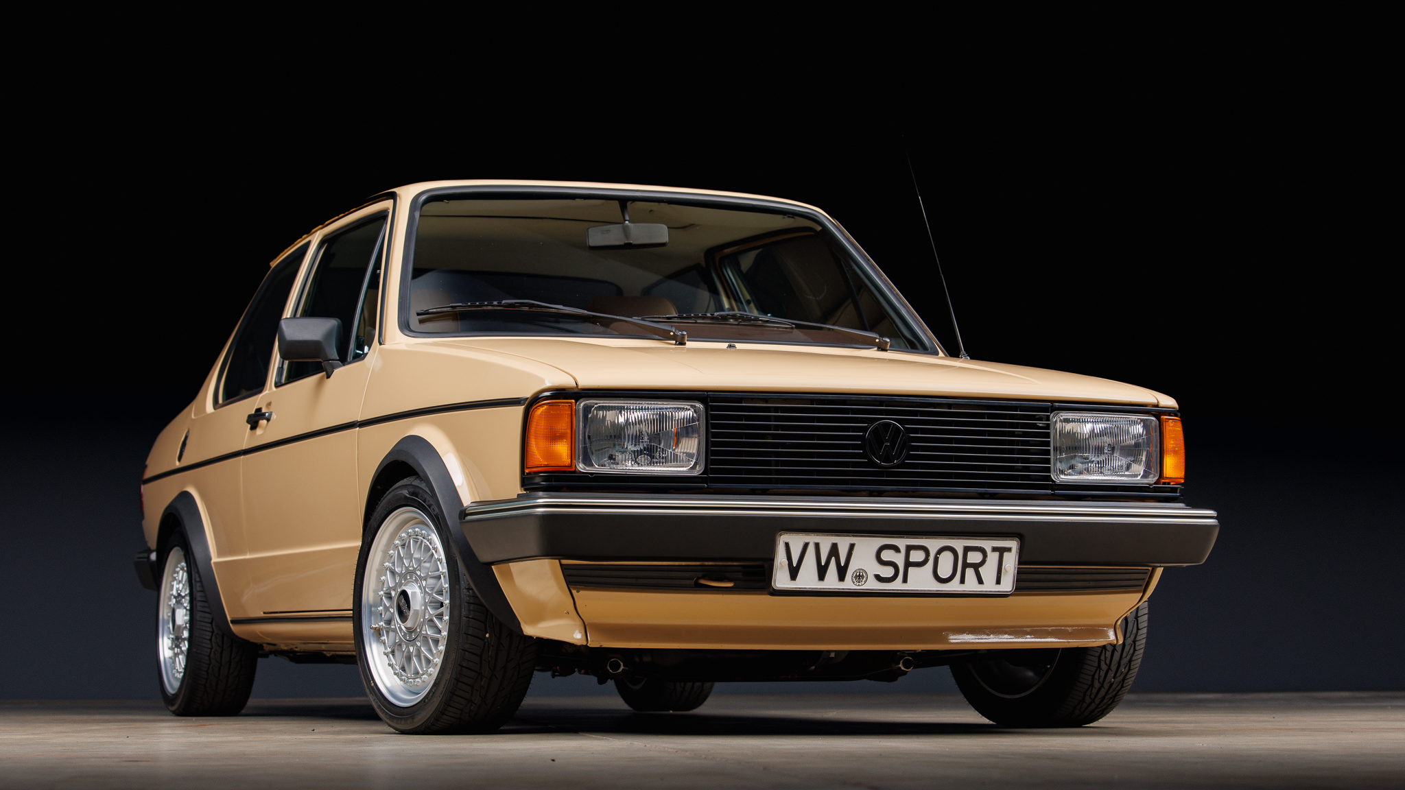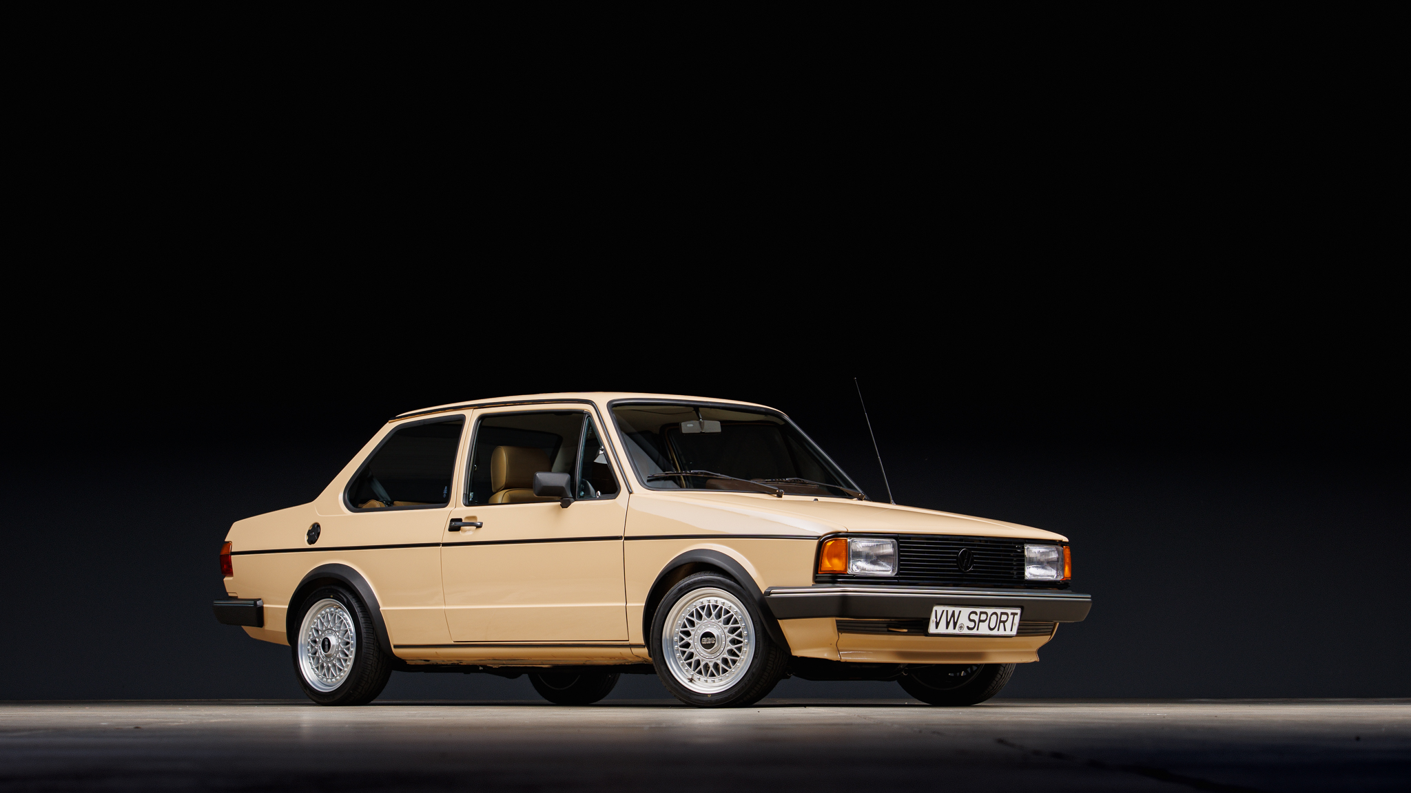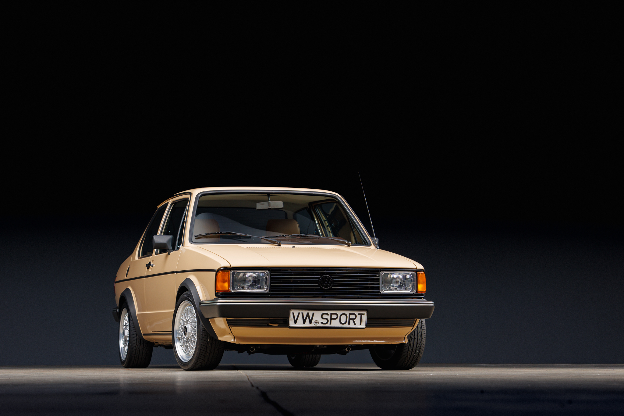 Silver-finished 15″ BBS RM alloy wheels are wrapped in 195/45 Toyo Extensa HP II tires. The suspension has been modified with H&R Street Performance coilovers along with a Neuspeed front chassis brace and rear sway bar, and Scirocco 16V braking components have been fitted along with a cross-drilled rotor at each corner.