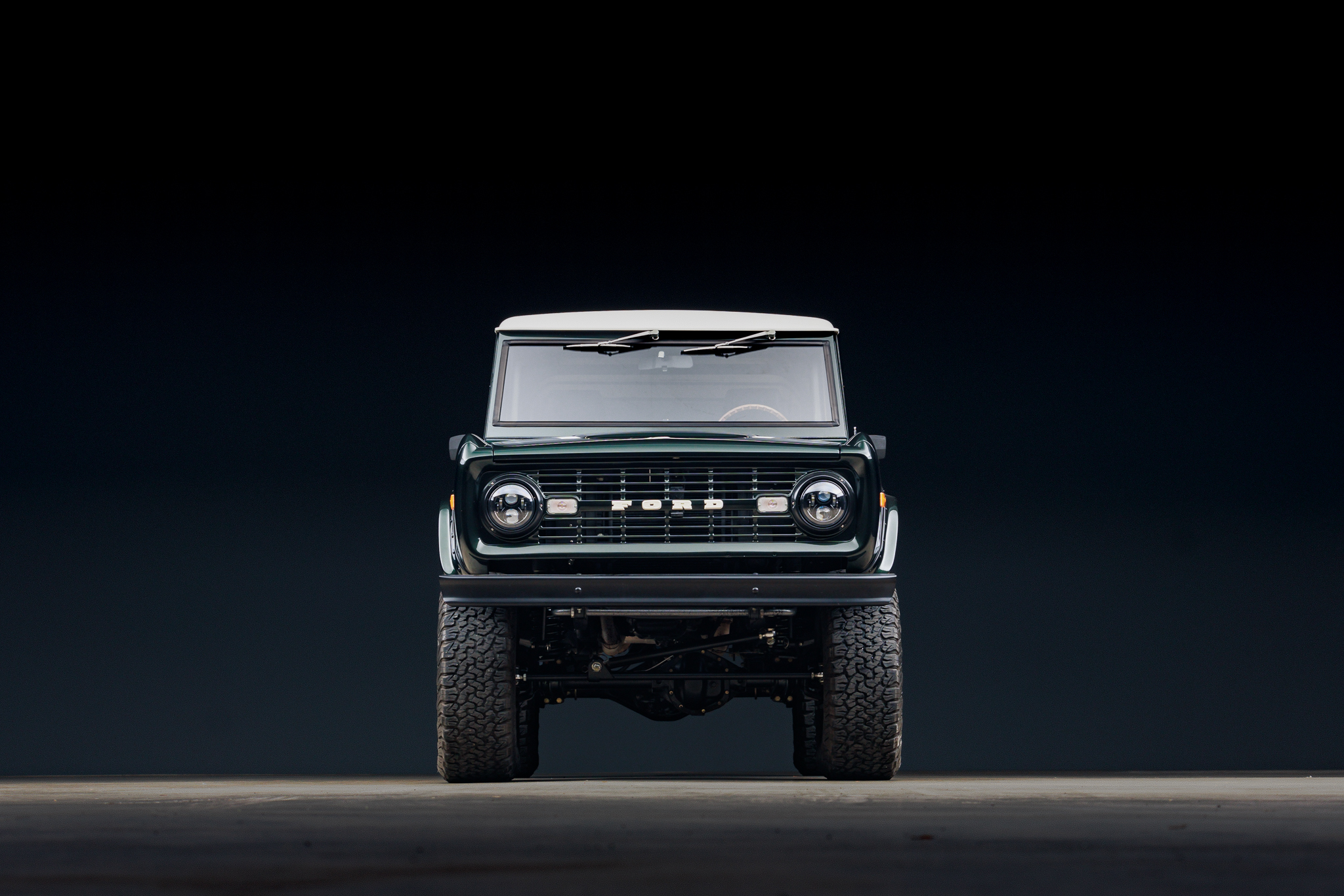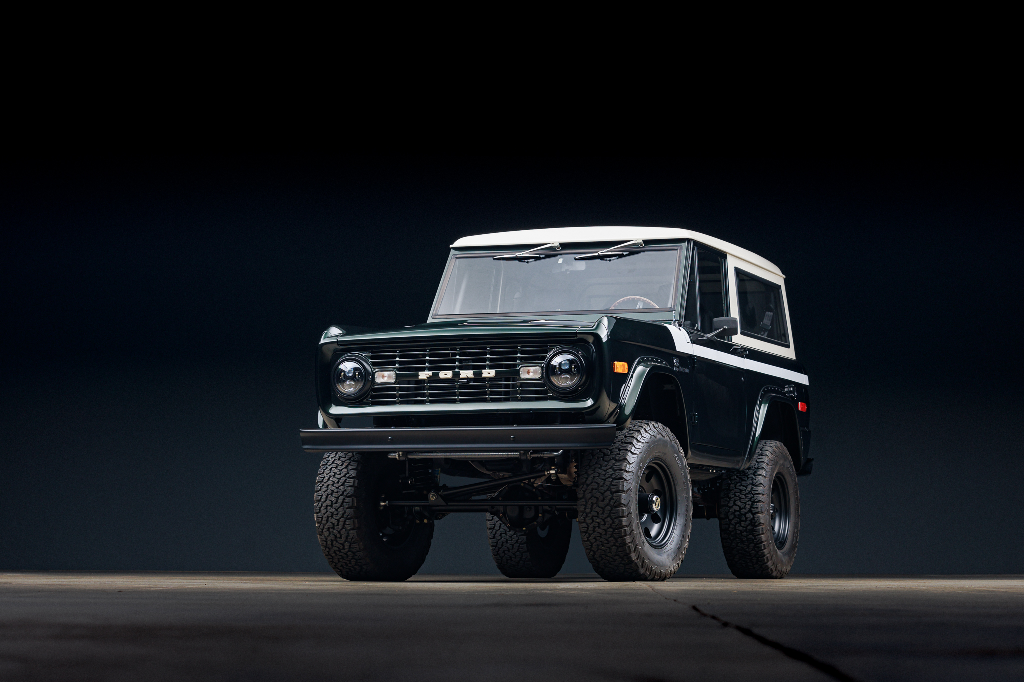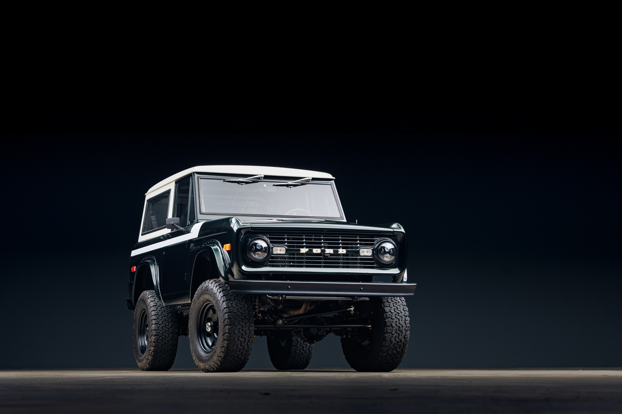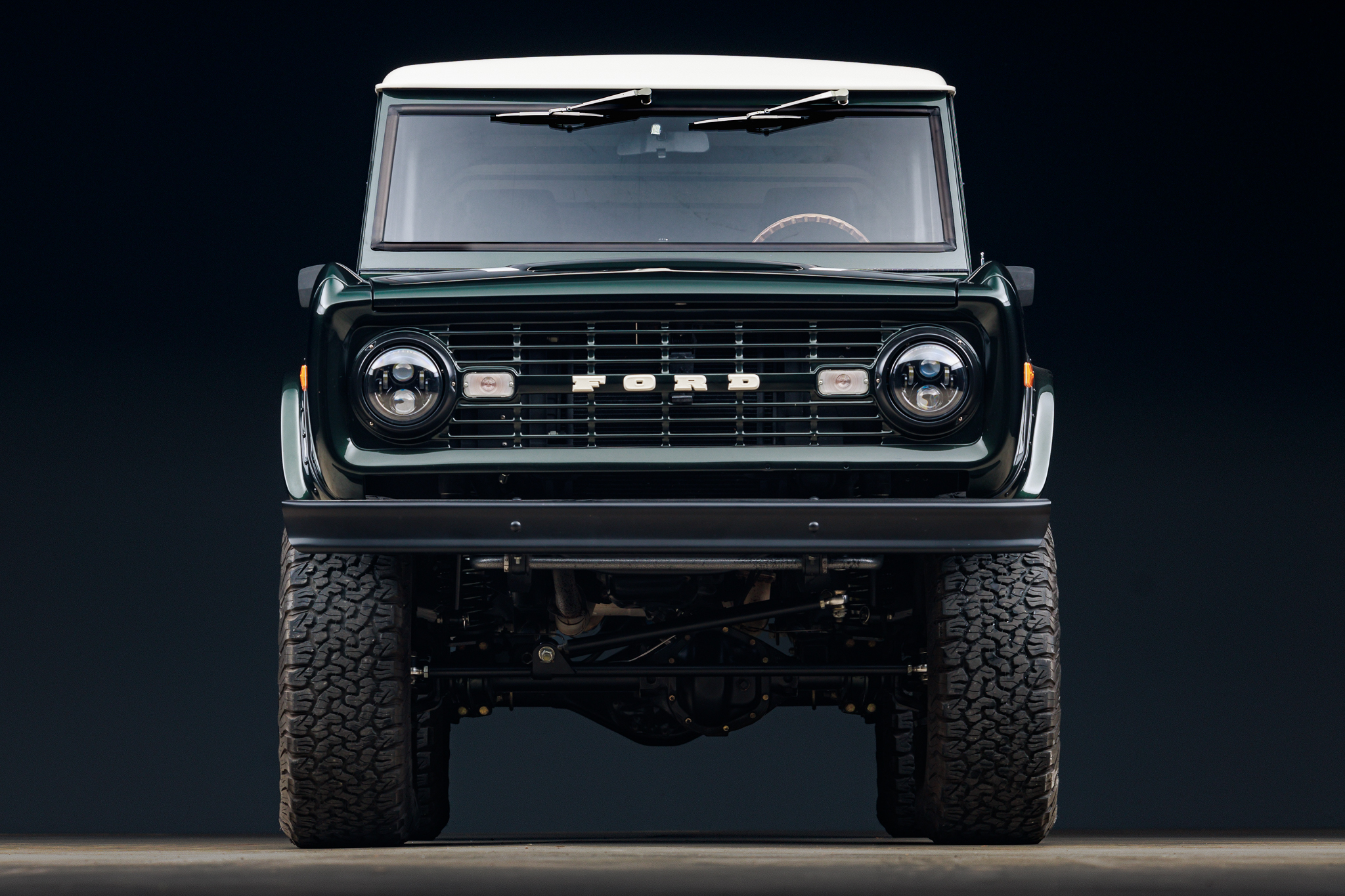 The Pacer 17″ wheels are wrapped in 315/70 BFGoodrich All-Terrain K02 tires. Velocity installed Wilwood hydroboost disc brakes, Warn manually locking front hubs, an electronic parking brake, hydraulic power steering, and Bilstein dampers with a lifted suspension. The front brake pads were replaced in 2020. A power steering leak is noted in an August 2024 service invoice.