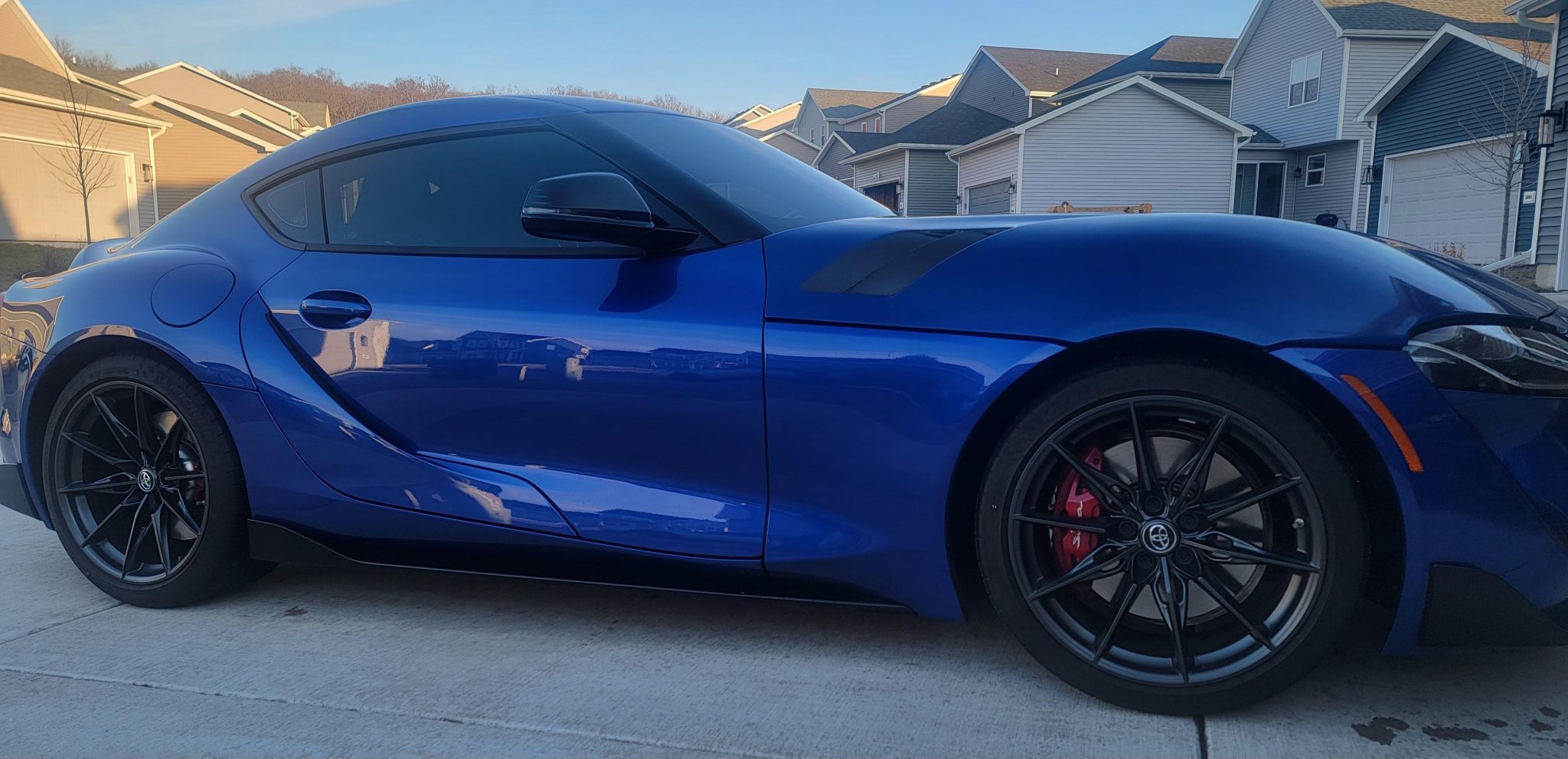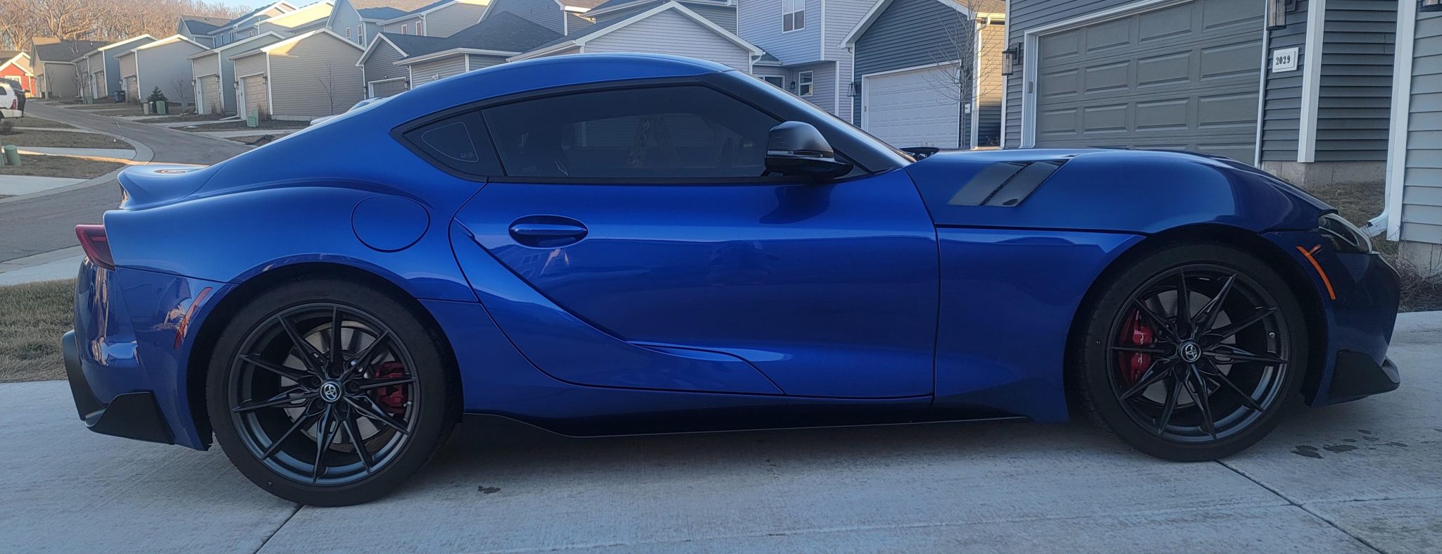 Black-finished 19″ forged aluminum wheels are wrapped in staggered-width Michelin Pilot Super Sport tires. The car rides on an Adaptive Variable Suspension (AVS) system and stopping power is provided by four-wheel disc brakes with Supra-branded Brembo four-piston front calipers.