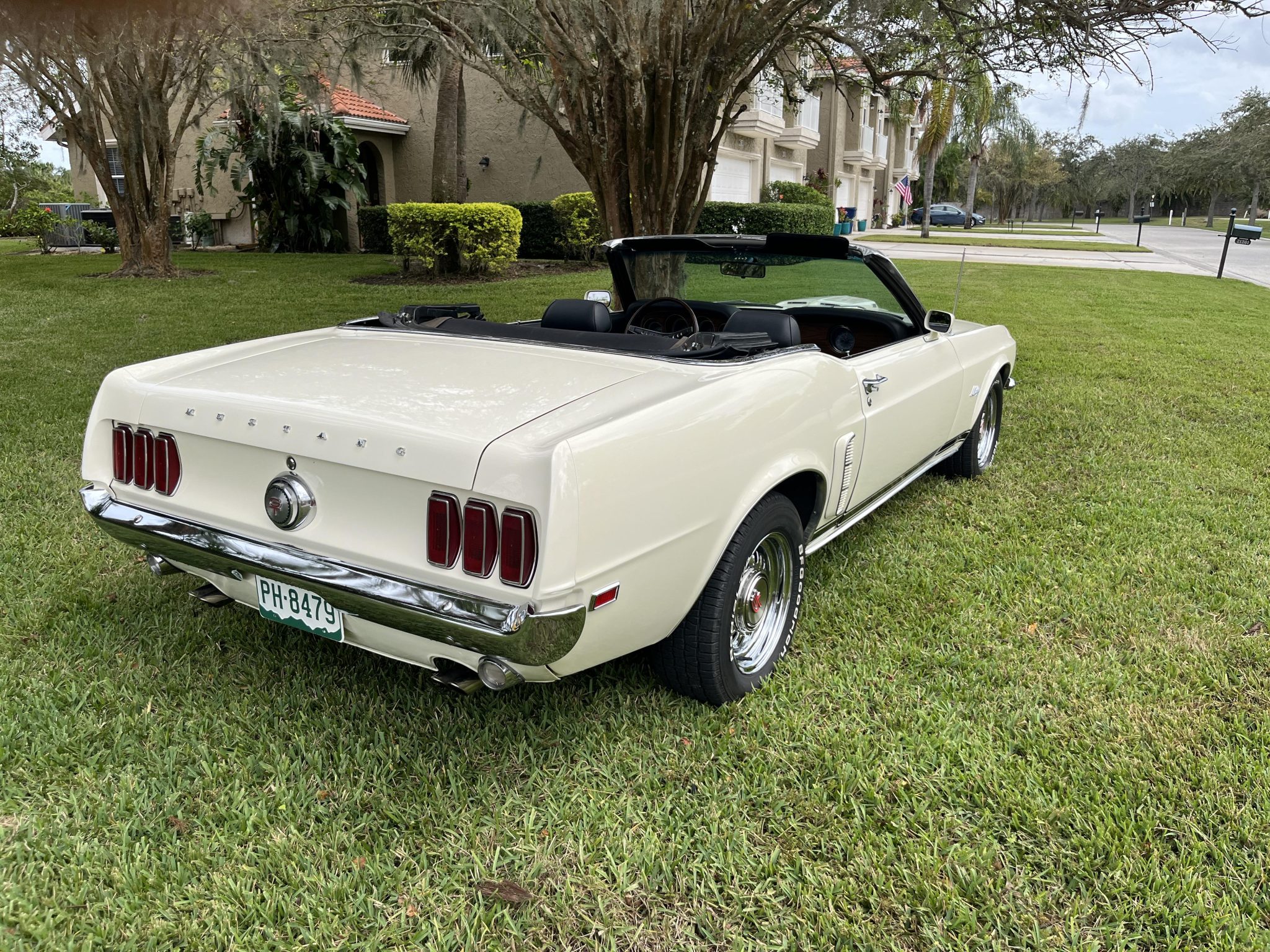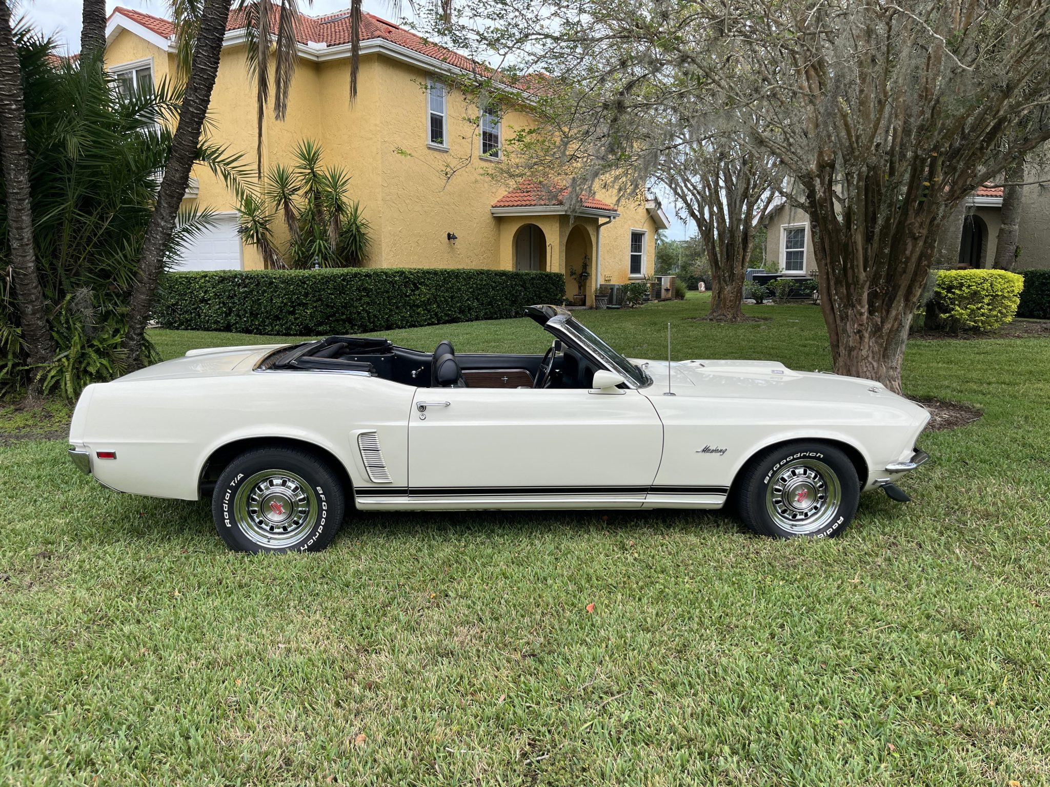 The 15” styled steel wheels have GT center caps and are mounted with BFGoodrich Radial T/A raised white letter tires. The car is equipped with power steering, and braking is handled by power-assisted front discs and rear drums. The seller states that the control arms were lowered 1″.