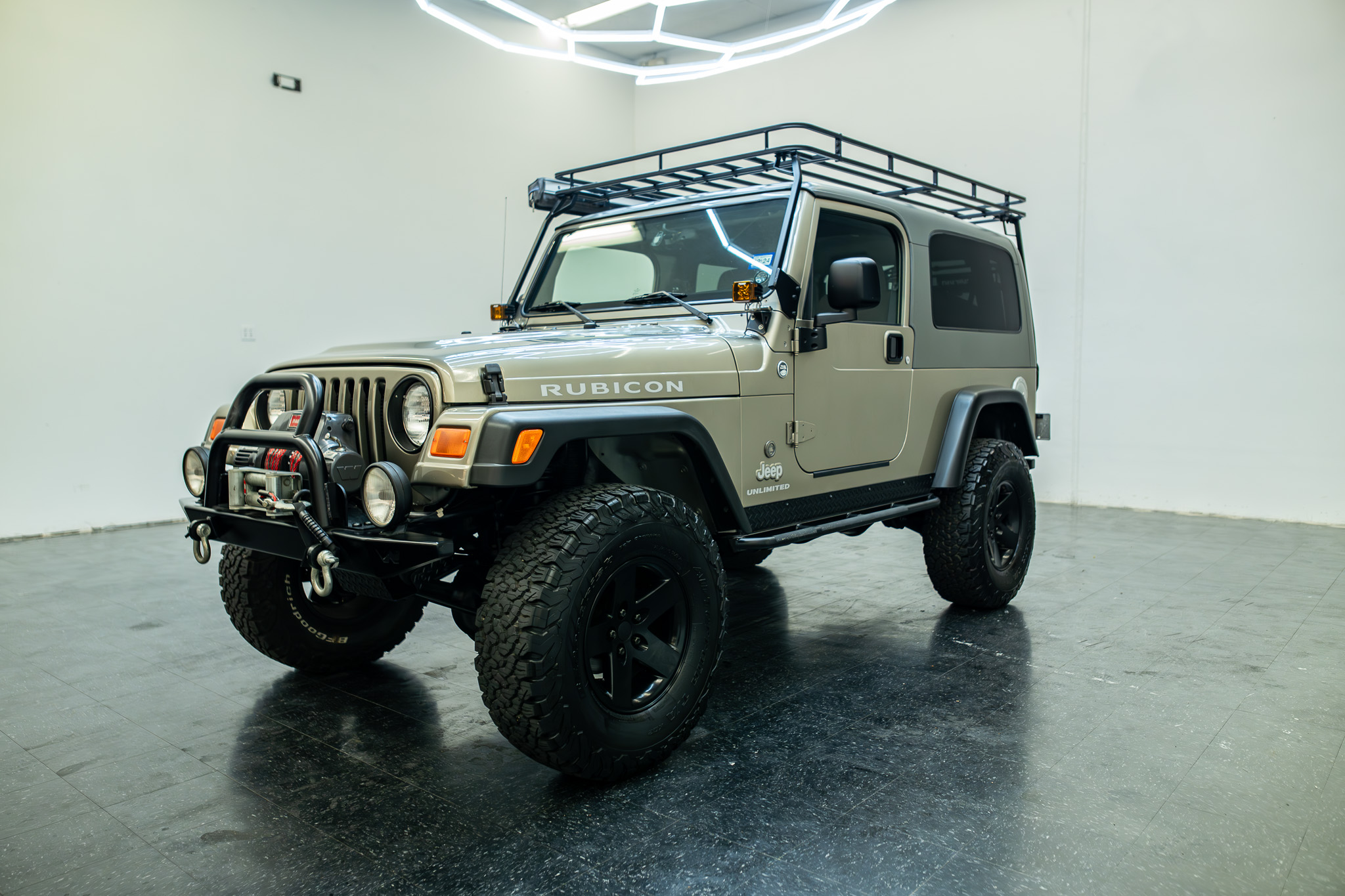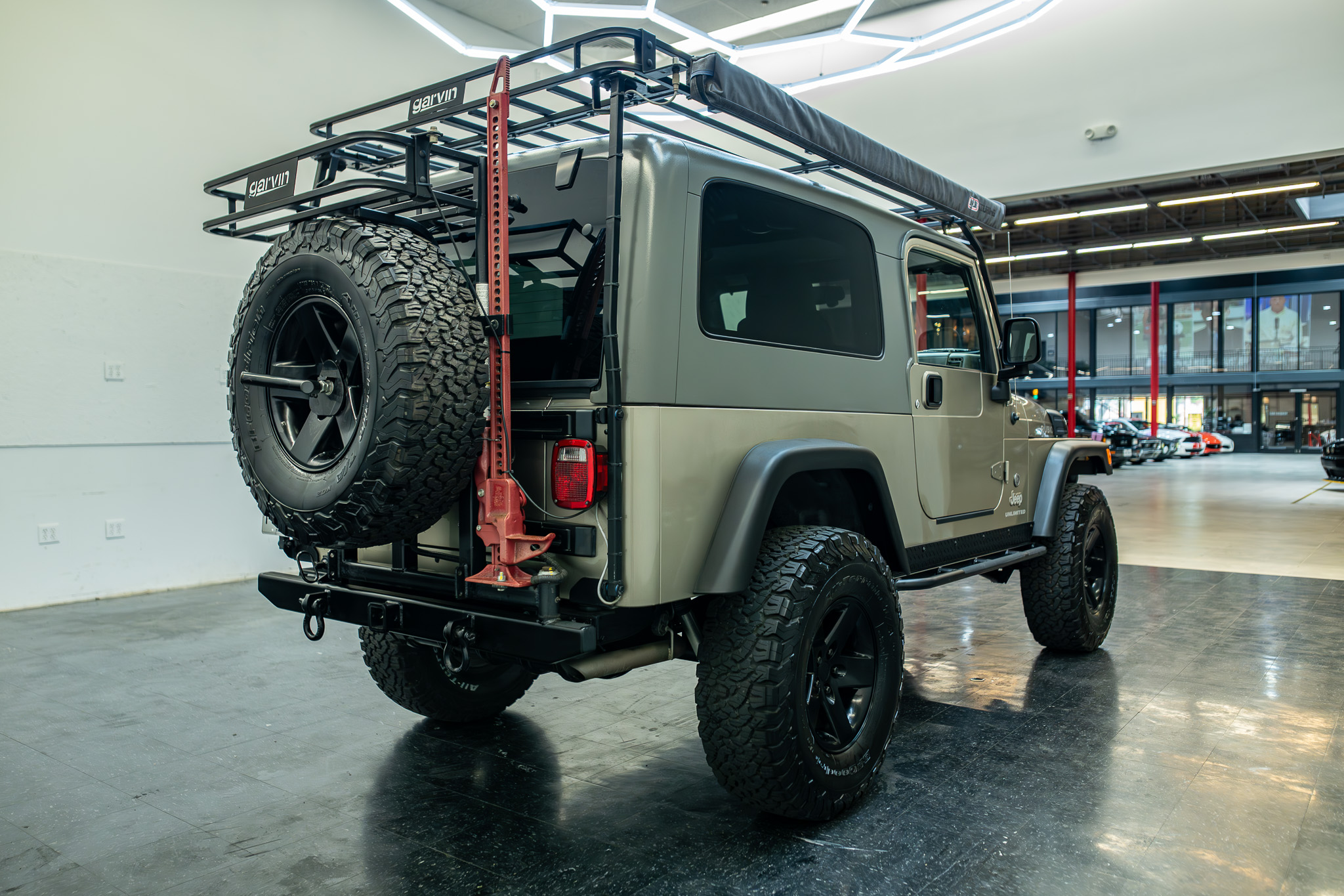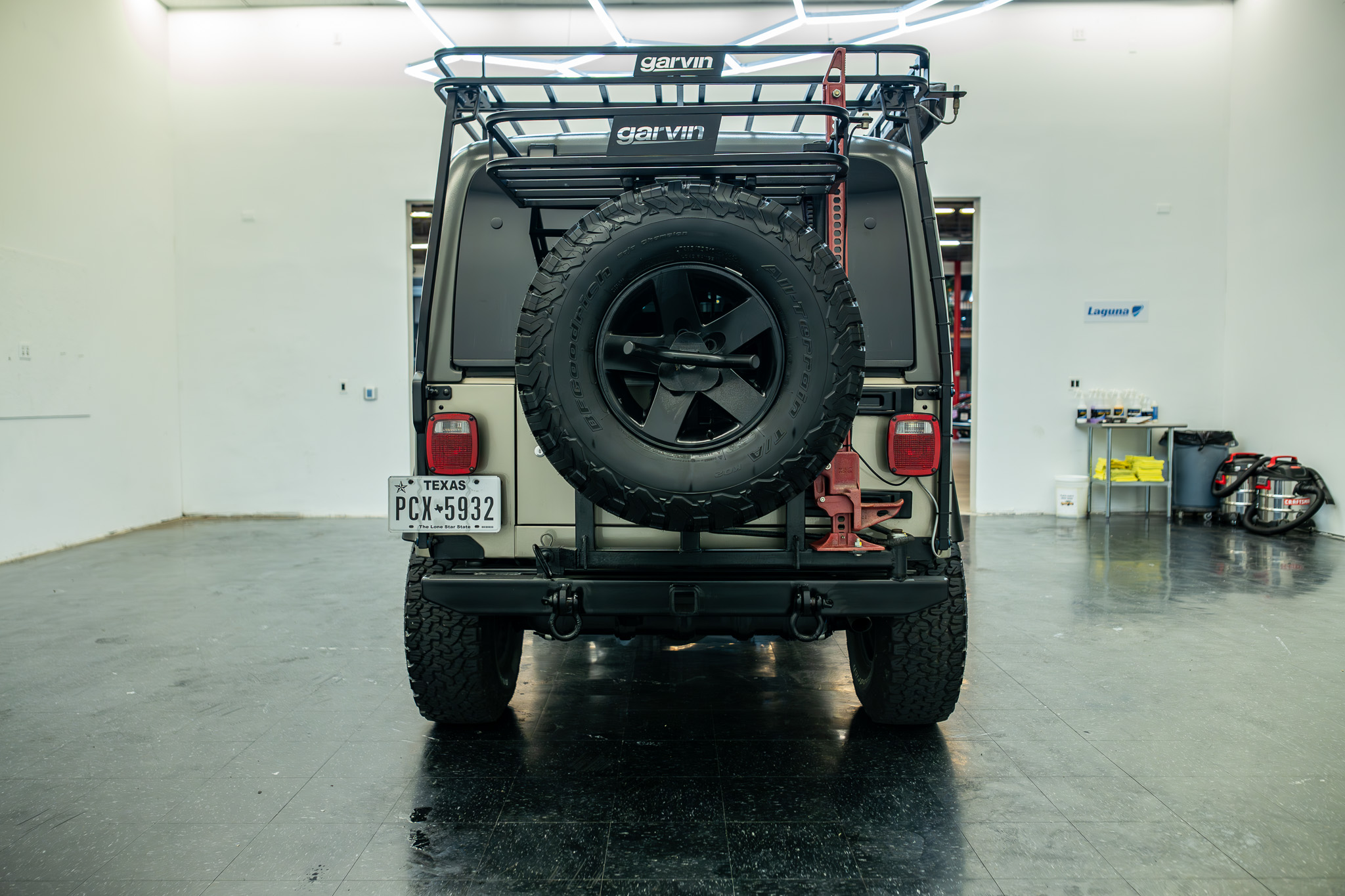 The 16″ MOAB cast-aluminum wheels have been powder-coated black and mounted with 285/75 BFGoodrich All-Terrain T/A K02 tires, and a matching spare is secured at the rear. A Rubicon Express 3″ suspension lift kit with Bilstein shocks has been added along with an Old Man Emu steering stabilizer. Braking is handled by four-wheel discs.