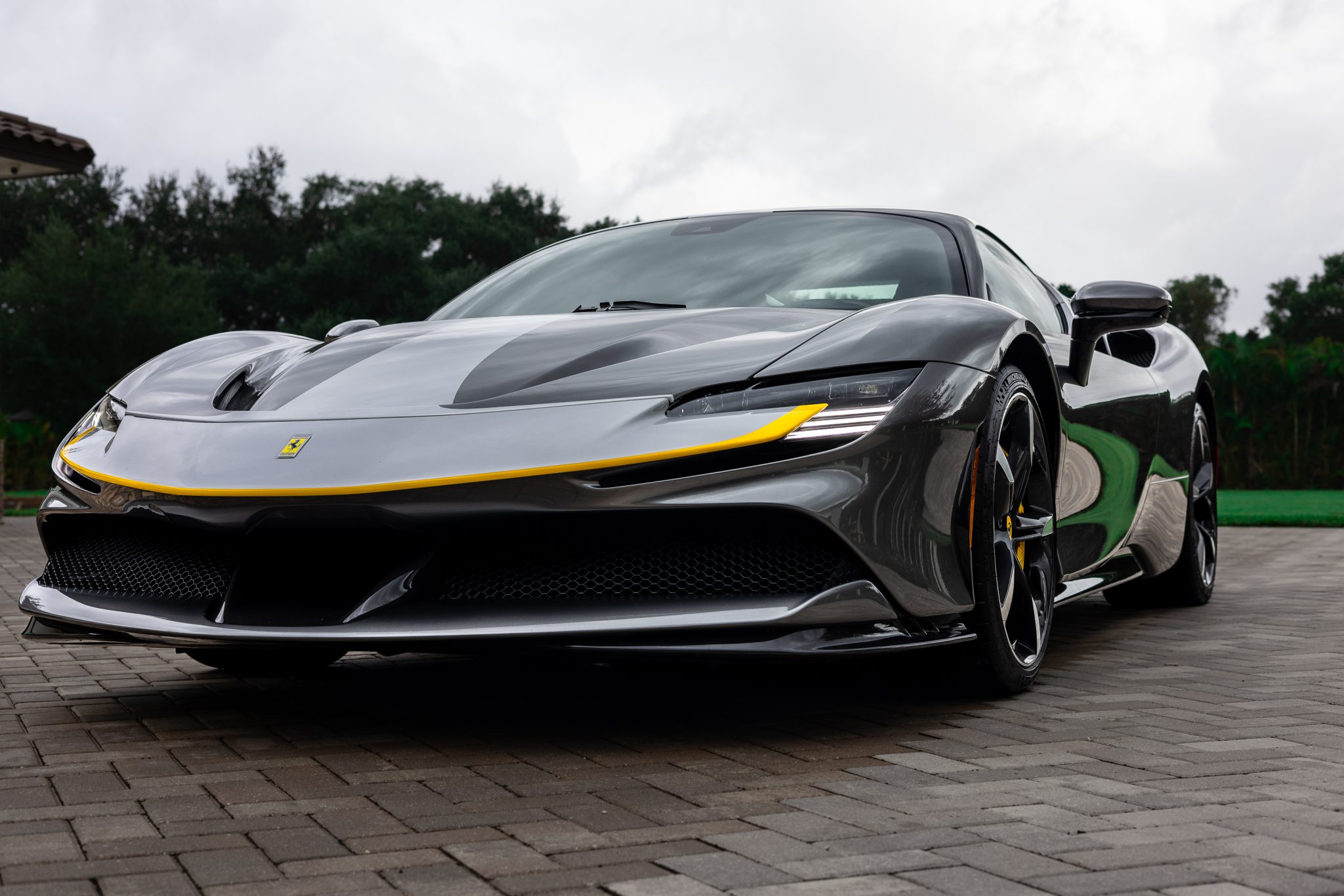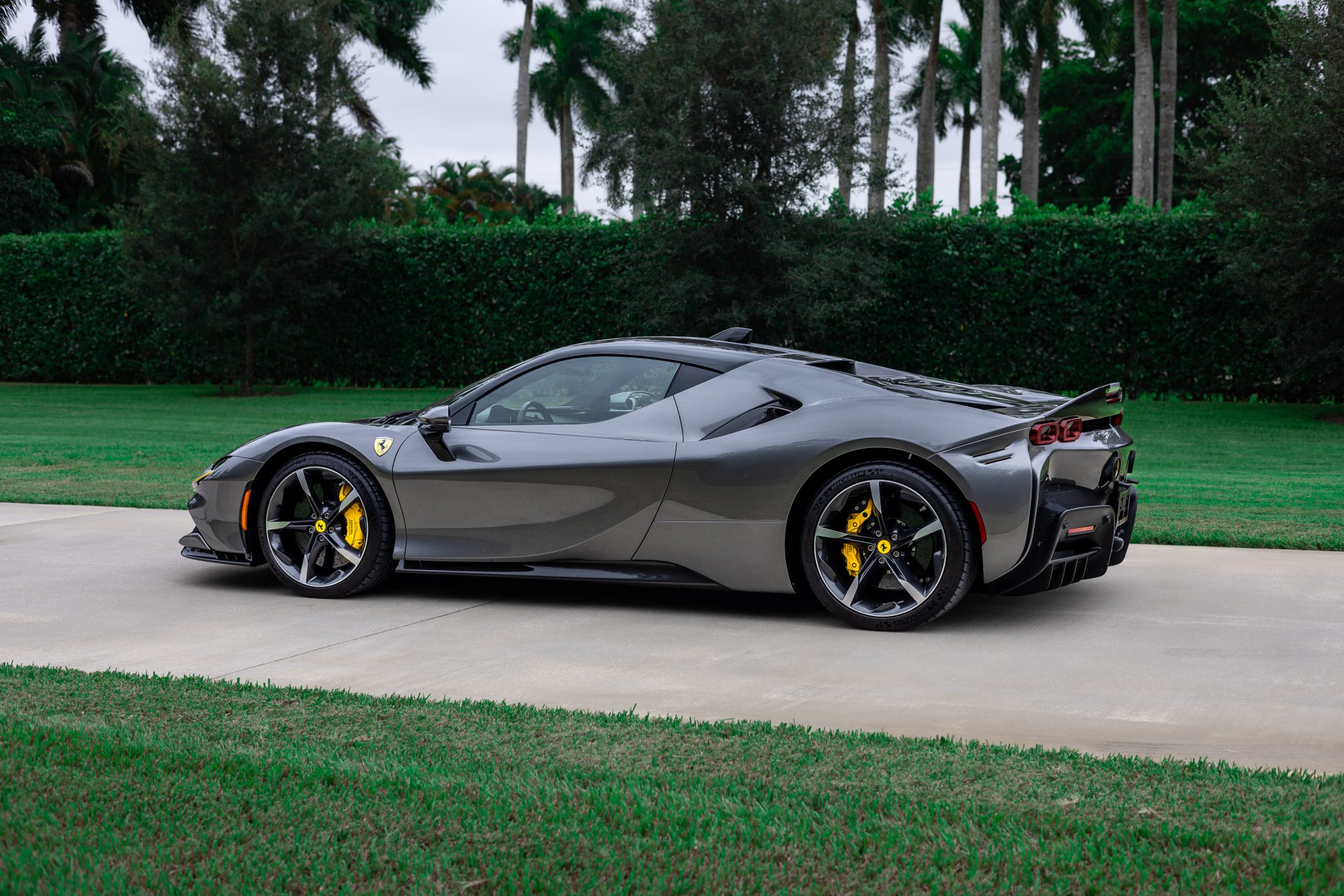 Forged 20″ wheels featuring diamond-finished accents are mounted with Michelin Pilot Sport Cup 2 tires measure 255/35 up front and 315/30 out back, and they are secured with titanium wheel stud bolts. The SF90 Stradale features an aluminum chassis, and Multimatic-sourced shocks and titanium springs were included as part of the Assetto Fiorano package. The electronic Side Slip Control (eSSC) and electric traction control (eTC) systems distribute torque to each individual wheel. The regenerative brake system splits stopping force between the hydraulic system and the electric motors. Yellow-finished calipers over carbon-ceramic rotors are fitted at all four corners. A brake fluid flush was performed in July 2023.