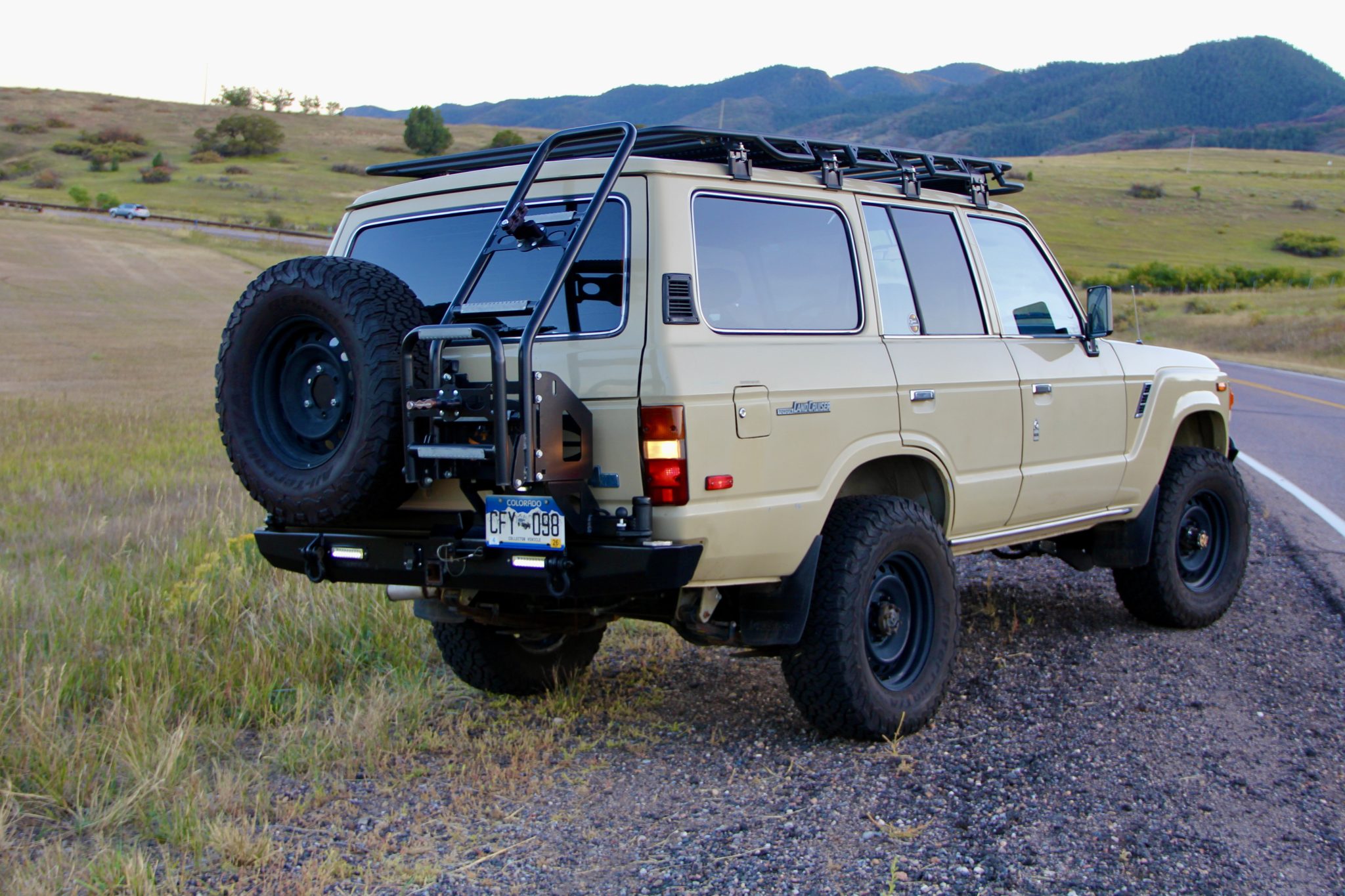 Black 17″ steel wheels are mounted with BFGoodrich tires. The truck has been fitted with a 3″ Old Man Emu suspension lift, Delta radius arms, and four-wheel disc brakes.