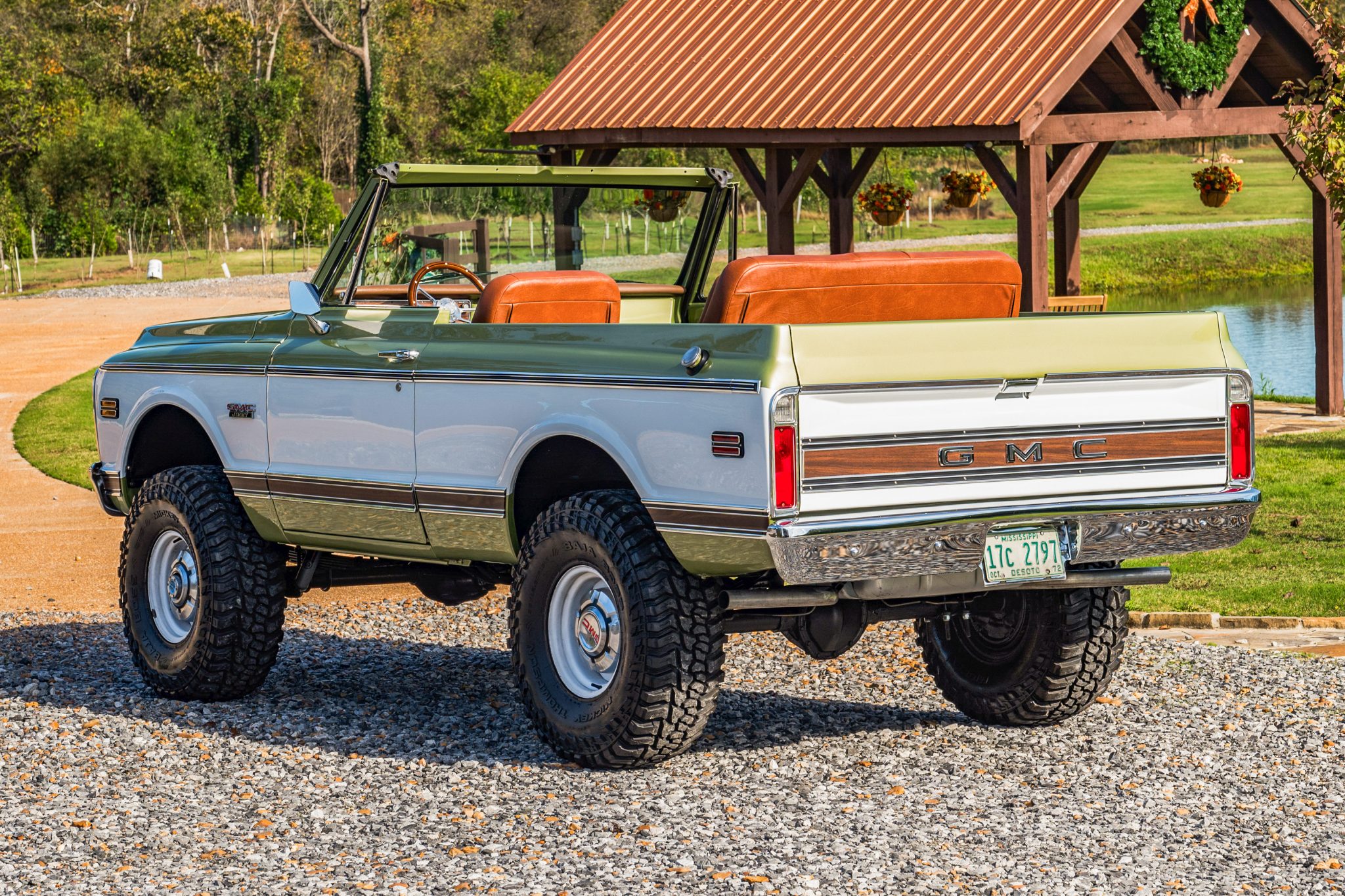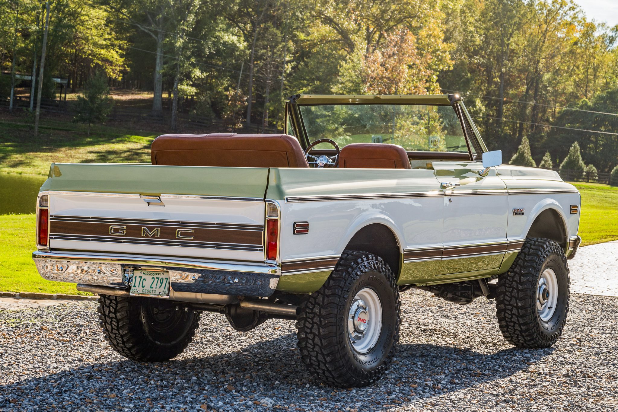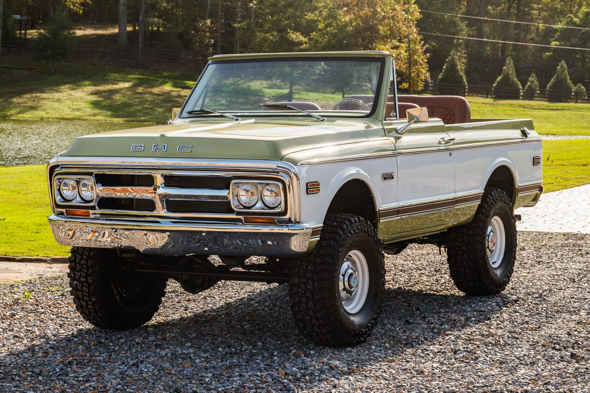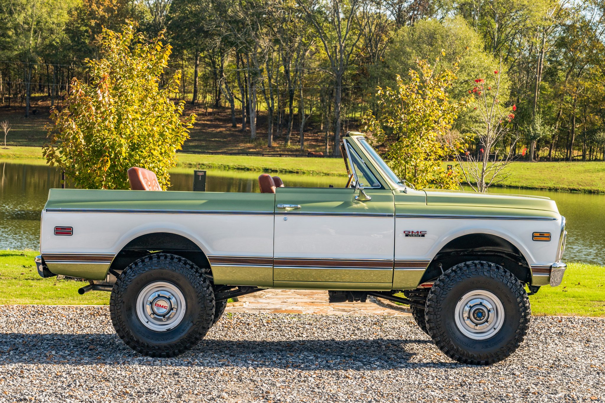 The 15″ steel wheels are mounted with 35×12.5″ Mickey Thompson Baja Boss tires. The truck is equipped with power steering, and stopping power is provided by power-assisted front discs and rear drums. A 4″ Rough Country suspension lift was installed and the wheels were replaced during the refurbishment.