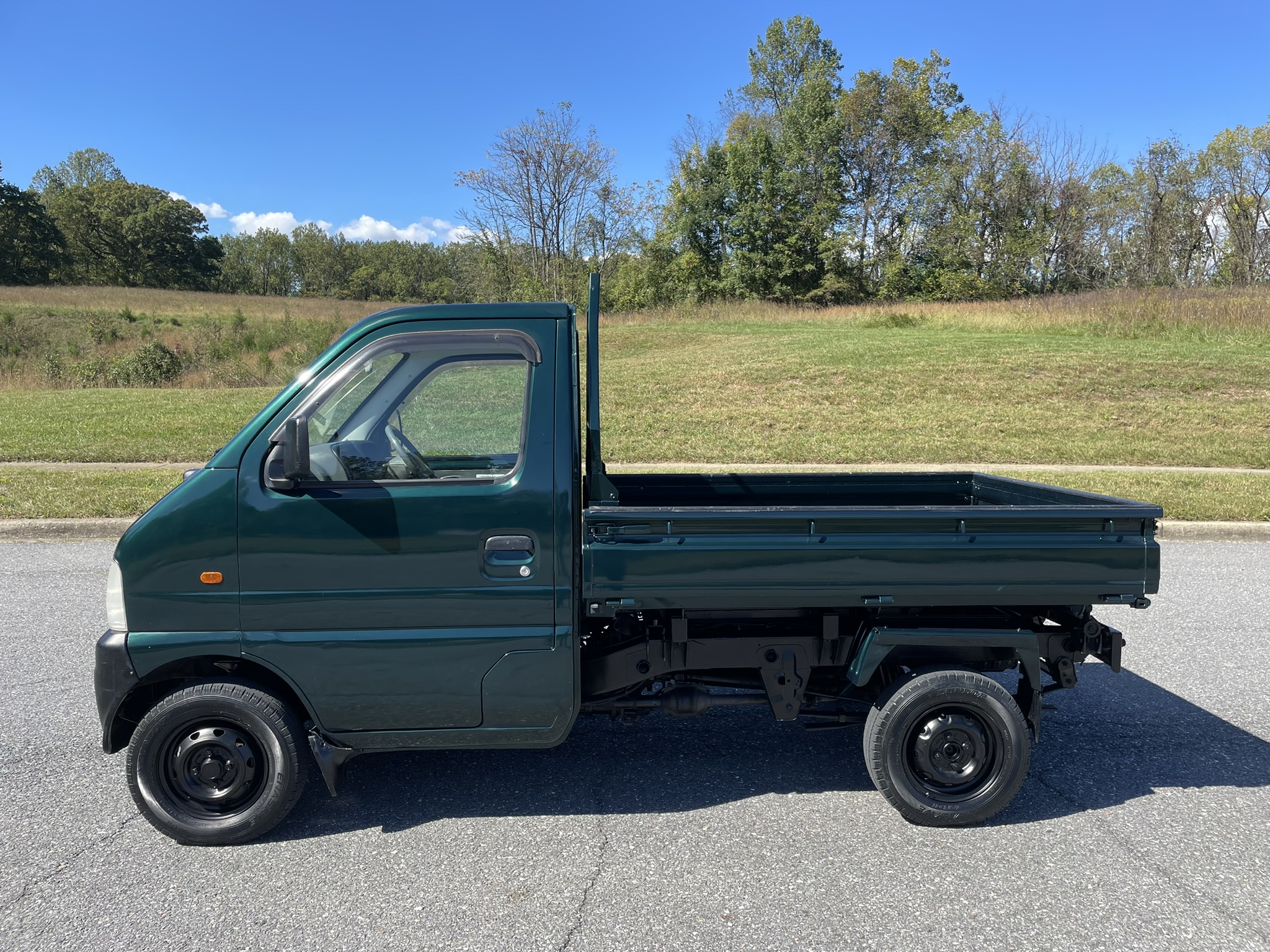 Black 12″ steel wheels are mounted with 145-series Dunlop Enasave tires that were manufactured in 2019. Braking is handled by front discs and rear drums.