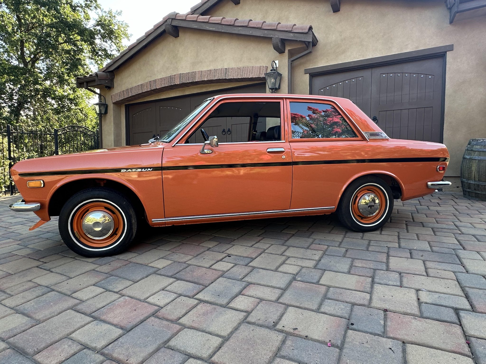 Body-color 13″ steel wheels wear polished hubcaps and are mounted with older 165/80 Dayton Quadra whitewall tires. Braking is handled by front discs and rear drums. The rear wheel cylinders were replaced and the brake fluid was flushed in preparation for the sale.