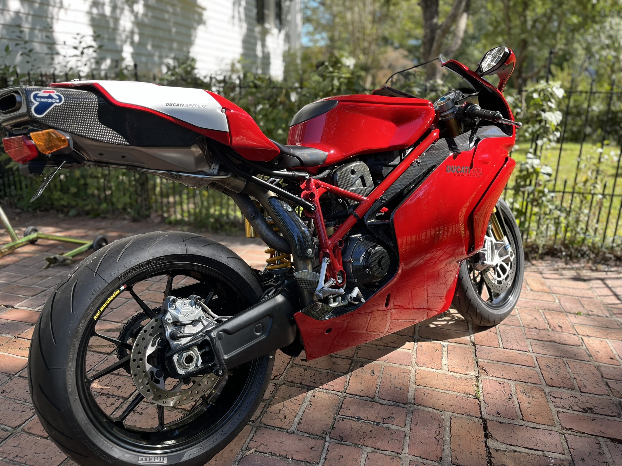 Marchesini 17″ forged alloy wheels are finished in black and wrapped in Pirelli Diablo Rosso III tires. Adjustable Öhlins suspension consists of an inverted 43mm fork with titanium nitride-coated stanchions in addition to a piggyback monoshock attached to the swingarm via progressive linkage. Braking is provided by radially mounted four-piston Brembo calipers fitted over dual 320mm discs up front and a two-piston caliper mounted over a single 240mm disc at the rear. The right fork seal is noted to leak.