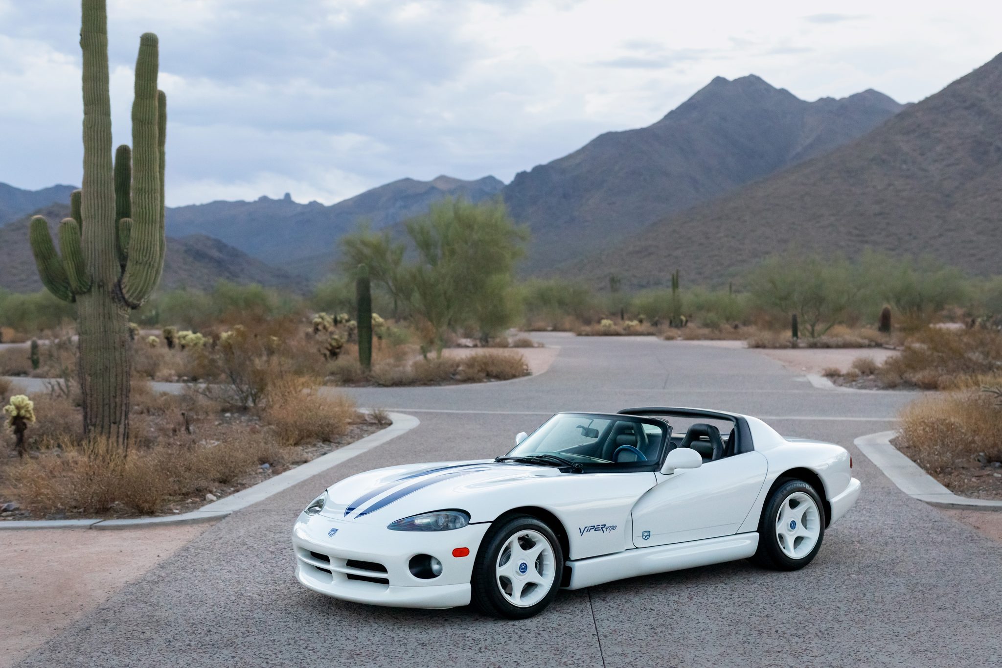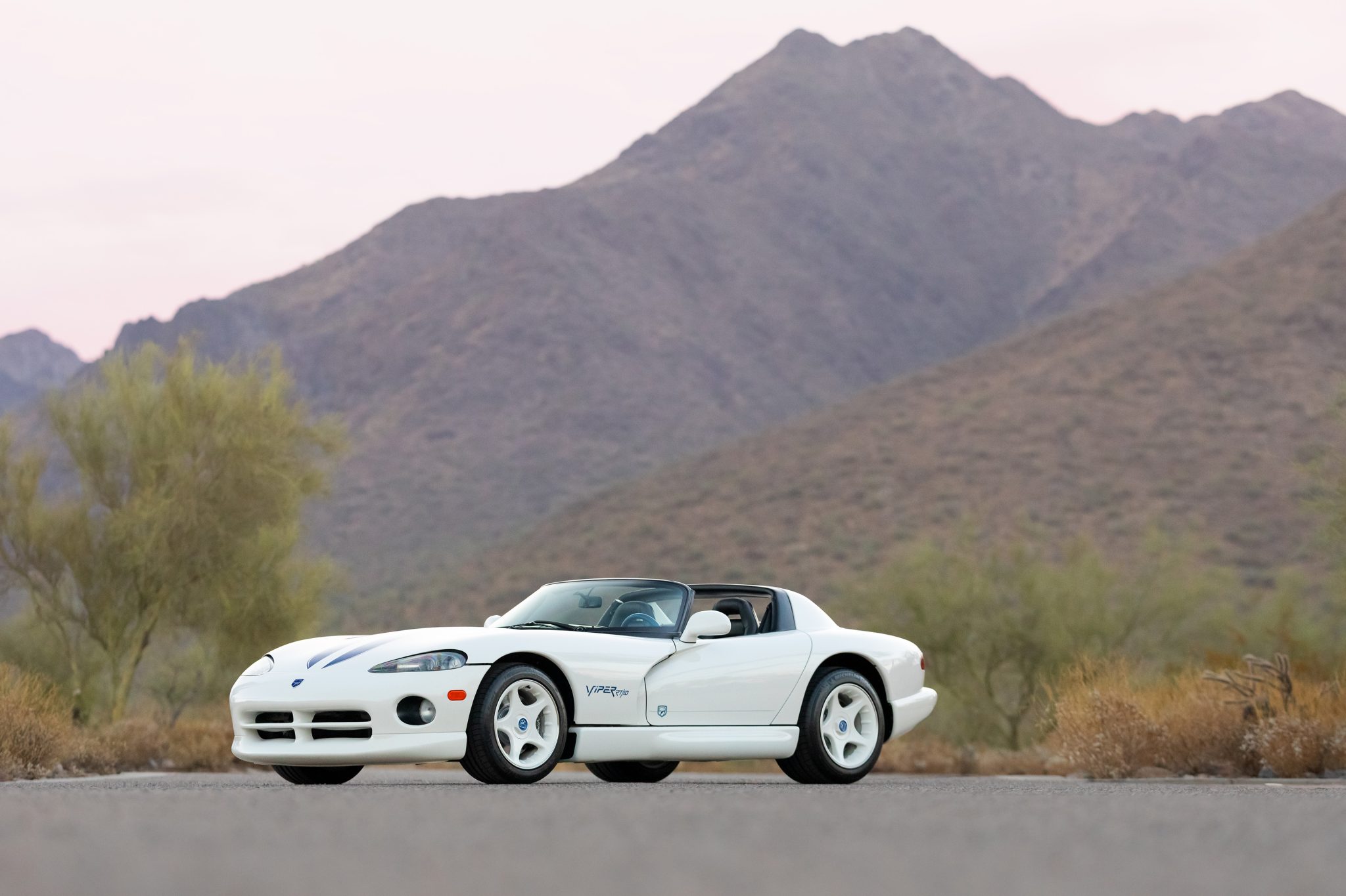 The 17″ five-spoke alloy wheels are mounted with Michelin Pilot Sport tires, which show date codes from 2021. The RT/10 is equipped with power-assisted rack-and-pinion steering, four-wheel independent suspension, and four-wheel vented disc brakes with Viper-branded calipers up front. 1996 models were not equipped with ABS.