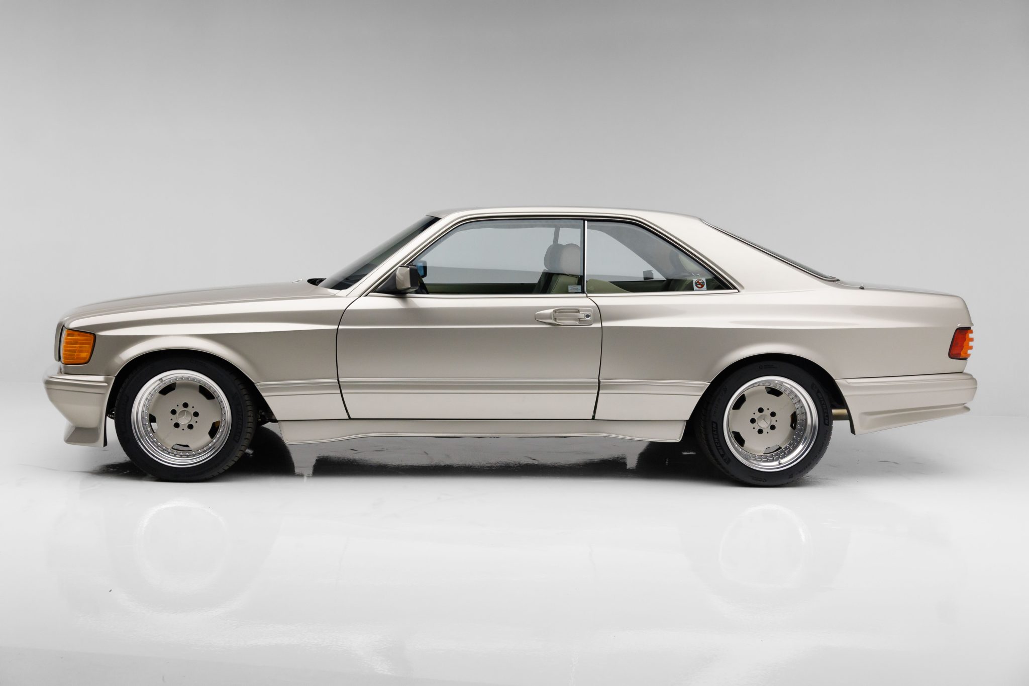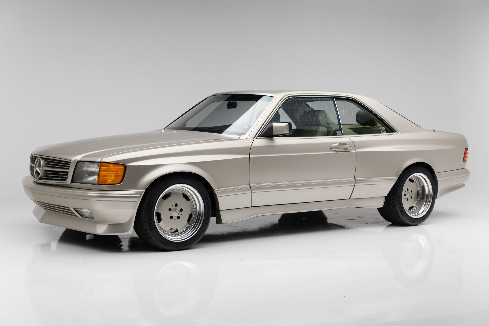 Custom-fabricated 17″ AMG-style three-piece wheels are mounted with 275/40 and 315/35 Michelin Pilot Sport All Season 4 tires manufactured in 2022 and 2023. The suspension was modified by Bespoke and a big brake kit has been installed.