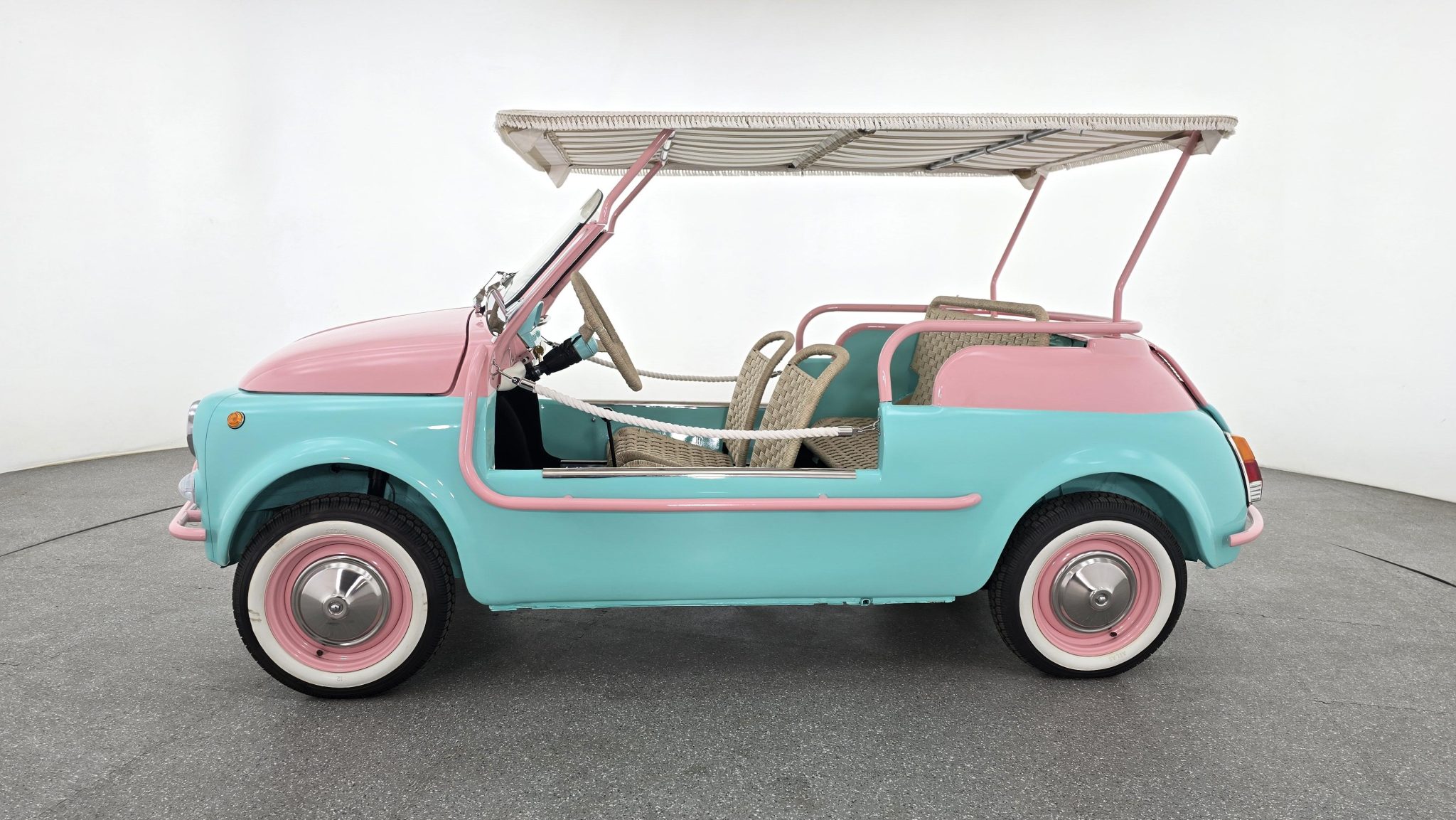The 12″ wheels have bright covers, while the Deestone tires are trimmed with whitewall inserts, and a matching spare is stored in the front trunk. Replacement brake hoses, drums, shoes, and wheel cylinders are noted.