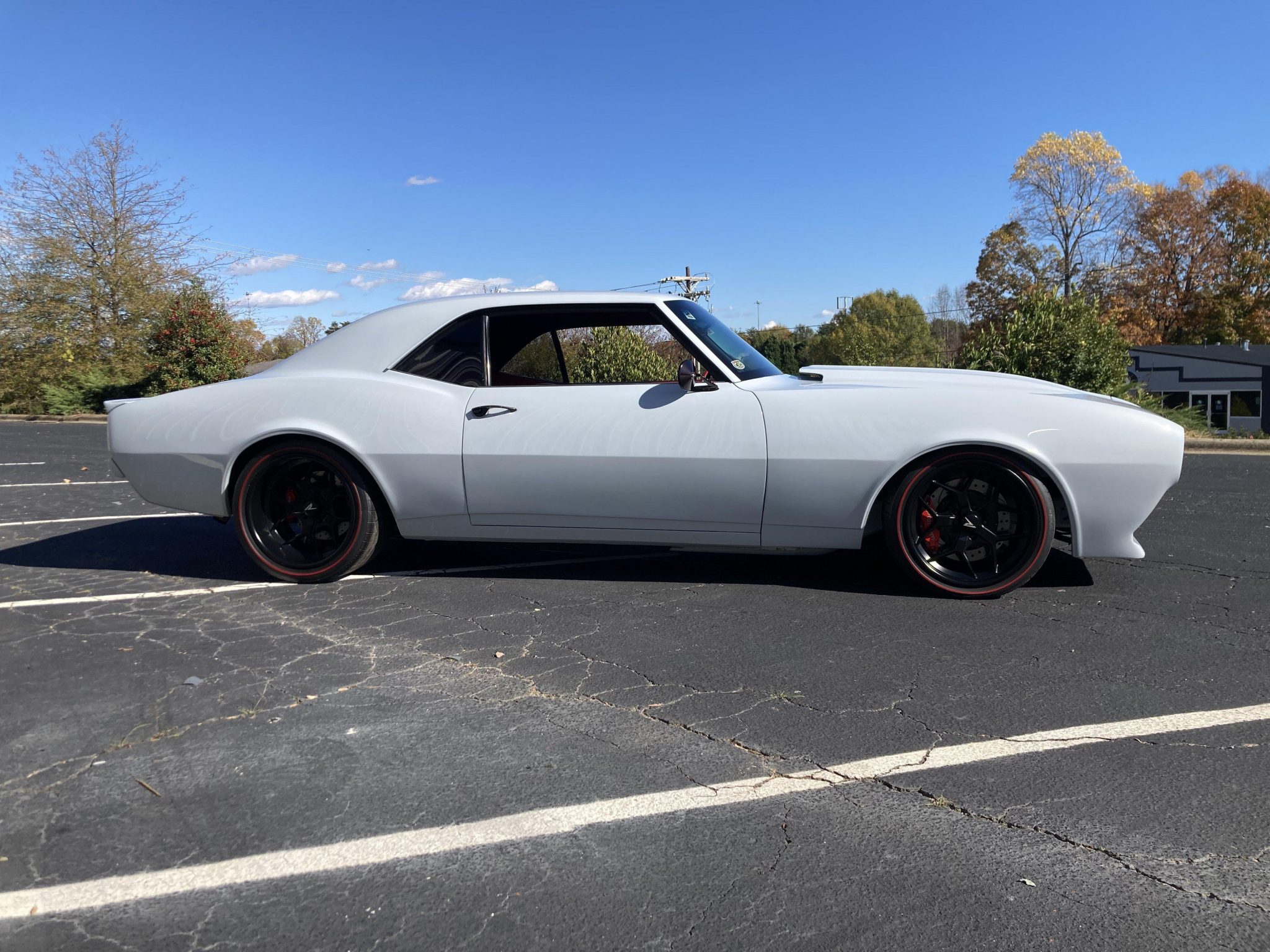 Rushforth 18″ forged alloy wheels are finished in black and mounted with 255/35 front and 315/30 rear Michelin Pilot Sport redline tires. Suspension consists of tubular control arms with QA1 adjustable coilovers up front and a RideTech four-link setup with adjustable coilovers out back. Ridetech subframe connectors are installed along with rack-and-pinion steering, and braking is handled by four-wheel discs fitted with red-finished Wilwood calipers.