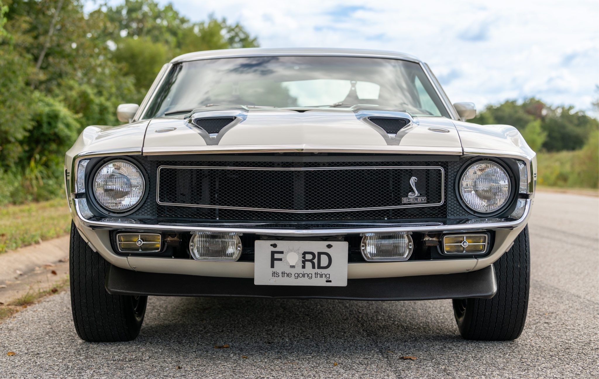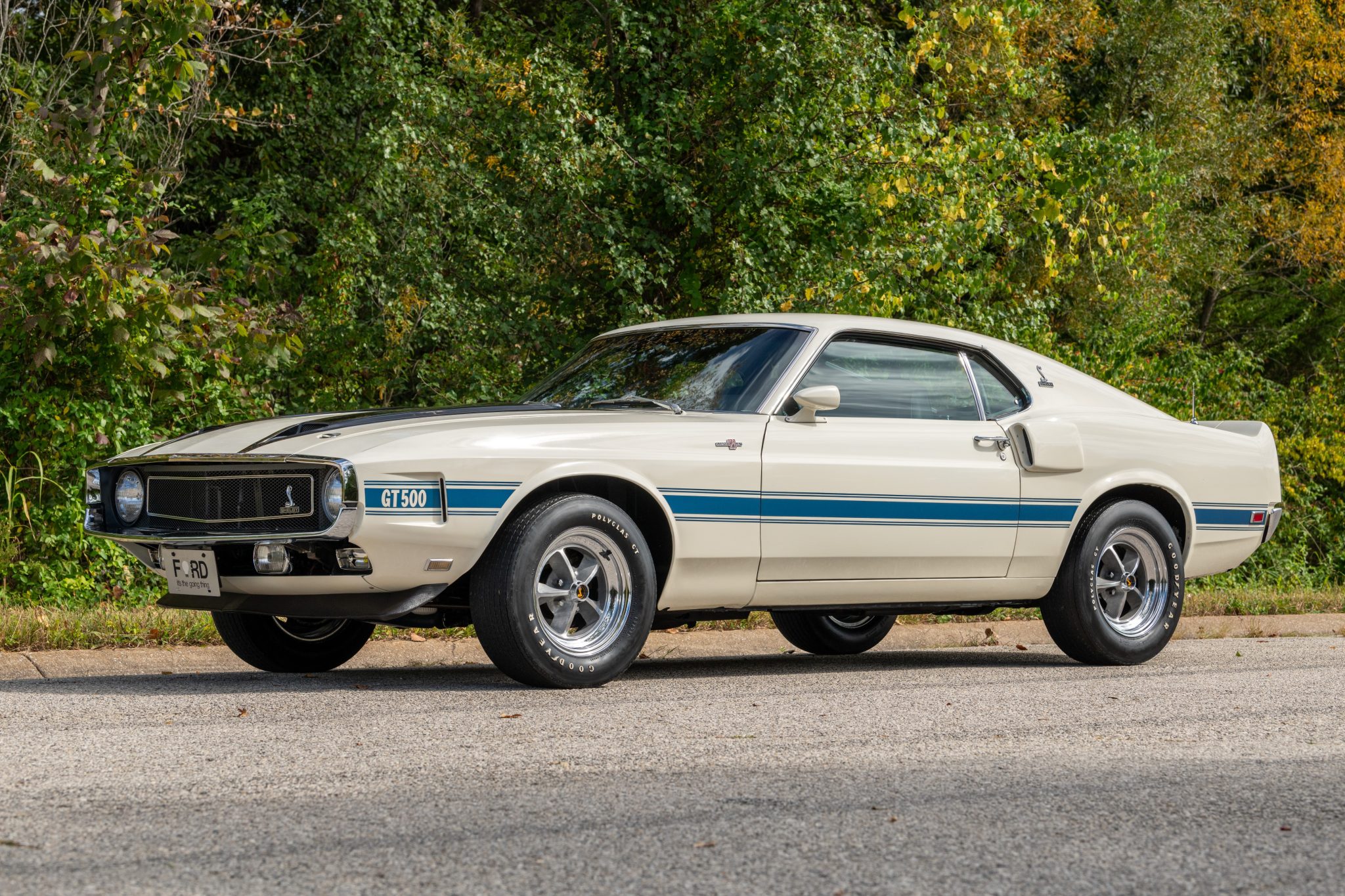 Gray 15″ five-spoke Shelby wheels feature polished lips and black Shelby center caps, and they are mounted with an older set of F60-15 Goodyear Polyglas tires. The car is equipped with power steering, and stopping power is provided by power-assisted front discs and rear drums.