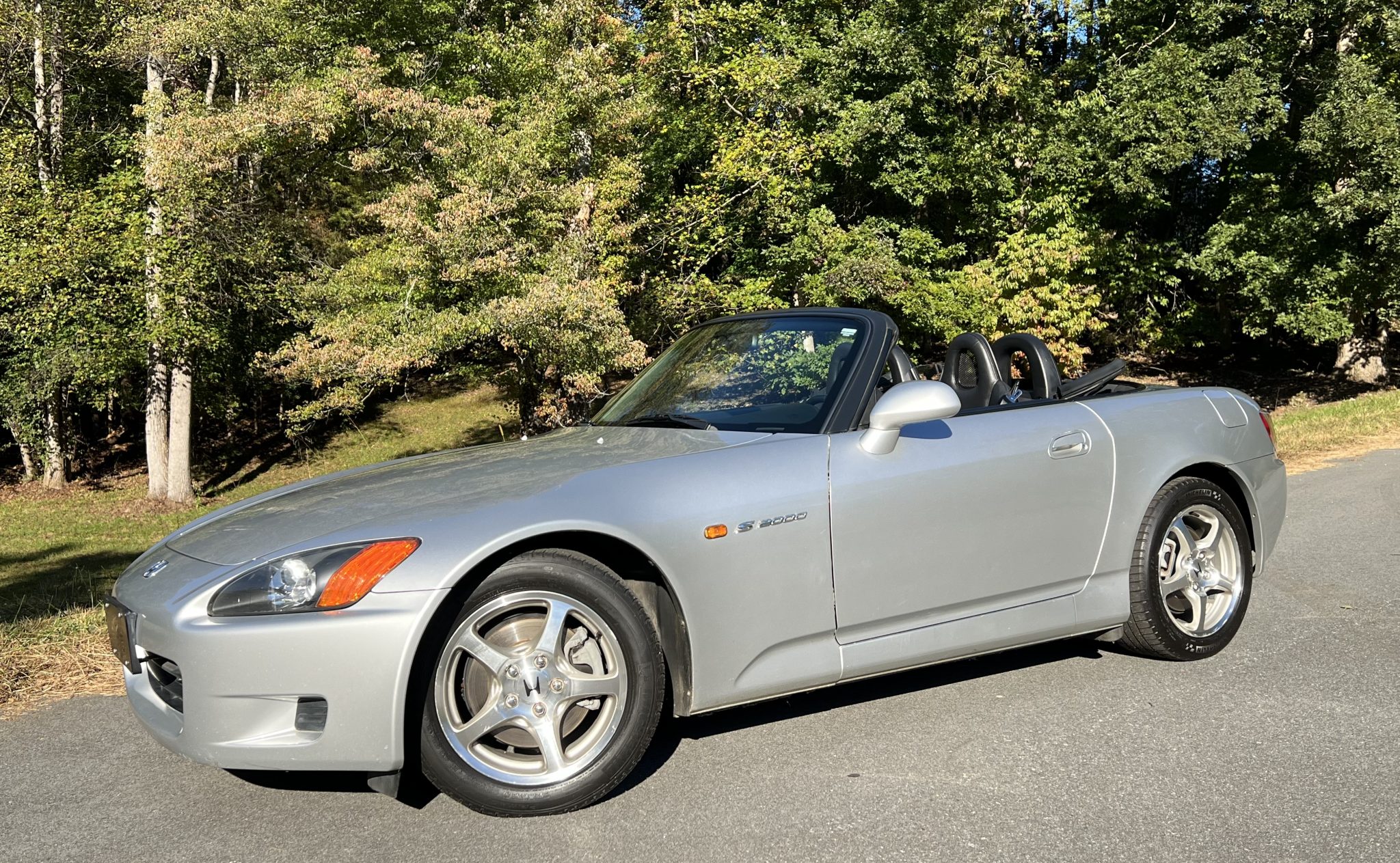 The 16″ five-spoke alloy wheels are mounted with mismatched Michelin tires, which show date codes from 2012 and 2018. The car features double-wishbone suspension and four-wheel disc brakes. The power steering module was replaced and the brake fluid was flushed in October 2023.