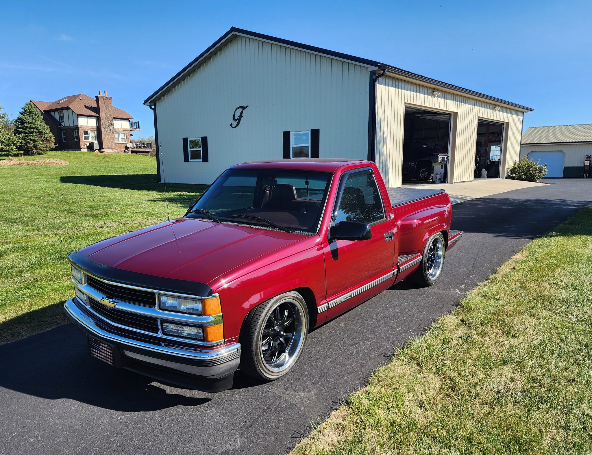 Aftermarket 20″ Ridler wheels feature black centers and are mounted with Toyo Proxes tires. A Belltech suspension lowering kit has been added, and braking is provided by power-assisted front discs and rear drums.
