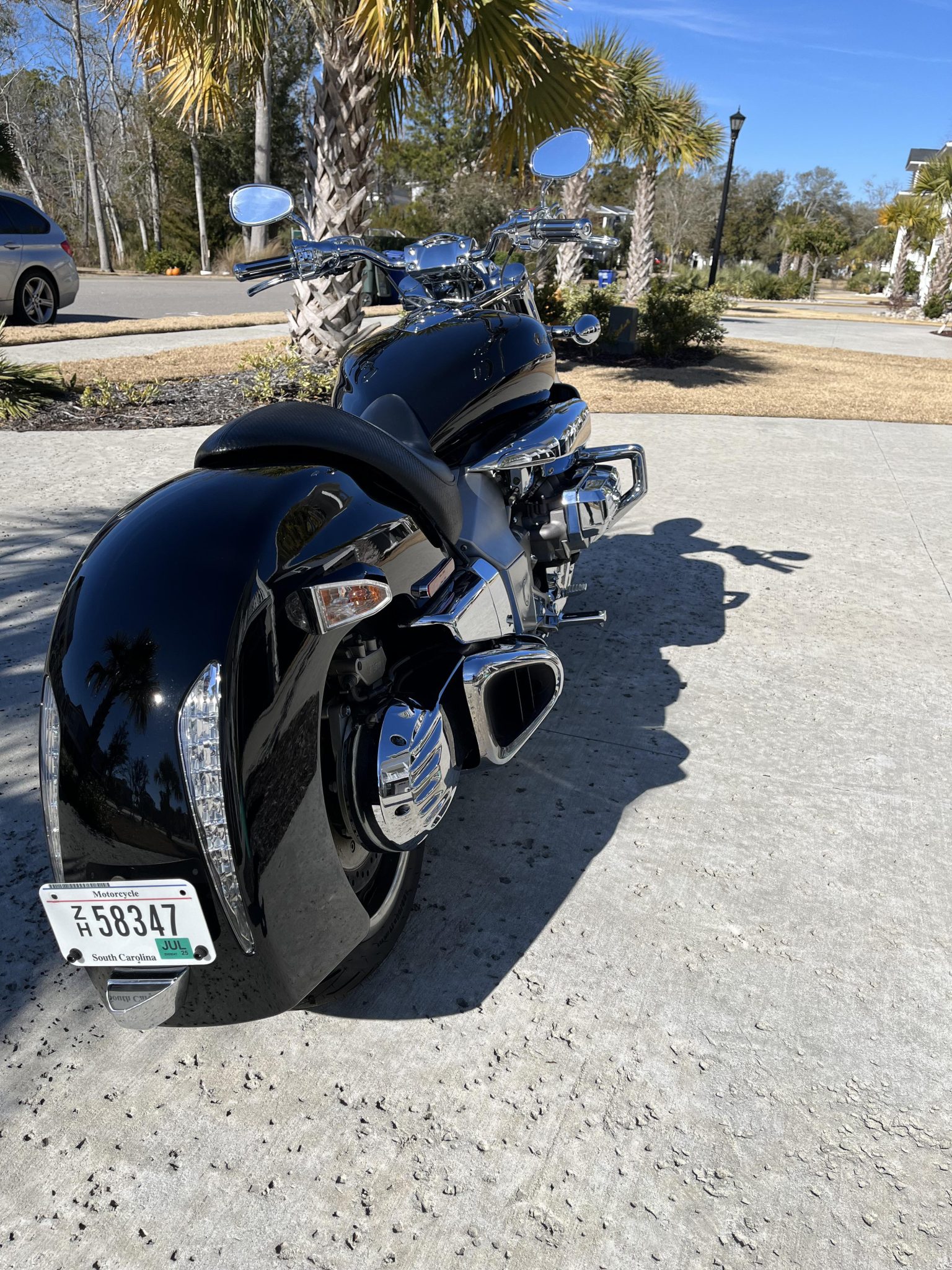 Five-spoke aluminum wheels measuring 18″ up front and 17″ out back were mounted with Dunlop tires in 2024. Suspension consists of a chrome-finished trailing-link fork along with a remote-reservoir monoshock that is attached to the single-sided swingarm via a Unit Pro-Link linkage. Braking is handled by Nissin three-piston calipers mounted over a pair of drilled rotors up front as well as a two-piston Nissin caliper fitted over a drilled rotor at the rear. A May 2024 service consisted of rebuilding the rear brake master cylinder and flushing the brake fluid. A scratch is visible on the rear wheel.