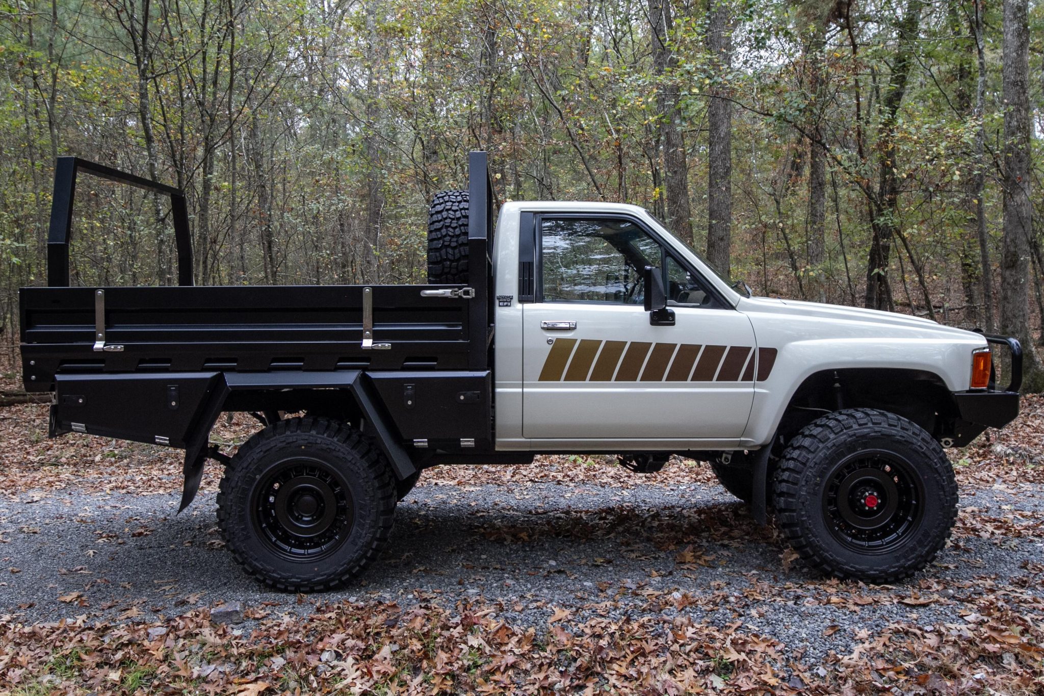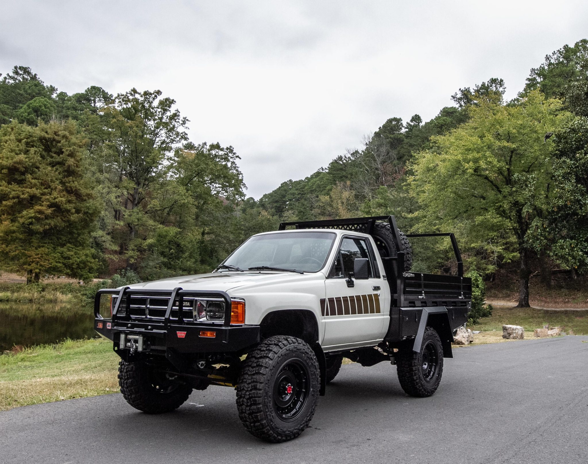 The Nomad 17″ alloy wheels are mounted with 33×10.50″ Kenda Klever M/T tires. The suspension is lifted 2.5″ with Ironman 4×4 components, and the seller states that Aisin manually locking front hubs, Sankei 555 tie rod ends, and an Ironman 4×4 relay rod were installed in 2023 along with 3.0L 4Runner-specification brake calipers with braided stainless-steel lines.