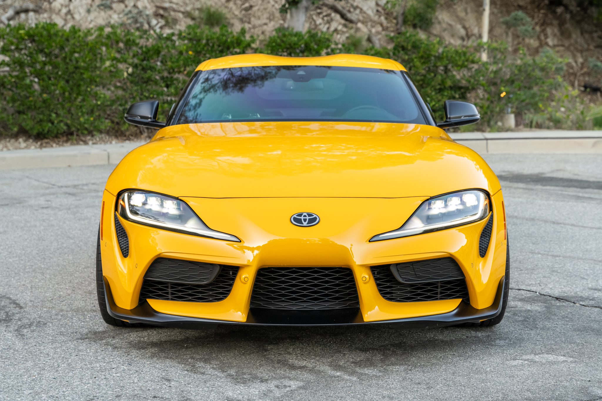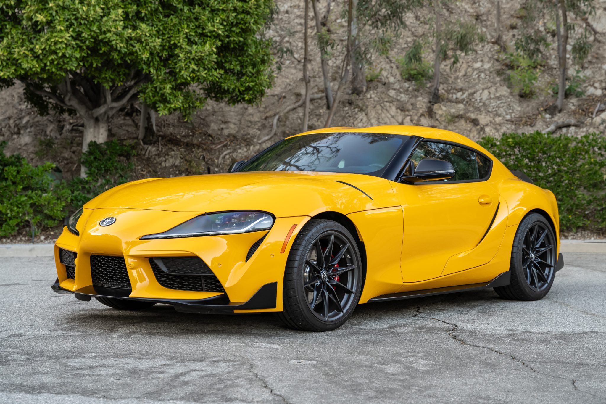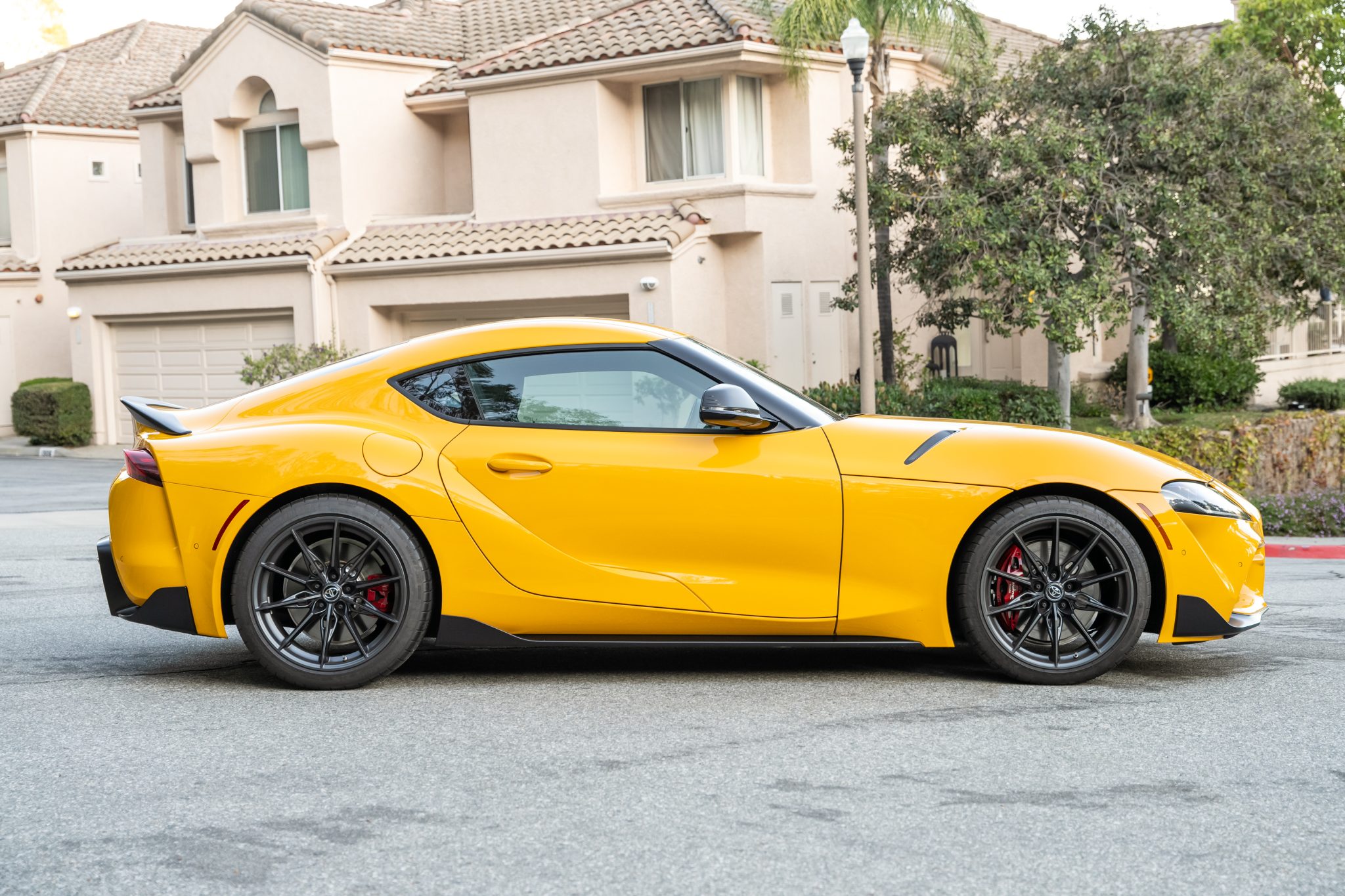 Gunmetal-finished 19″ forged aluminum wheels are mounted with 255/35 front and 275/35 rear Michelin Pilot Super Sport tires. Wheel spacers have been retrofitted under current ownership. The car rides on an Adaptive Variable Suspension (AVS) system and stopping power is provided by four-wheel disc brakes with Supra-branded four-piston Brembo front calipers.