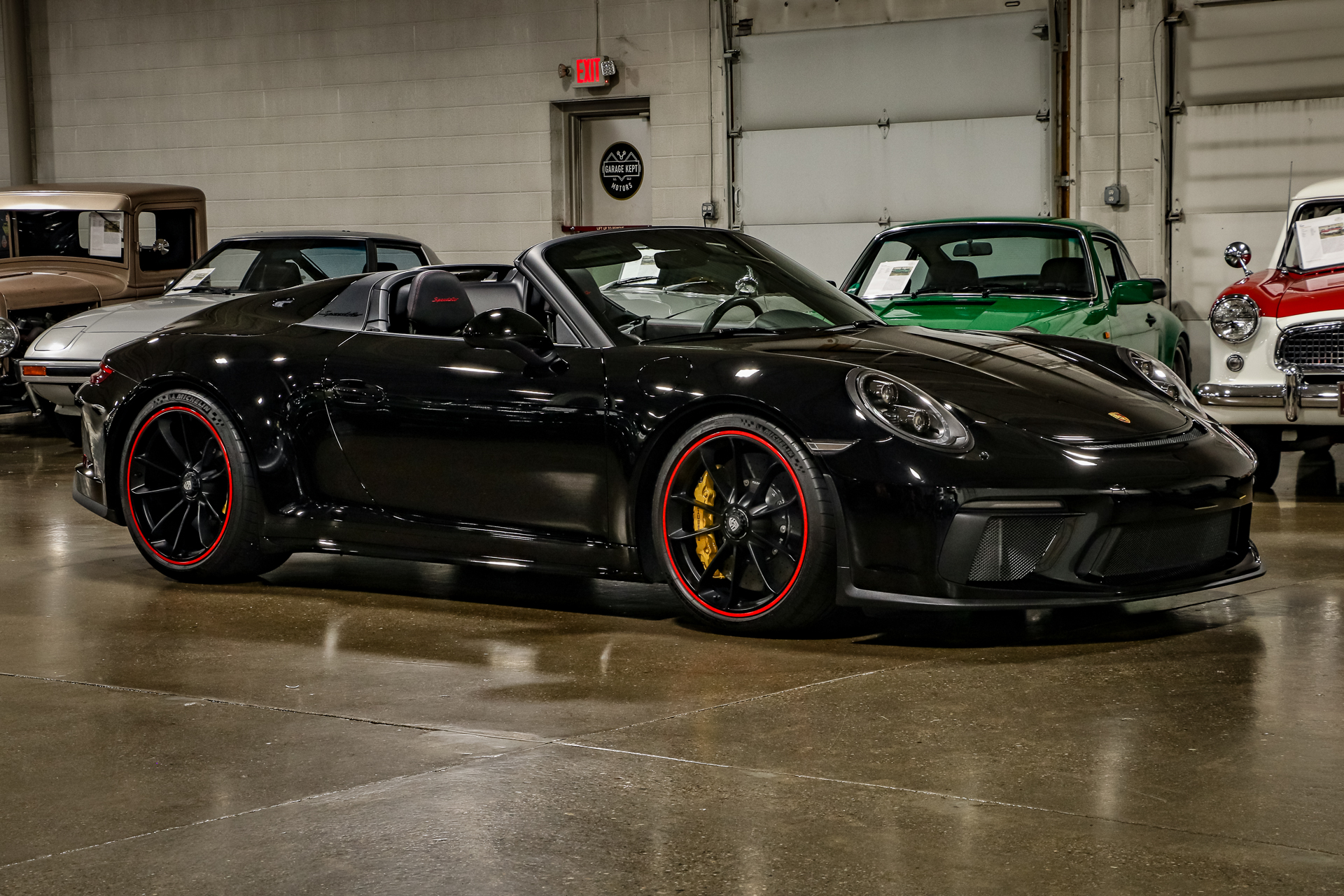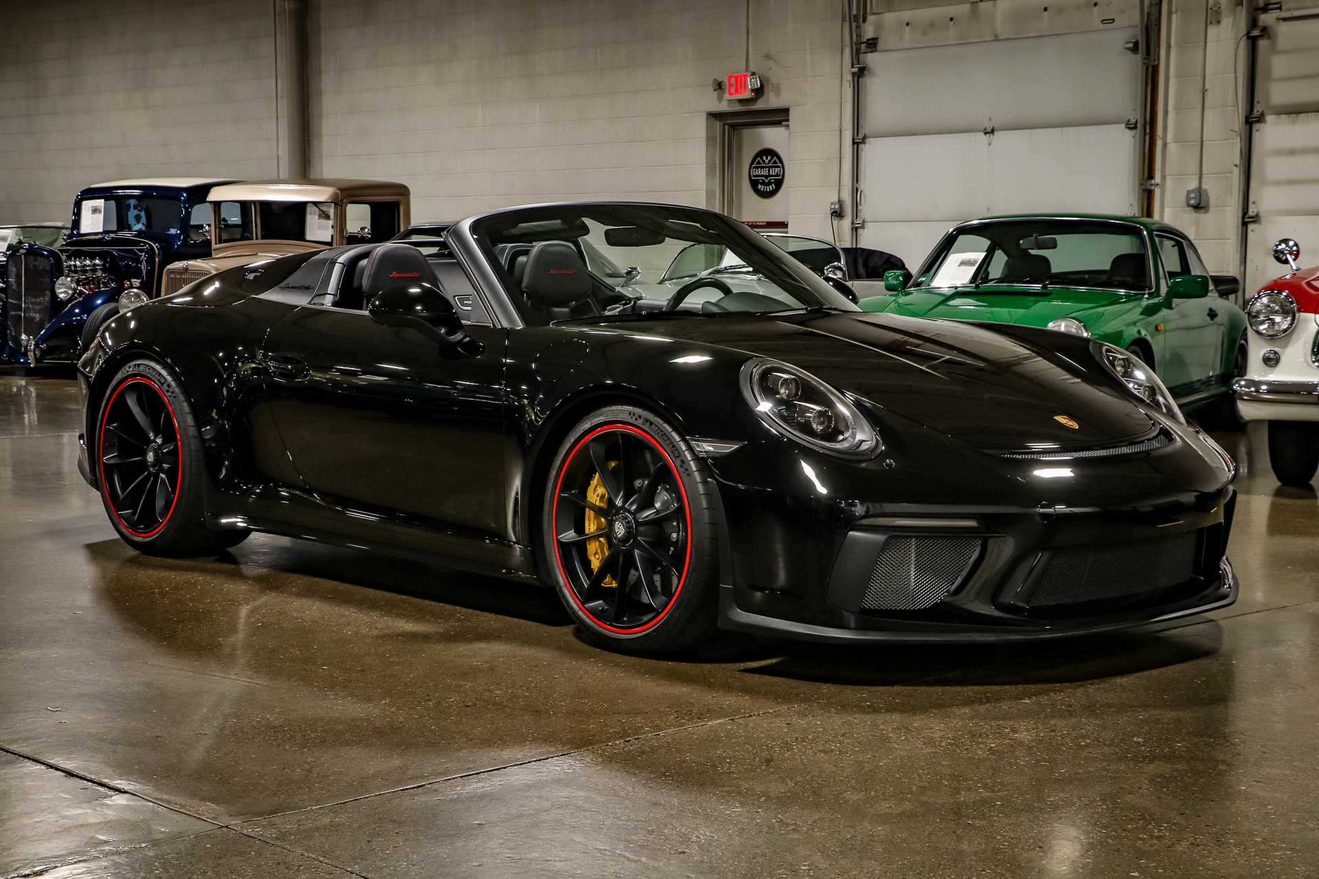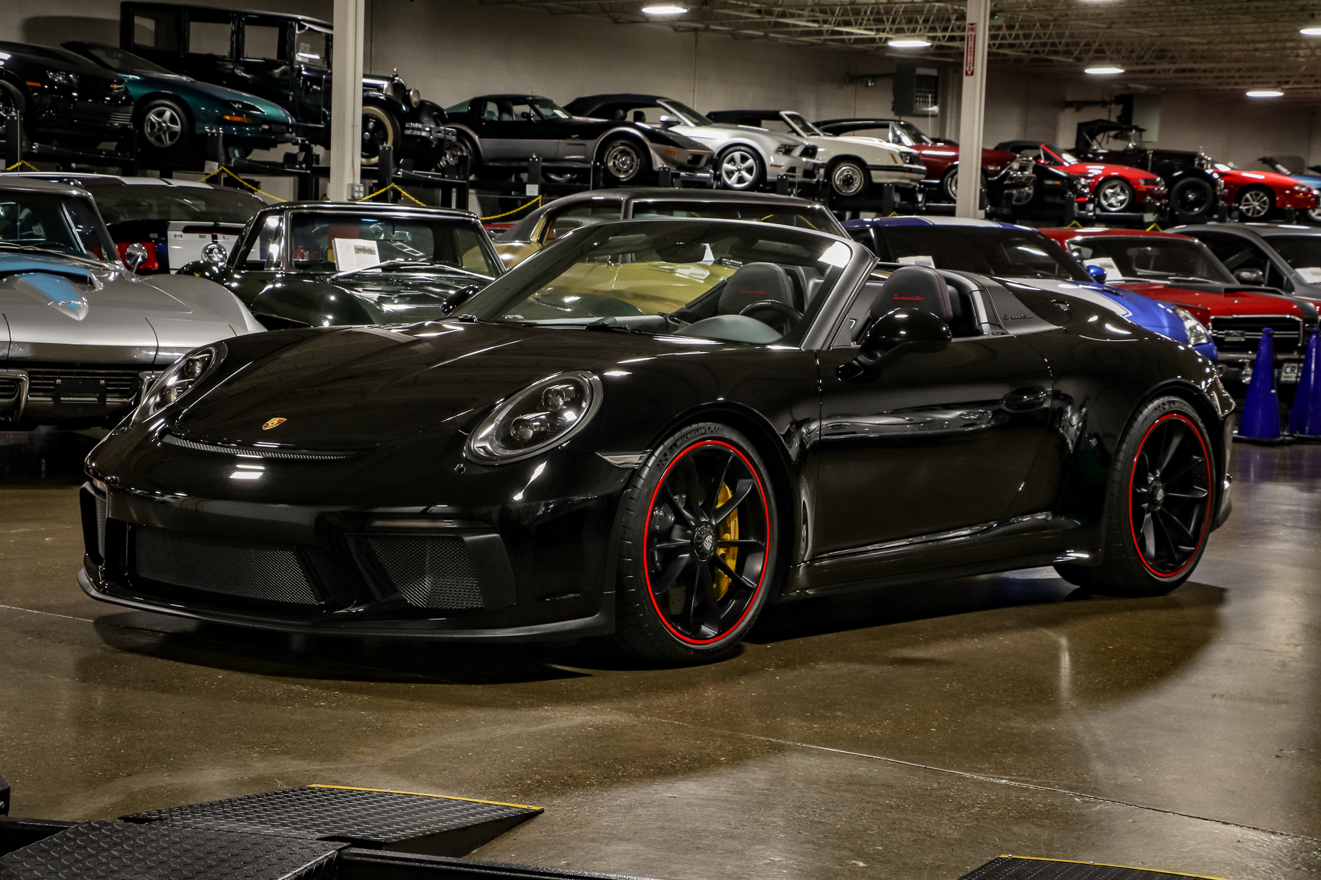 Center-locking 20″ forged alloy wheels feature red stripes and are mounted with Michelin Pilot Sport Cup 2 tires. Braking is handled by four-wheel cross-drilled Porsche Ceramic Composite Brakes with yellow Porsche-branded calipers. Porsche Active Suspension Management (PASM), Porsche Stability Management (PSM), and rear-axle steering were standard on the Speedster, and this example was optioned with a front-axle lift system.