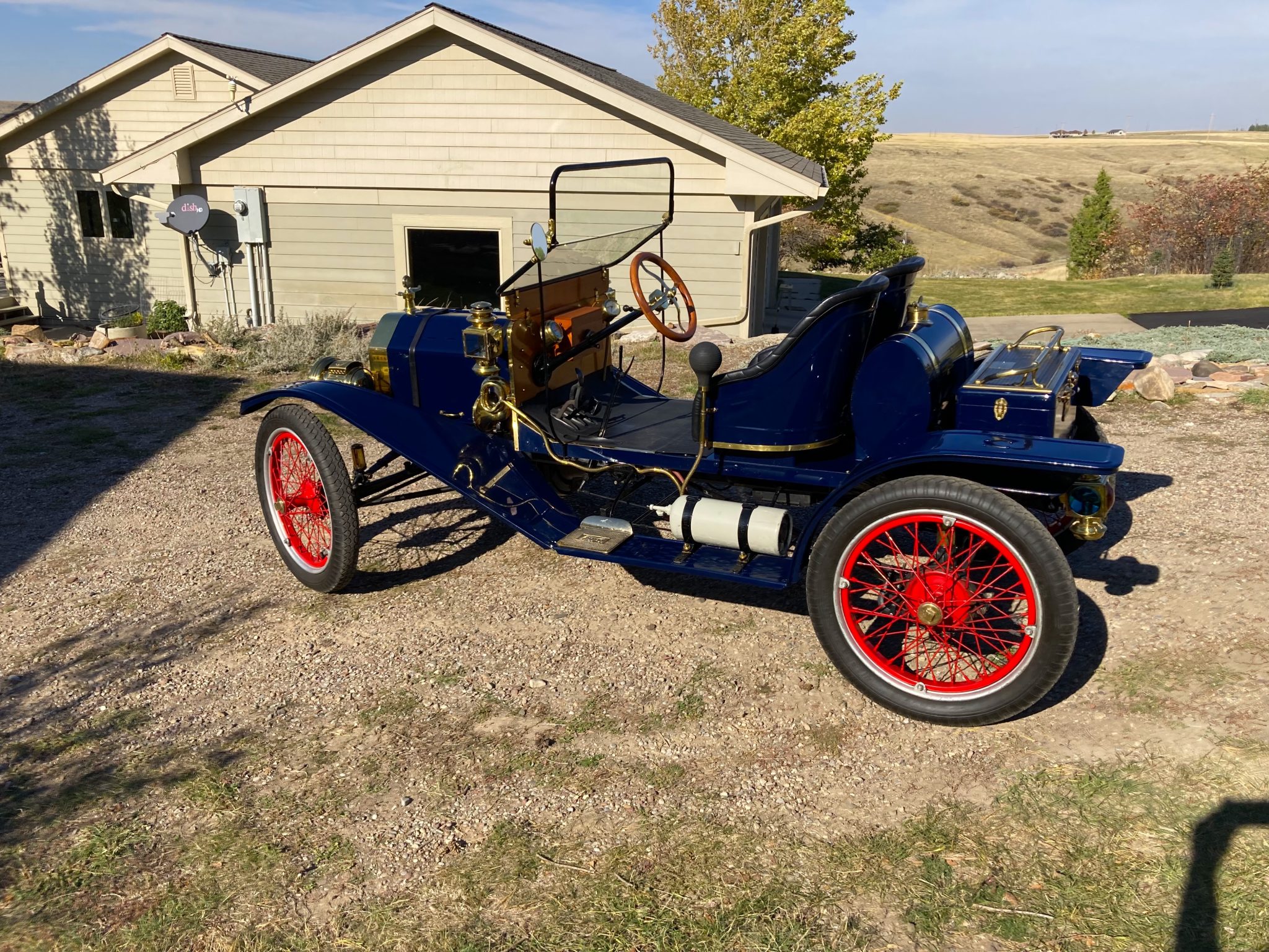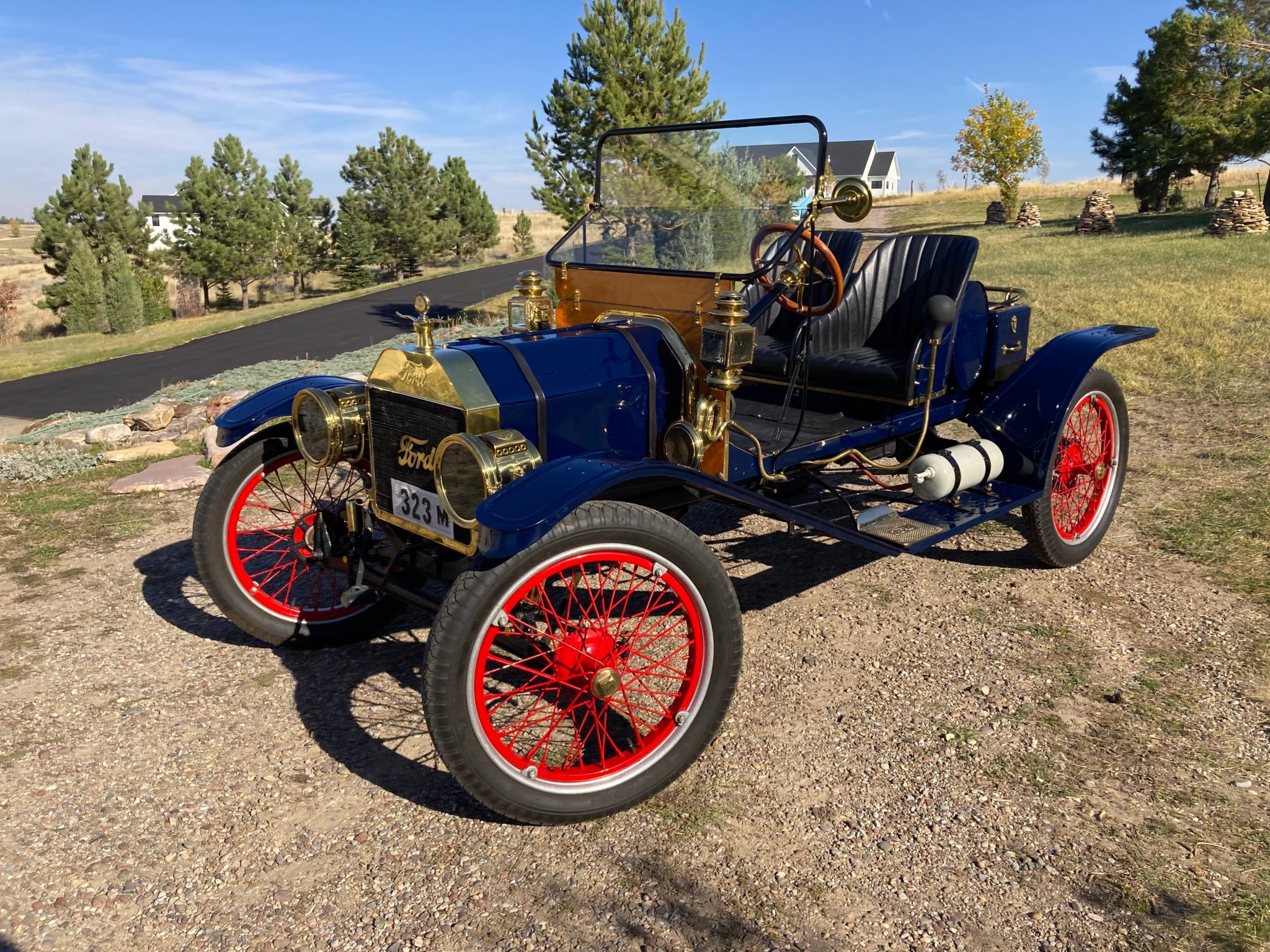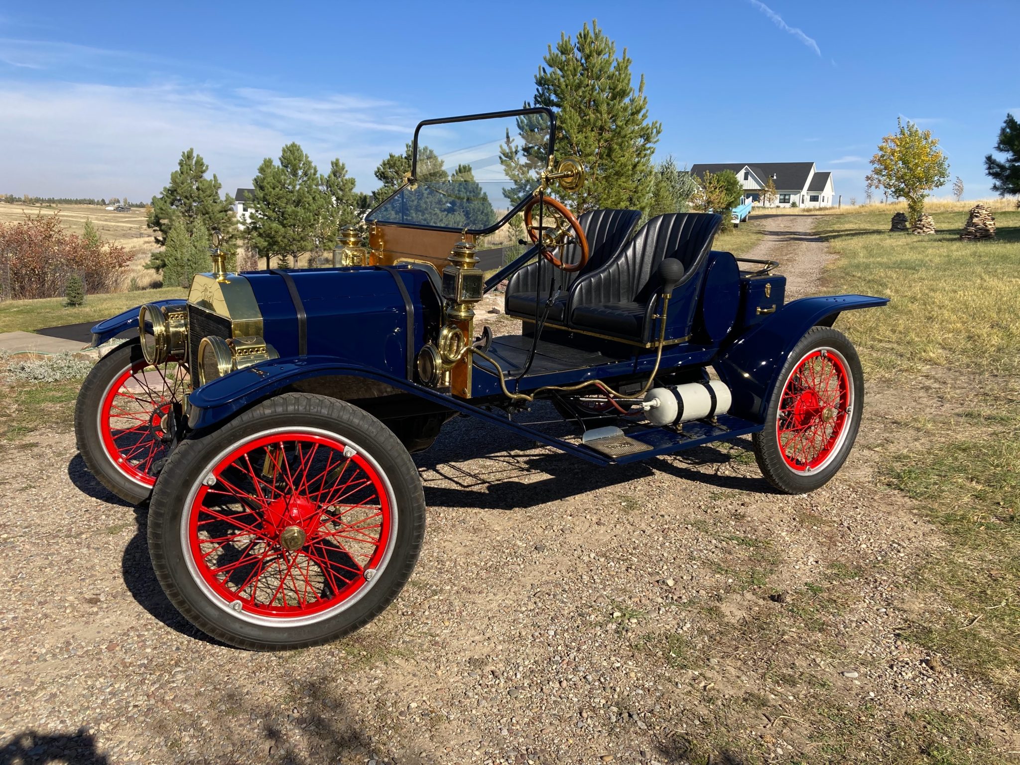 Red-painted Hayes demountable wire wheels are mounted with silver rims and 30×3½ Ward’s Riverside bias-ply tires. The frame was repainted black during the build and features a front and rear transverse leaf spring suspension. The front brass shock absorber internals have been removed. Stopping power is provided by AC rear mechanical drum brakes.