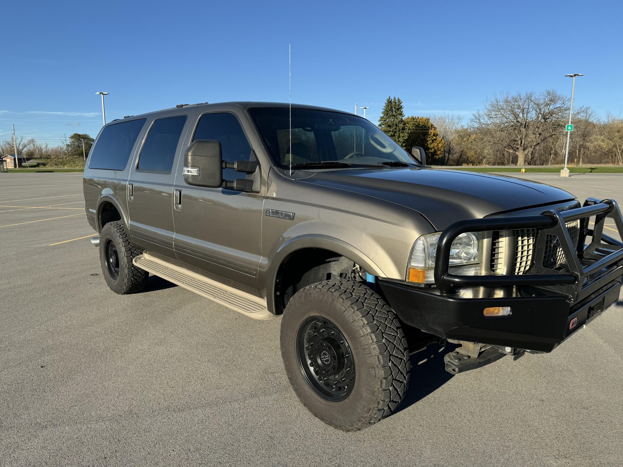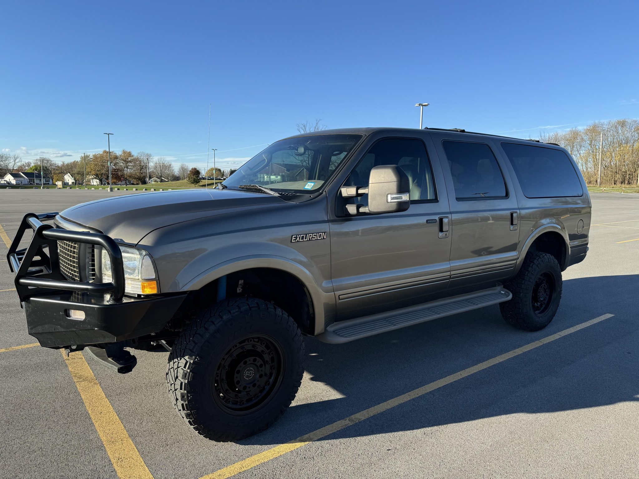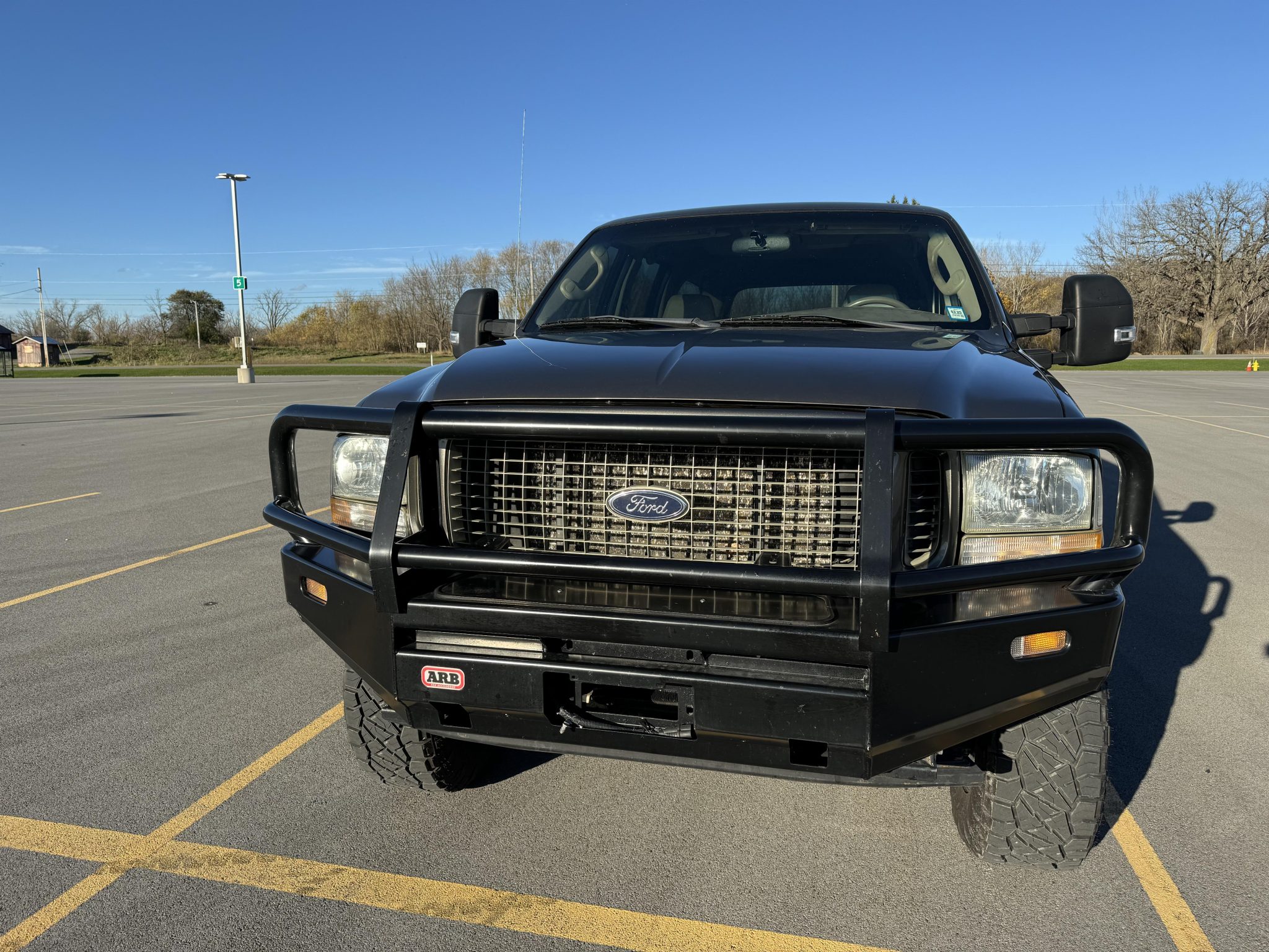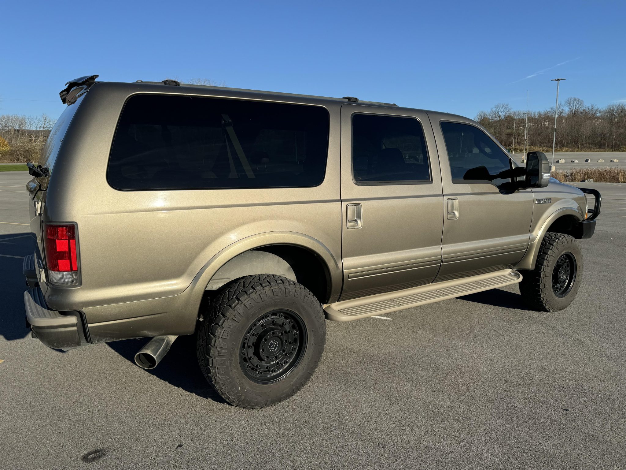 The 18″ Black Rhino Arsenal wheels are mounted with 295/70 Nitto Ridge Grappler tires. The suspension has been modified with F-250 “V-code” front and “B-code” rear leaf springs. In addition, a front leveling kit, an F-250 rear sway bar, Bilstein shocks, a Bilstein steering stabilizer, and an adjustable heavy-duty front track bar have been added. Before the selling dealer acquired the vehicle, the tie rods were replaced along with the brake fluid, calipers, rotors, and pads, and the power steering fluid was flushed.