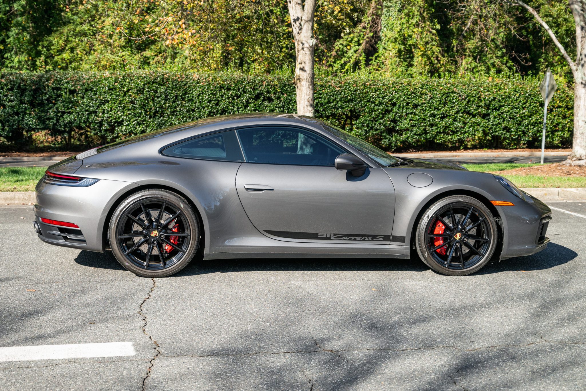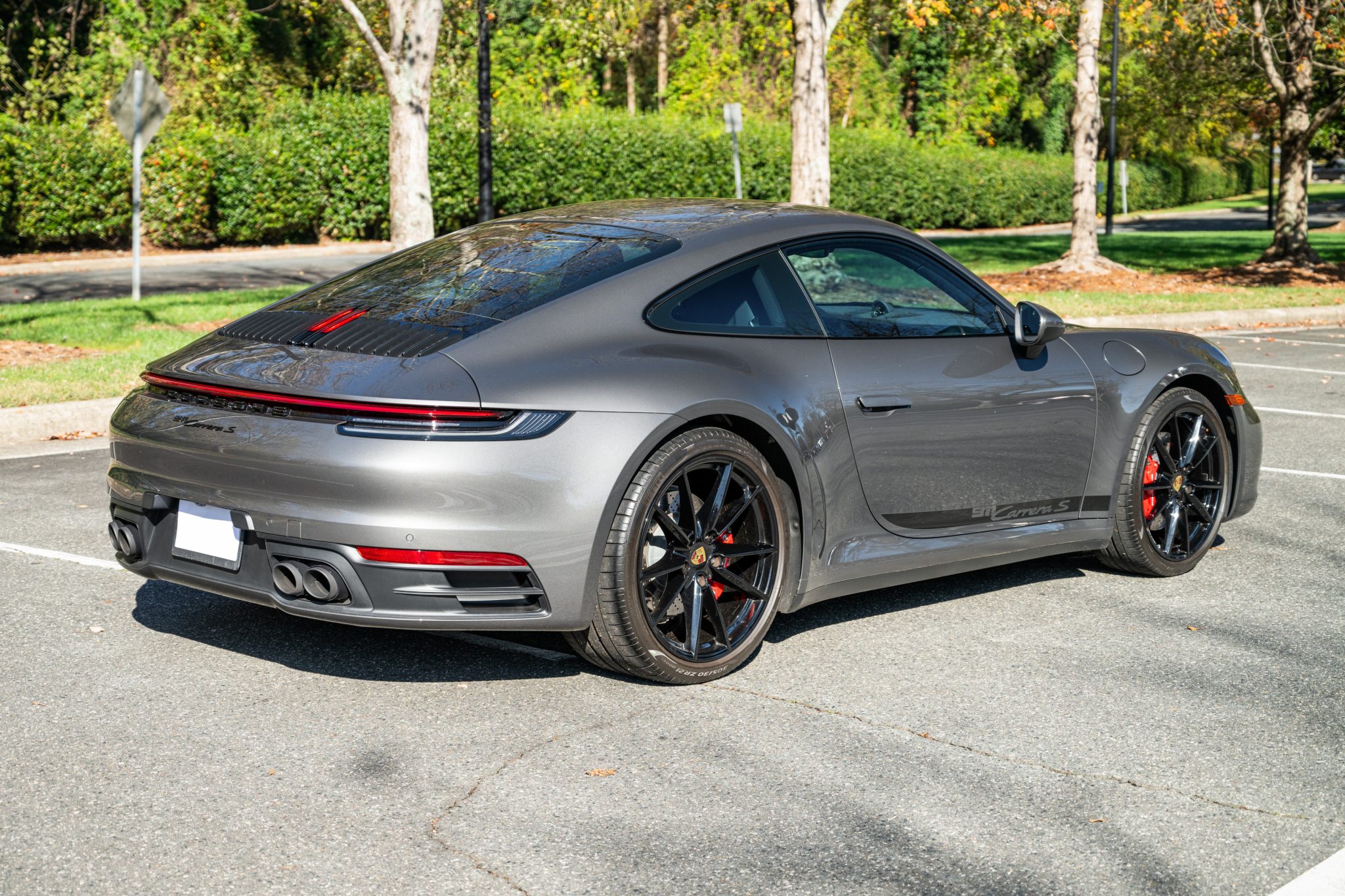 High-gloss black 20″ and 21″ Carrera S wheels are mounted with 245/35 front and 305/30 rear Pirelli P Zero tires. Standard equipment on the Carrera S includes Porsche Active Suspension Management (PASM) with a 10mm lower ride height. Braking is handled by red-finished Porsche-script calipers over cross-drilled and ventilated rotors.