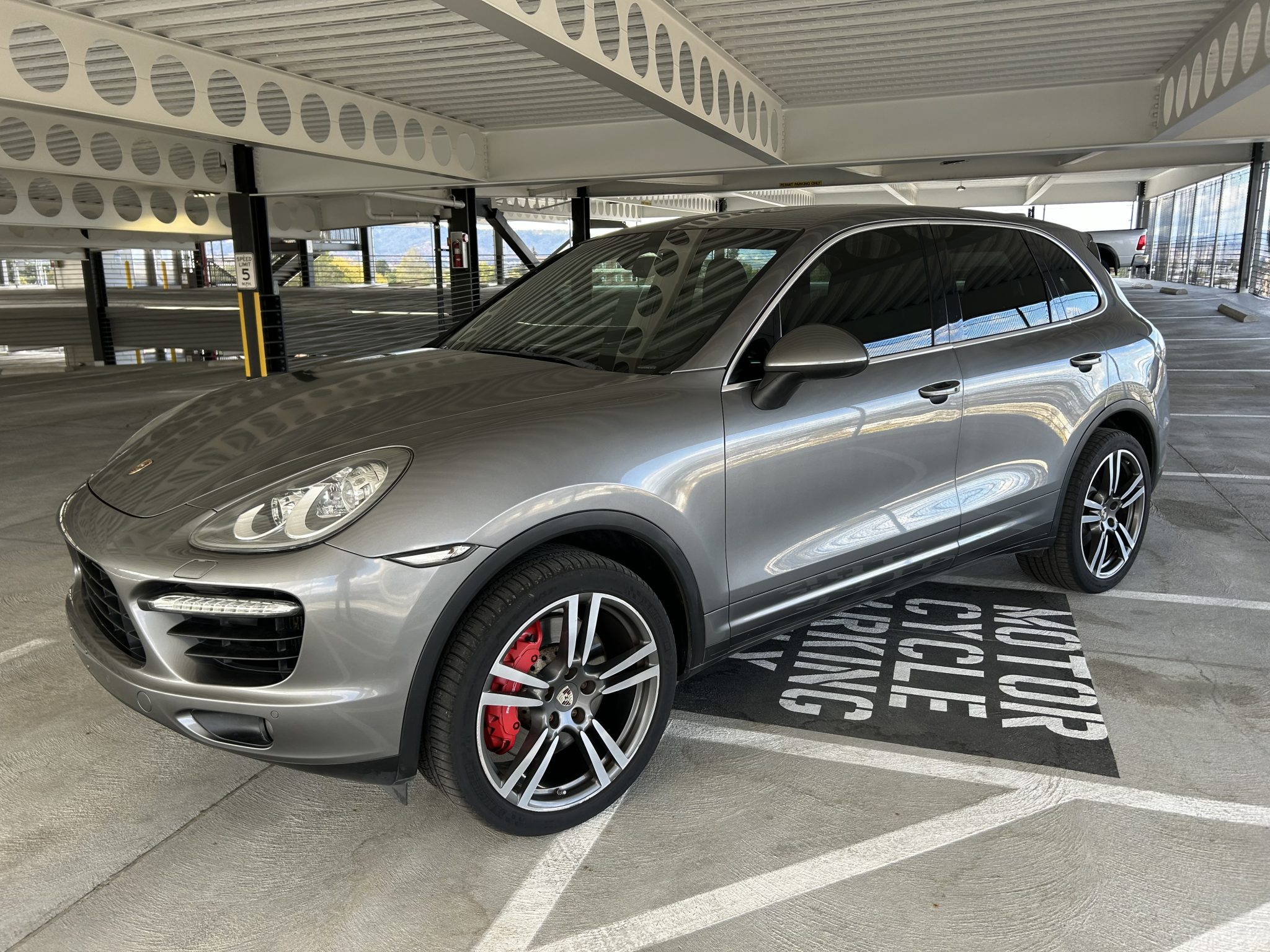 The 21″ 911 Turbo II alloy wheels are mounted with 295/35 Michelin Pilot Sport A/S 3+ tires. Multiple wheels have curb marks. The vehicle is equipped with an adjustable air suspension, Porsche Dynamic Chassis Control (PDCC), Porsche Active Suspension Management (PASM), and Power Steering Plus. Stopping power is provided by red-finished six-piston front and four-piston rear brake calipers over ventilated rotors at each corner.