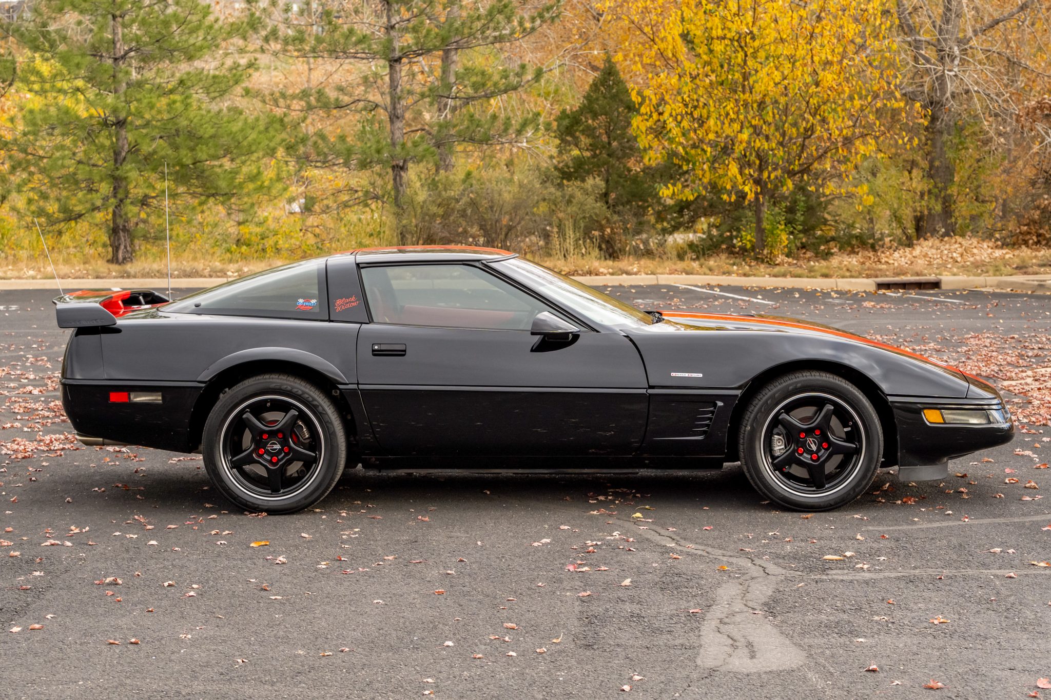 Black-finished 17″ five-spoke alloy wheels with polished lips are secured to the hubs with red lug nuts and are mounted with Goodyear Eagle F1 tires. The car is equipped with traction control, and the optional Z51 Performance Handling Package added Bilstein shocks as well as heavy-duty springs and stabilizer bars. Antilock braking is provided by polished factory calipers over a ventilated disc at each corner.