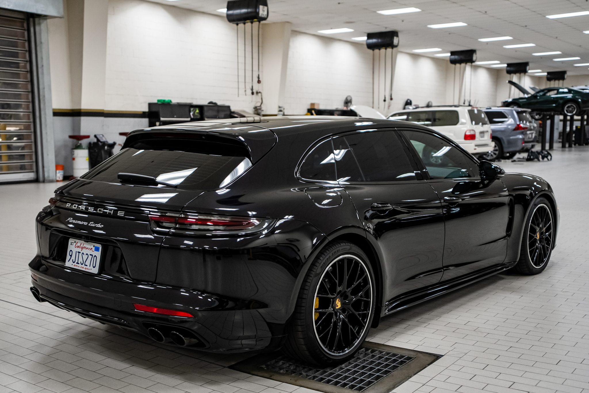 The 21″ SportDesign alloy wheels are mounted with Pirelli P Zero tires. The car is equipped with adaptive air suspension with Porsche Active Suspension Management (PASM). Stopping power is provided by Porsche Ceramic-Composite Brakes (PCCB) with yellow-finished calipers.