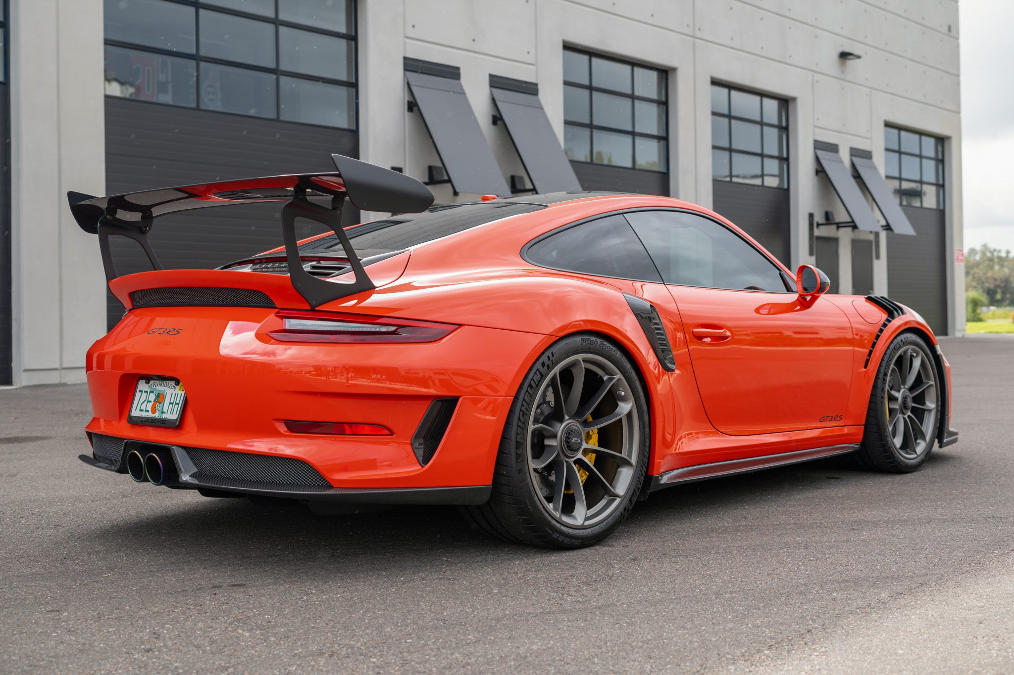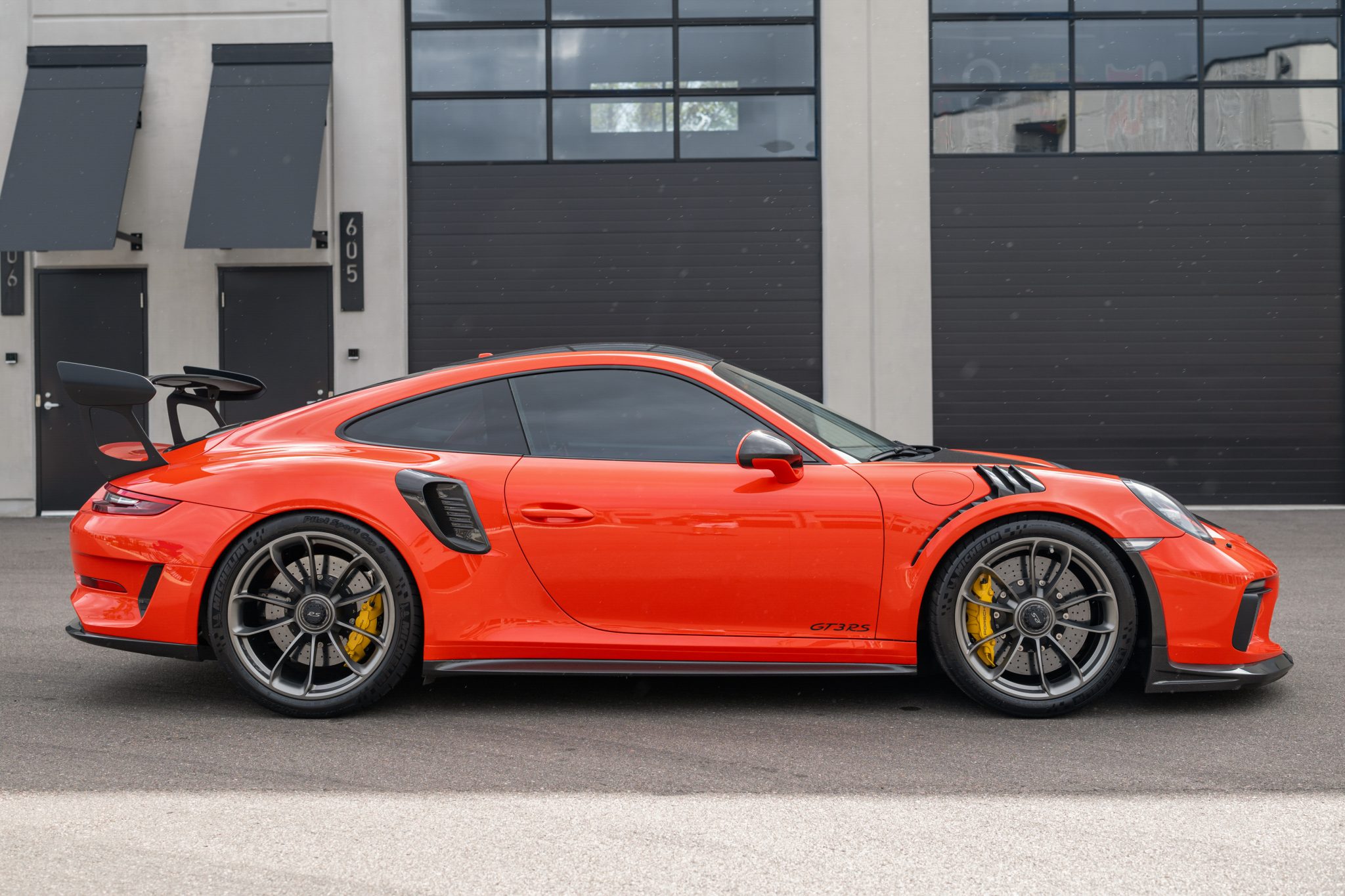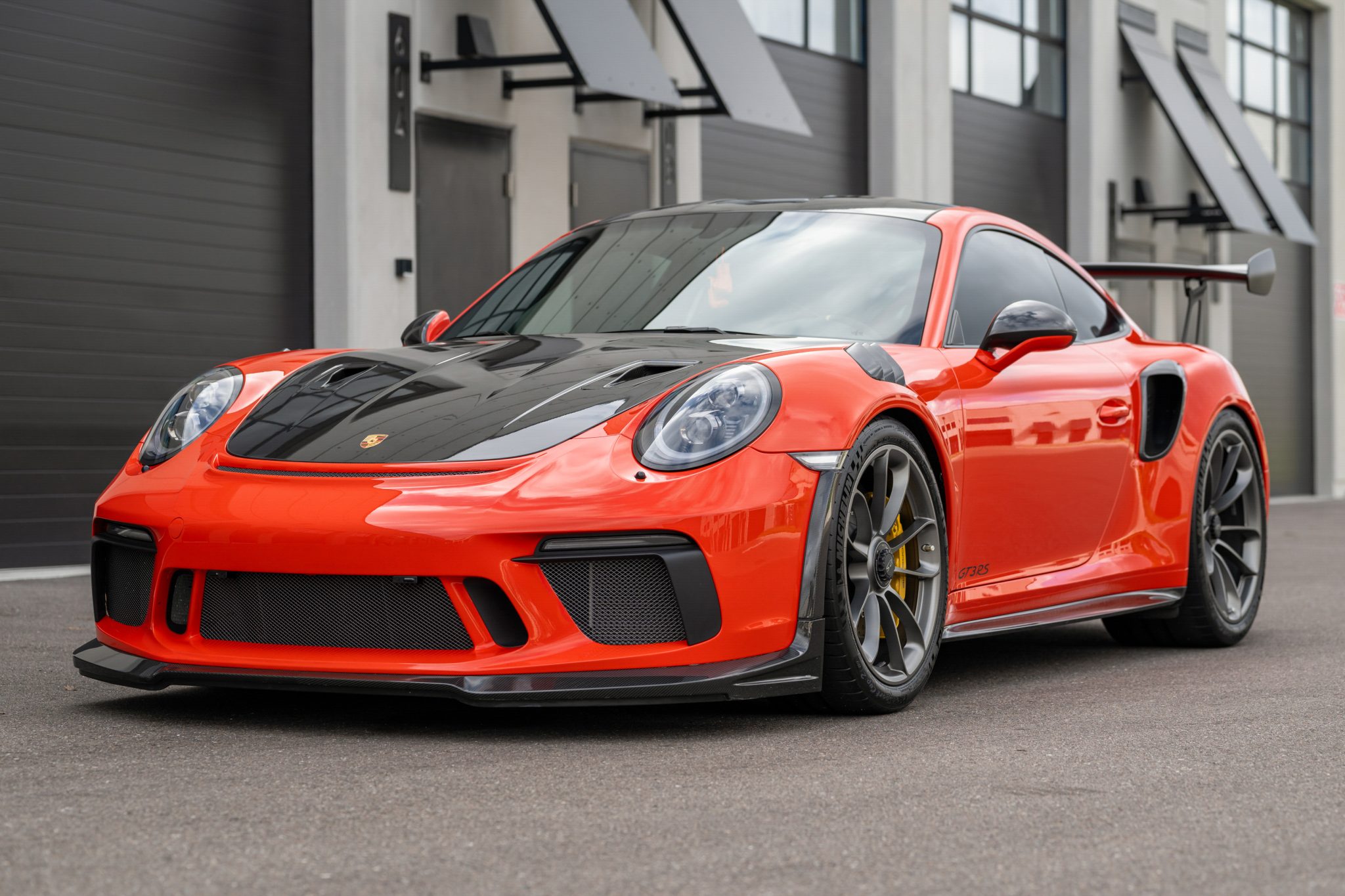 The 20″ front and 21″ rear center-lock alloy wheels are mounted with Michelin tires showing 2023 date codes. Braking is handled by yellow Porsche-branded calipers over ceramic-composite rotors. The car is equipped with a front-axle lift system. The Weissach Package added carbon-fiber front and rear anti-roll bars and coupling rods.