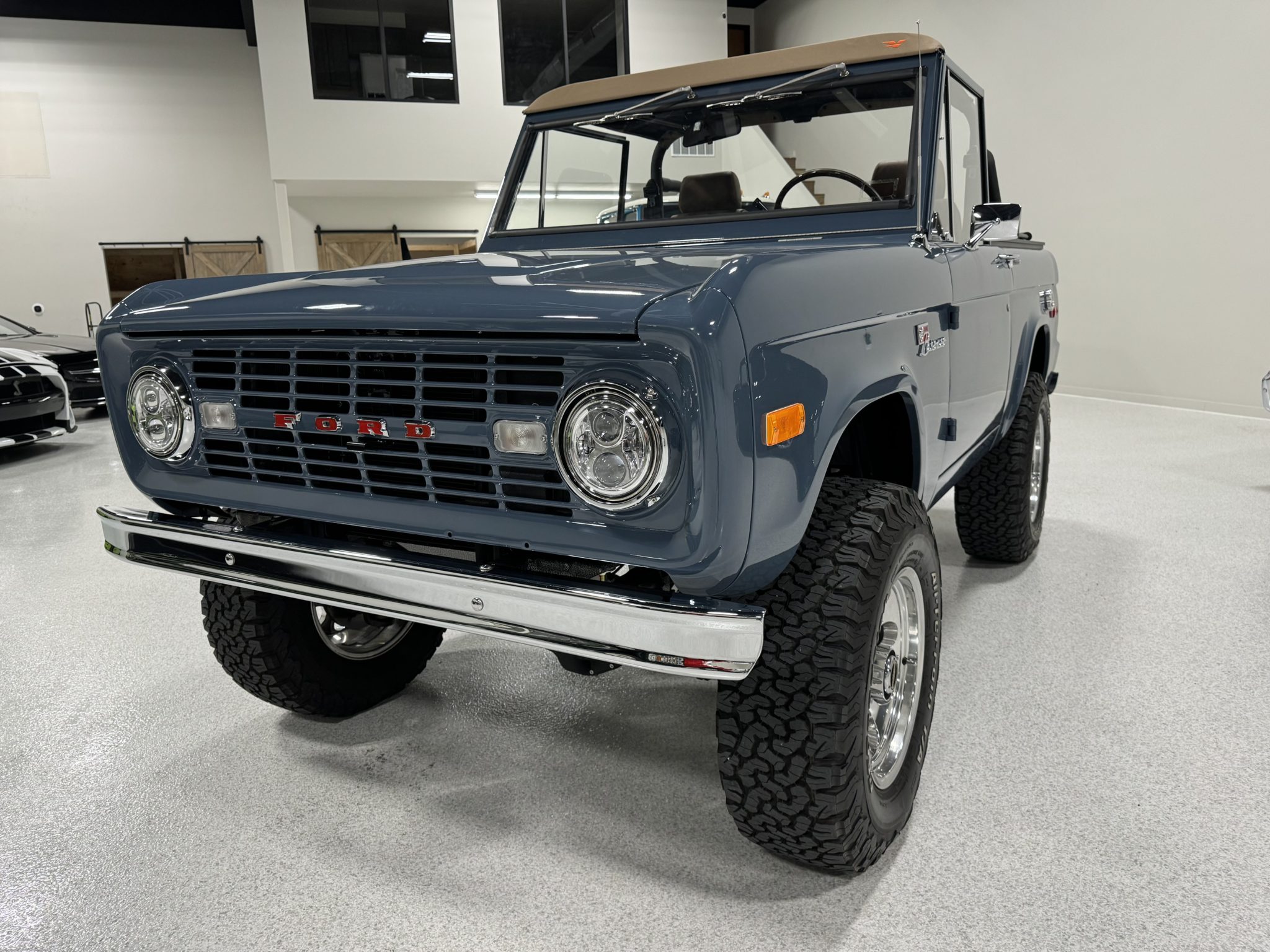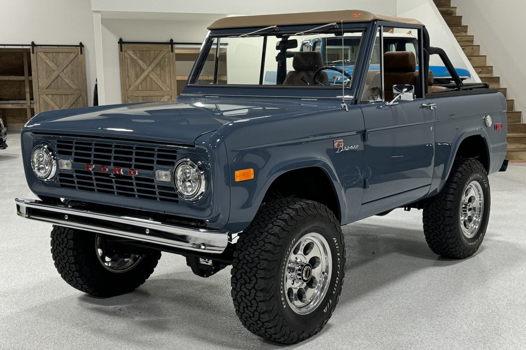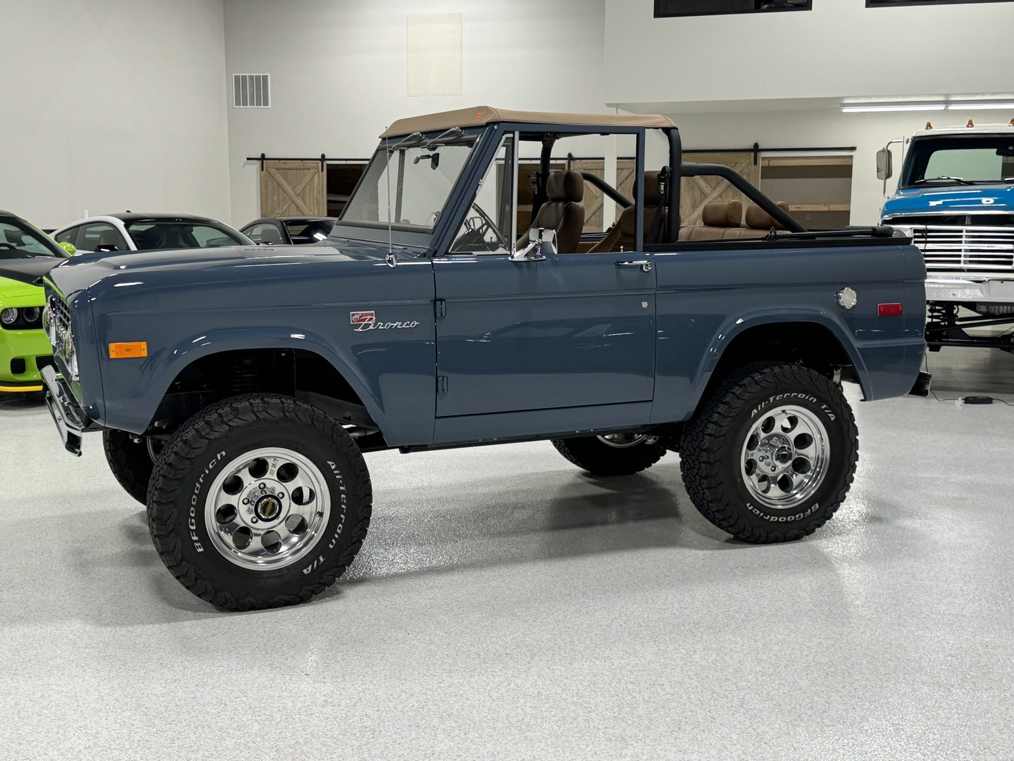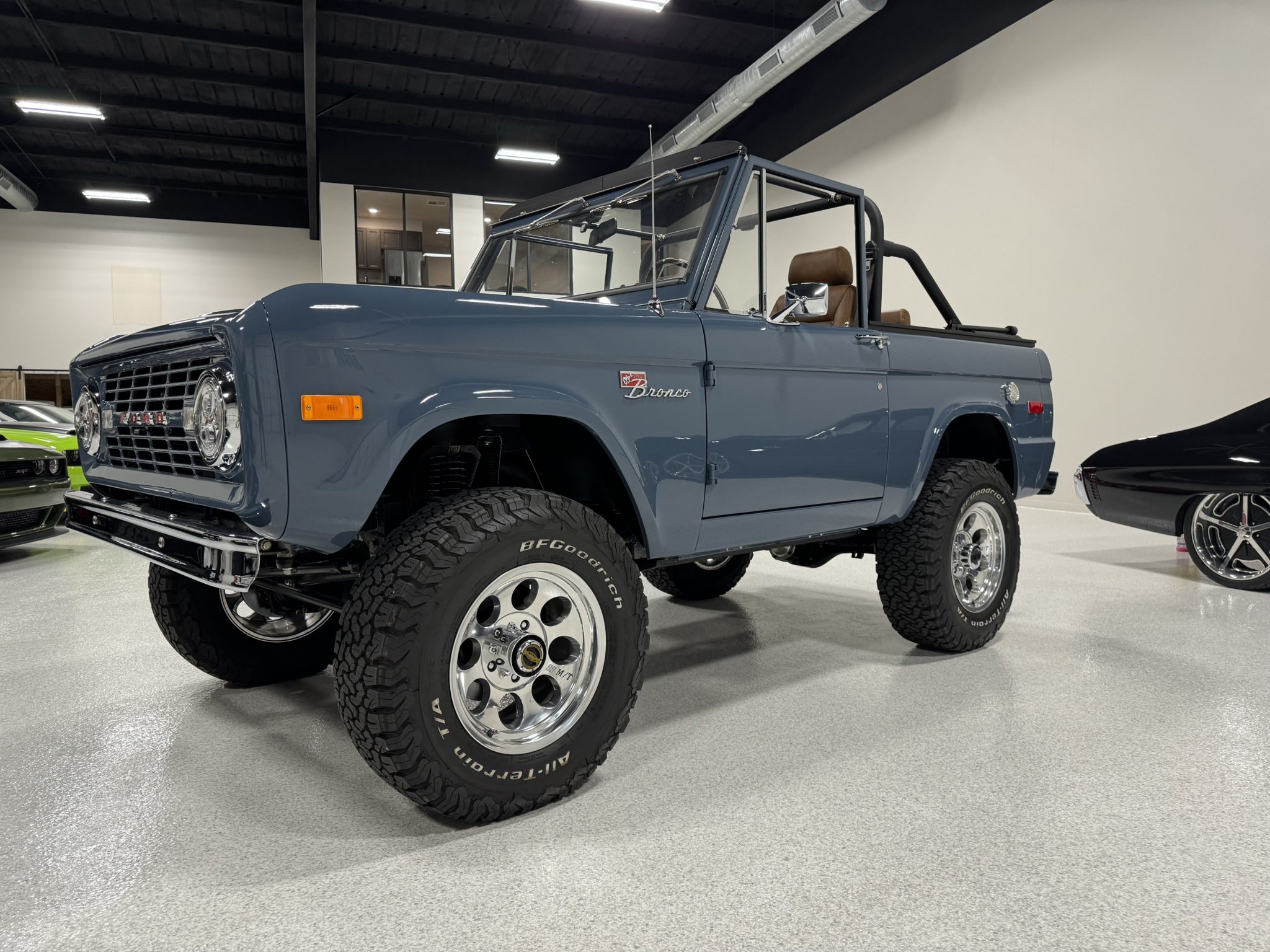 Bright-finished 17″ Mickey Thompson wheels are mounted with 285/70 BFGoodrich All-Terrain T/A KO2 white-letter tires. The truck rides on a 2″ suspension lift with Bilstein shock absorbers along with a 1″ body lift. Warn manually locking hubs are mounted up front, and T-Rex radius arms have been retrofitted. Stopping power is provided by Wilwood hydroboosted four-wheel disc brakes.