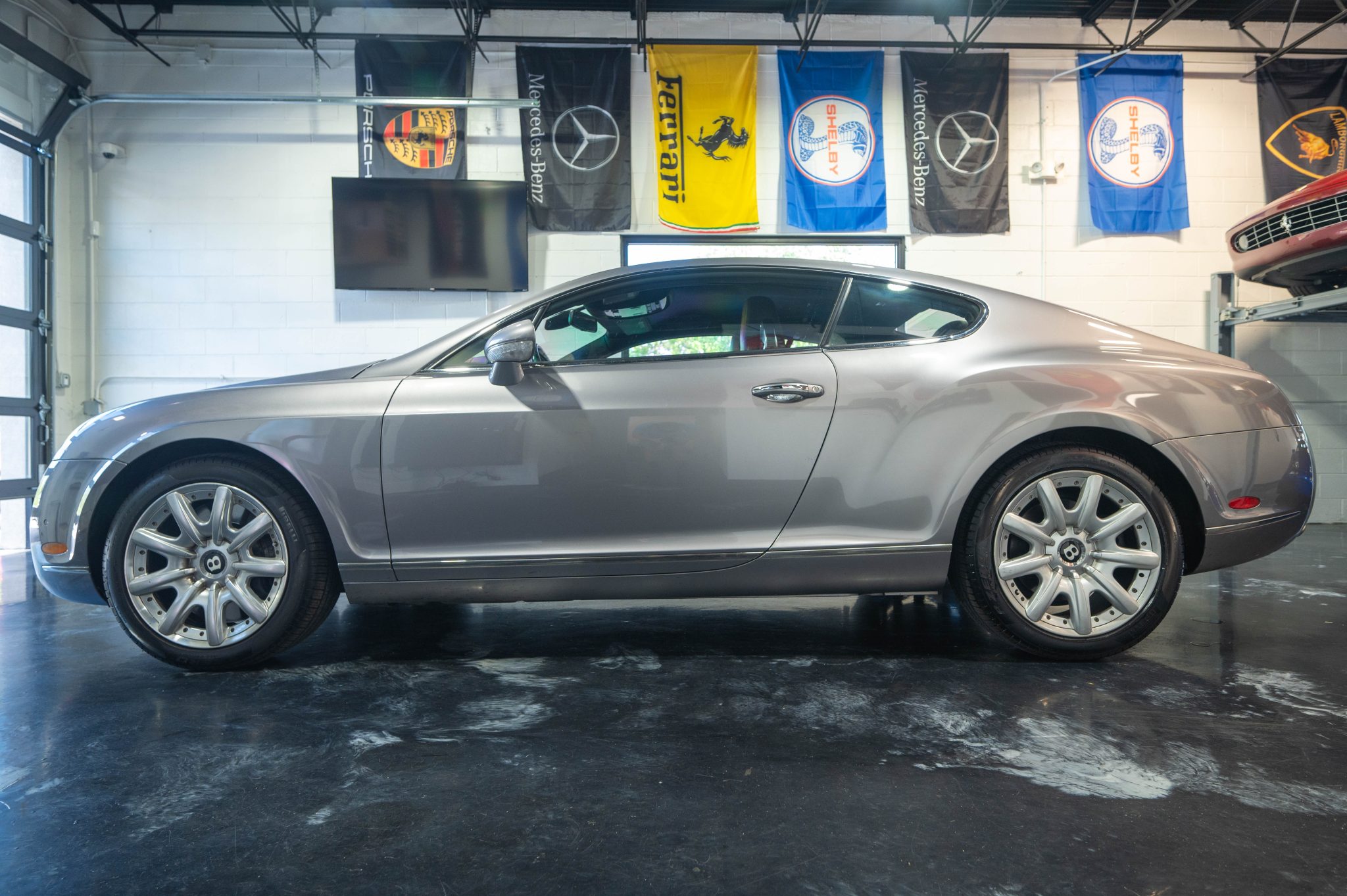 The 19″ nine-spoke alloy wheels are mounted with Pirelli P Zero All Season tires measuring 275/40 all around. The car is equipped with an adaptive air suspension that includes driver controls for ride height and damper settings. Stopping power is provided by Bentley-branded calipers fitted over ventilated rotors at each corner.