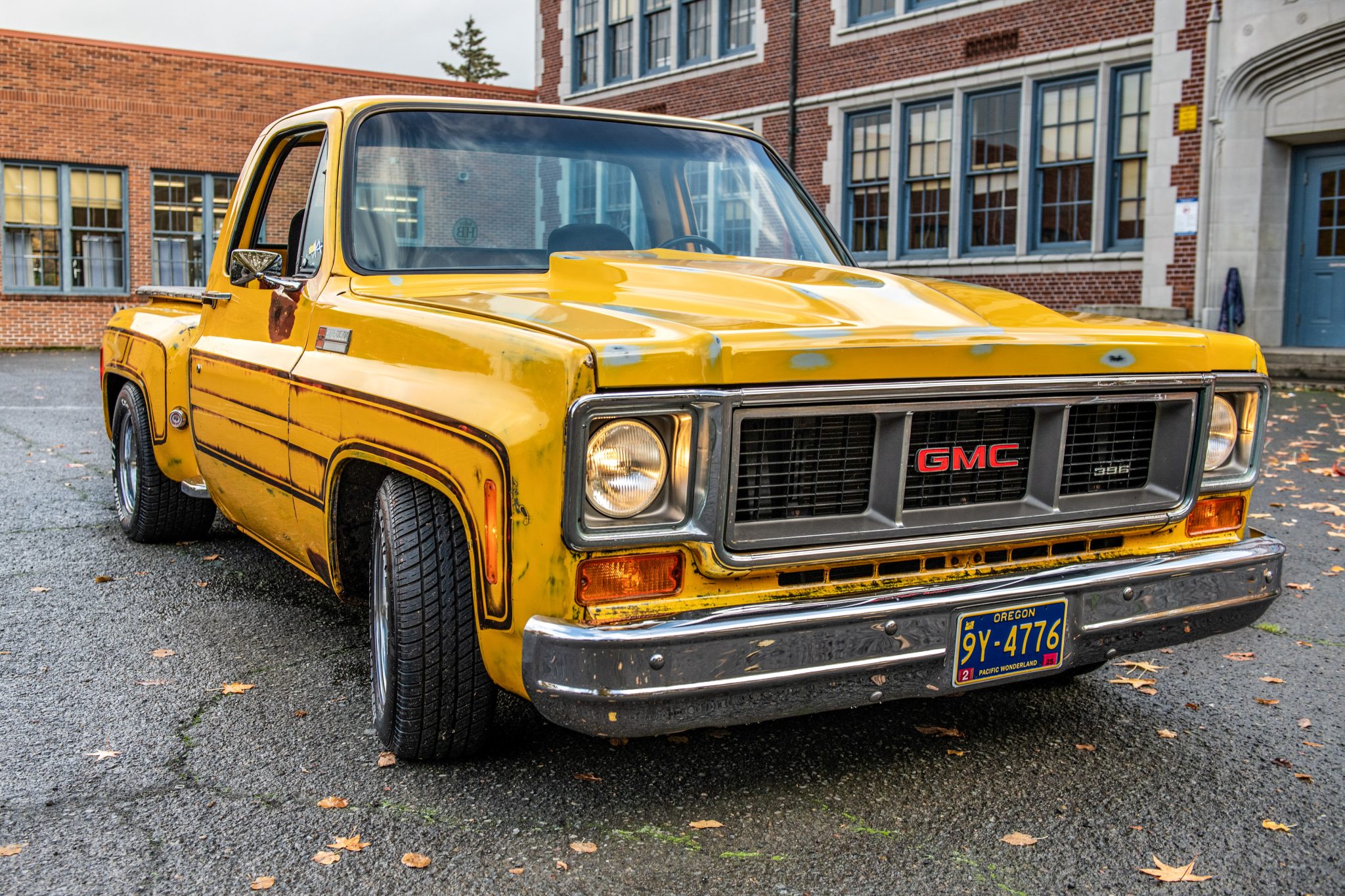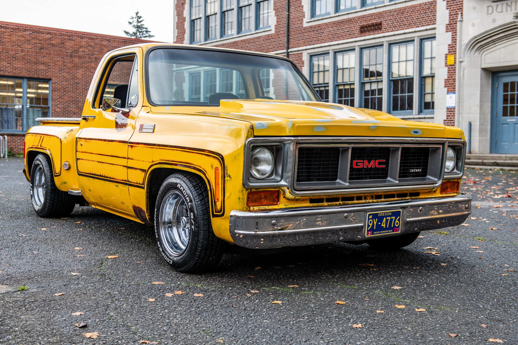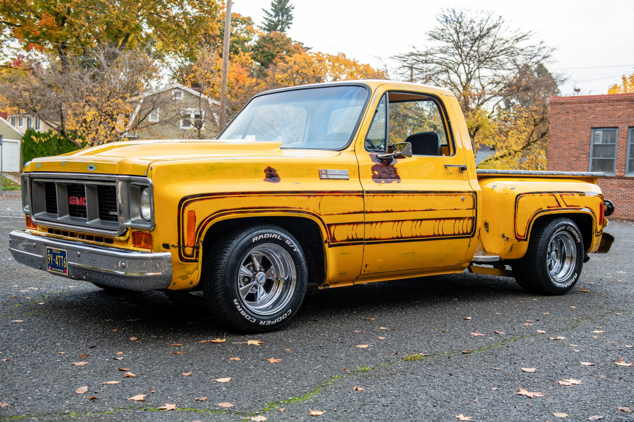 The staggered-width 15″ Cragar alloy wheels are mounted with 215/65 front and 295/50 rear Cooper Cobra Radial G/T tires. The truck is equipped with power steering and a lowered suspension with traction bars. Braking is handled by front discs and rear drums.