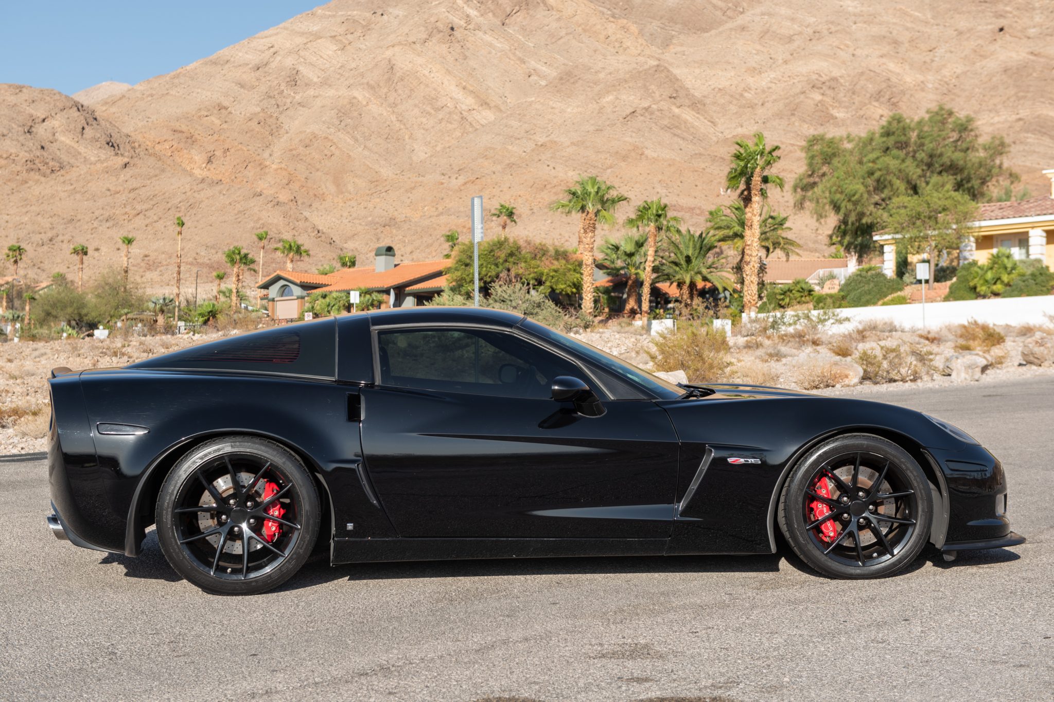 Black 18″ and 19″ V-spoke wheels are mounted with 275/35 front and 325/30 rear Michelin Pilot Sport tires that are cracked and should be replaced. Braking is handled by red Corvette-branded calipers over cross-drilled and ventilated discs at each corner.
