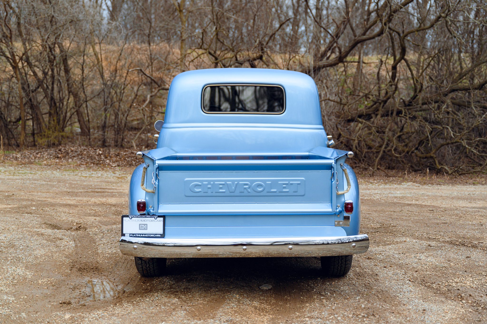 The body-color 15″ steel wheels wear chrome trim rings and hubcaps and are mounted with BFGoodrich Silvertown Radial whitewall tires. The truck was converted from six-lug hubs to a five-lug pattern during the refurbishment and fitted with 3″ lowering springs as well as power-assisted front disc brakes.