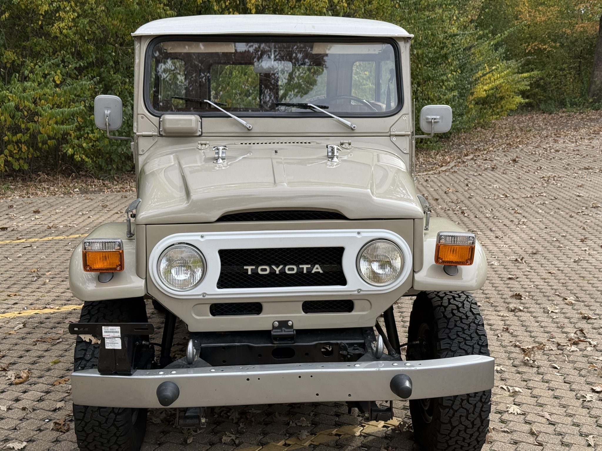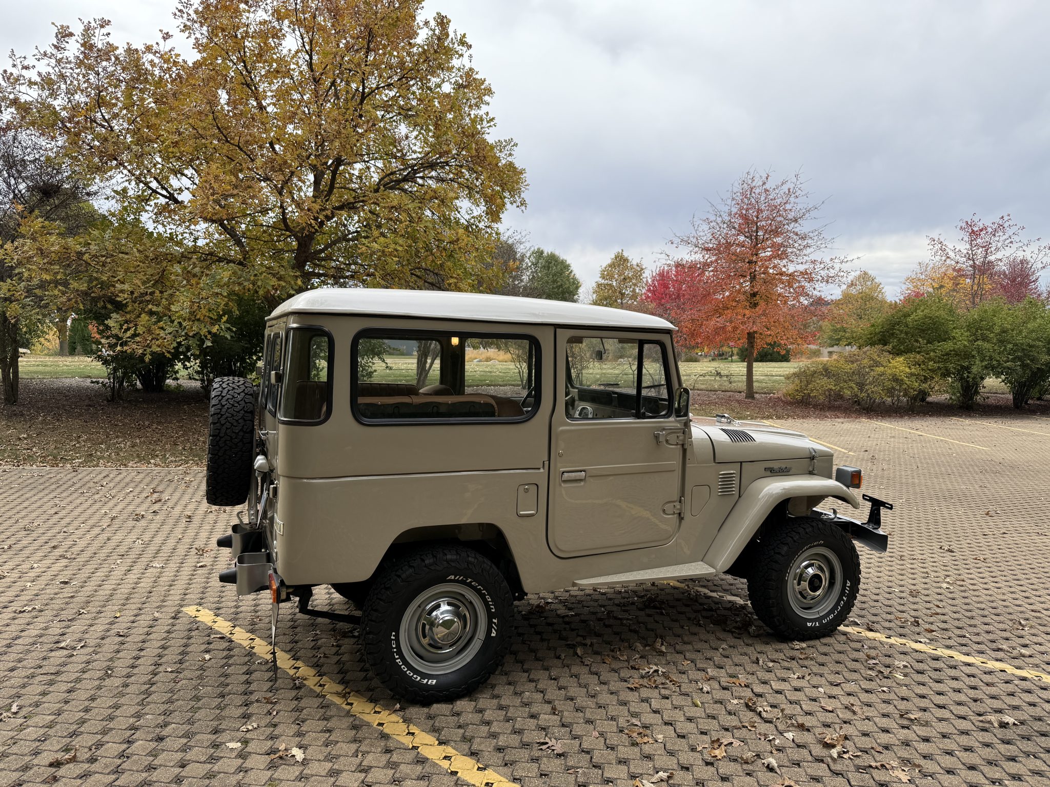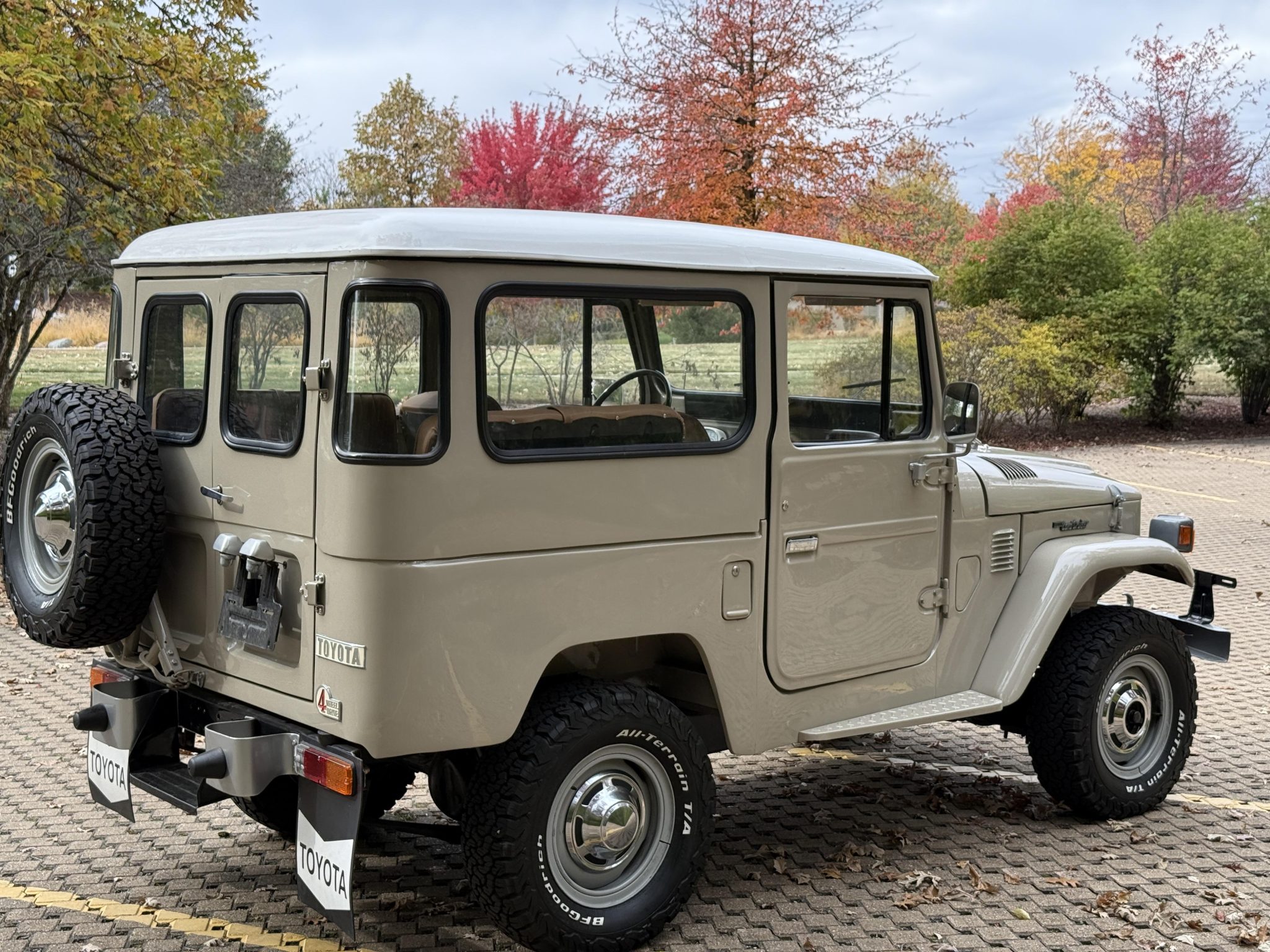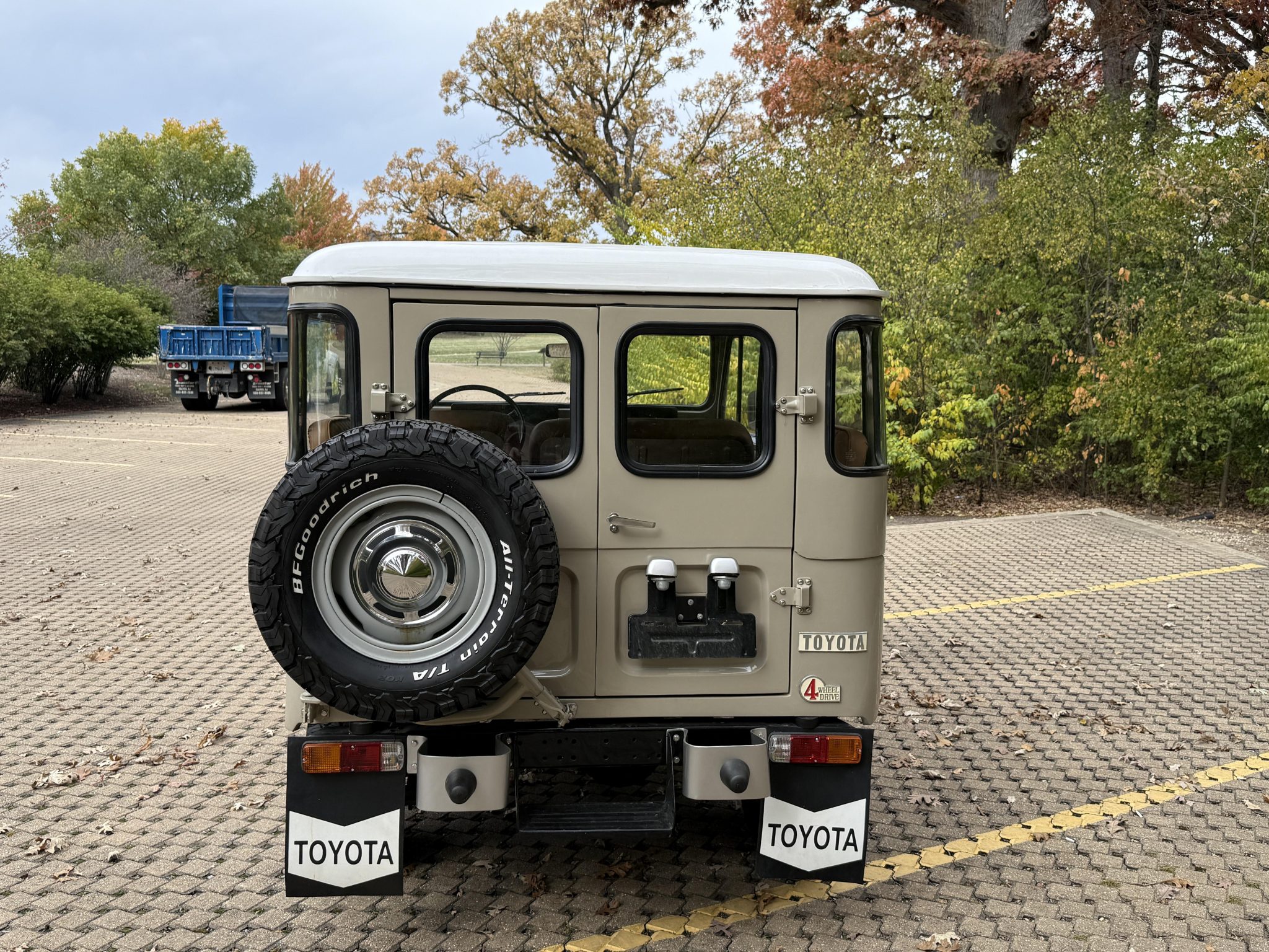 Silver-finished 15″ steel wheels are mounted with 235/75 BFGoodrich All-Terrain KO2 tires, and a matching spare is affixed to the swing-away carrier. The front axle is equipped with manually locking hubs. The steering box was rebuilt, and the suspension, along with the four-wheel drum power-assisted brake system, was overhauled during the refurbishment.