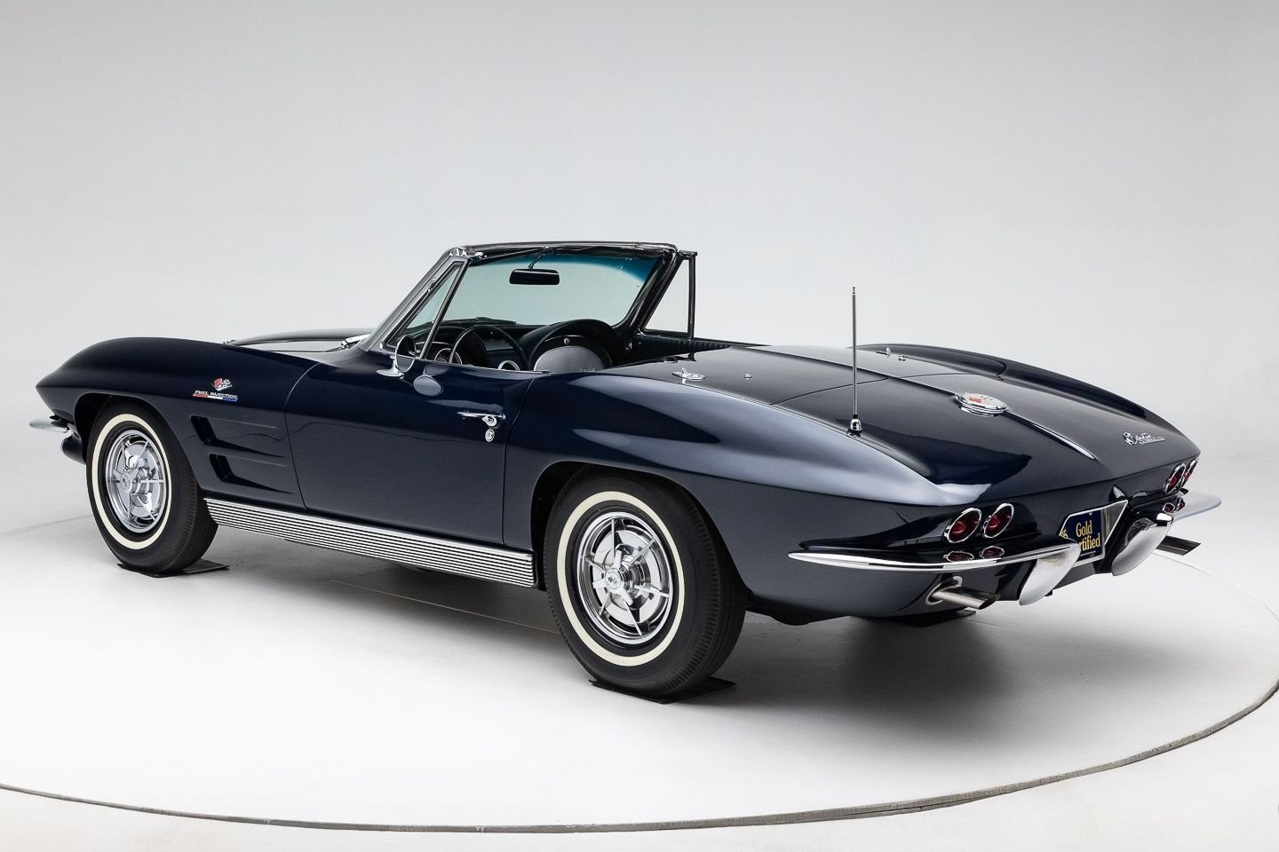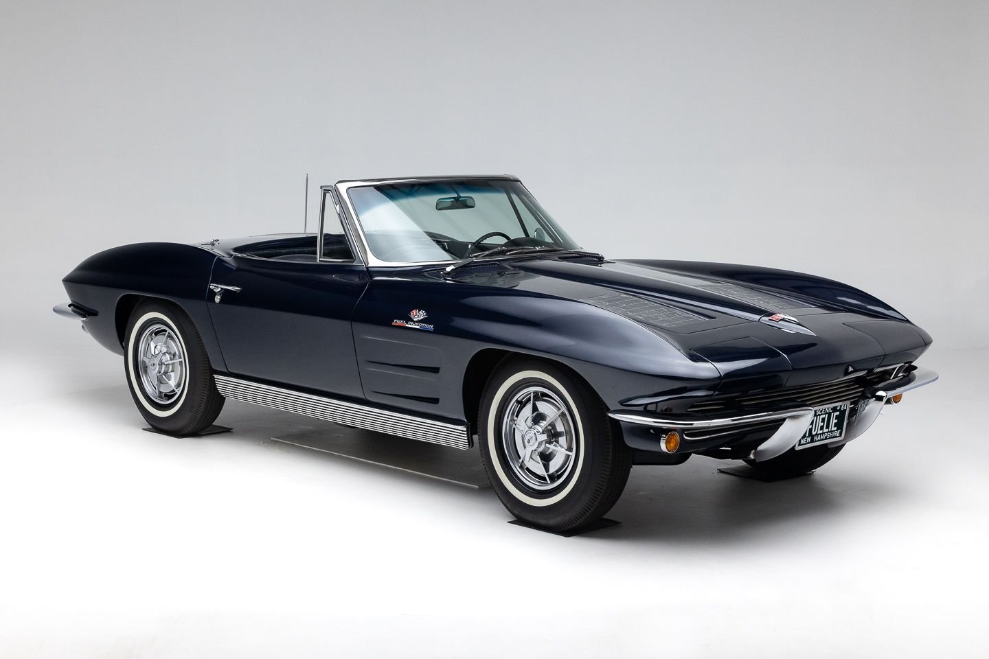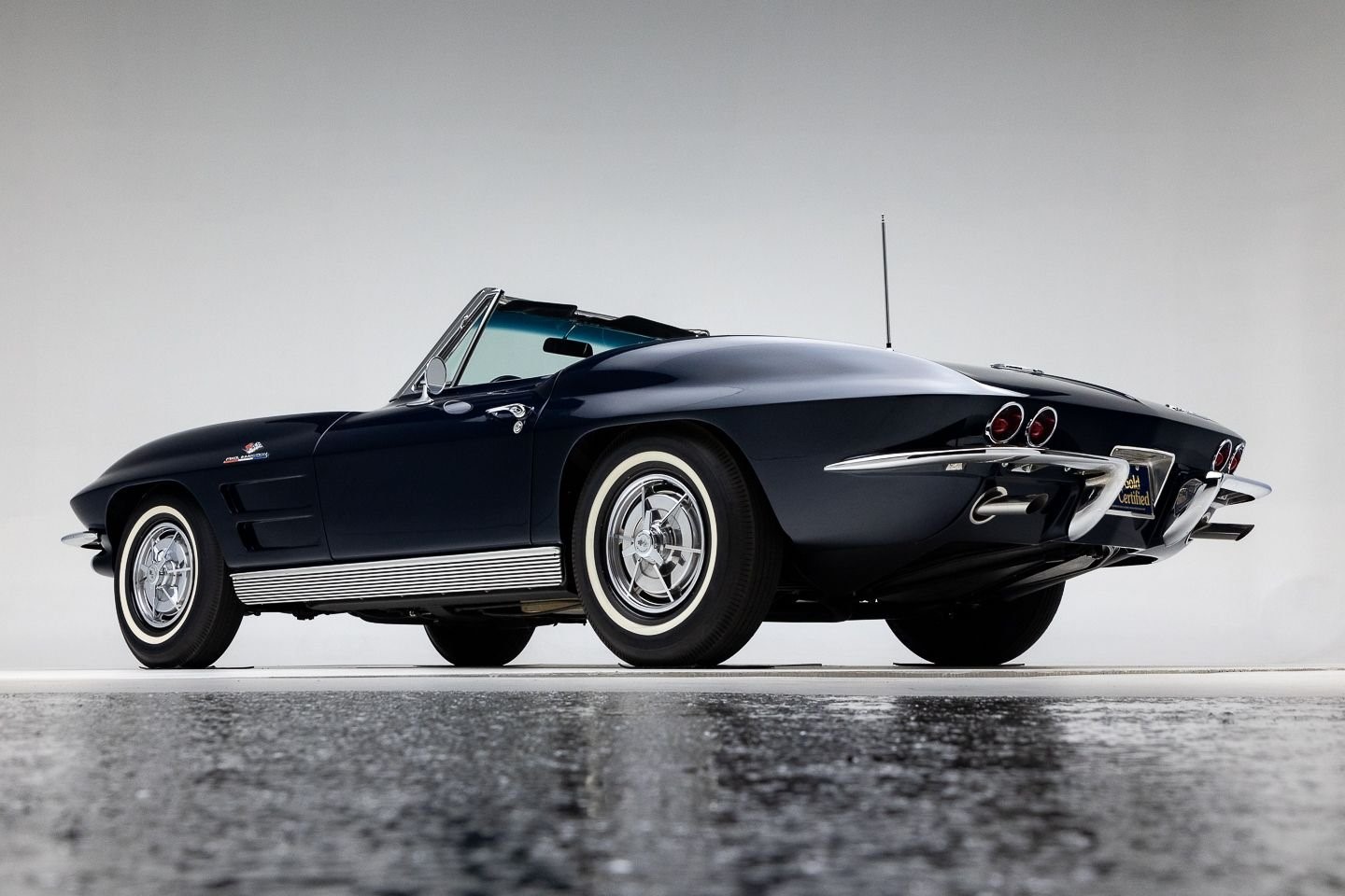 Silver-finished 15” steel wheels feature three-eared knock-off spinner-style hubcaps and are mounted with 6.70-15 BFGoodrich tires. The C2 was the first Corvette to offer fully independent suspension, with upper and lower control arms at the front and a three-link setup with a transverse leaf spring at the rear. Braking is handled by four-wheel drums.