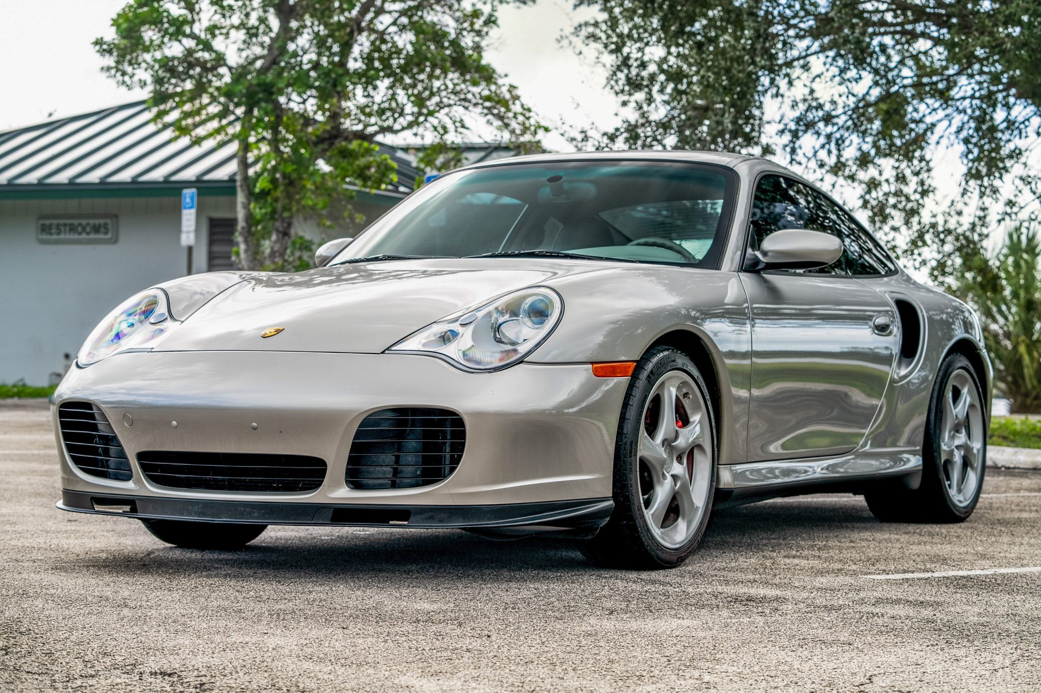 The 18″ Turbo Twist wheels wear Michelin Pilot Sport tires measuring 225/40 front and 295/30 rear with 2022 and 2023 date codes. The car is equipped with Porsche Stability Management (PSM) and an automatic brake differential. Braking is from vented and cross-drilled rotors at all four corners.