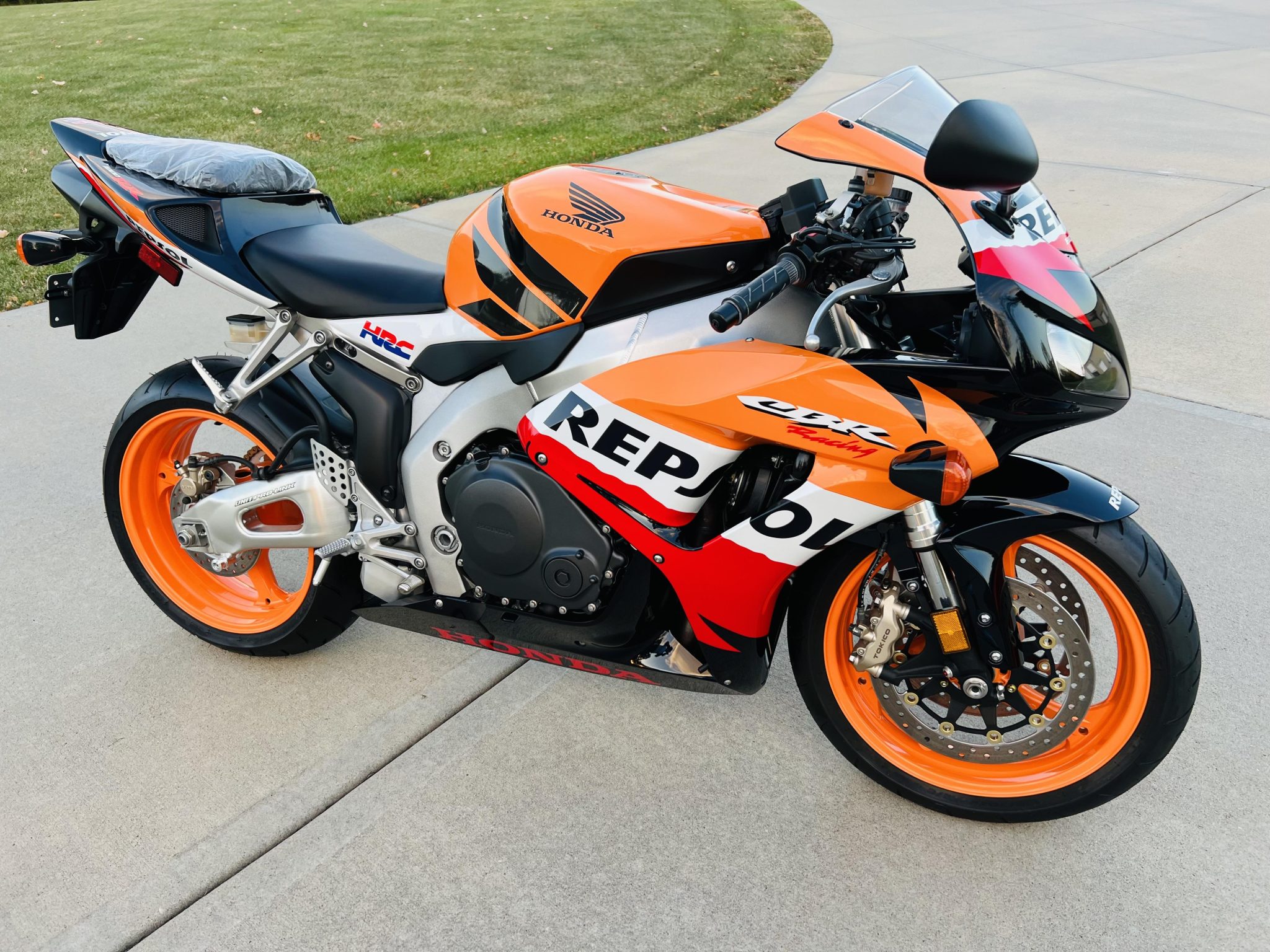 Orange-finished 17″ Enkei three-spoke alloy wheels wear older Bridgestone Battlax tires. Adjustable suspension consists of an inverted 43mm Honda Multi-Action System (HMAS) cartridge fork as well as a Unit Pro-Link piggyback monoshock and linkage connected to the braced aluminum swingarm. Braking is handled by radial-mount Tokico four-piston calipers fitted over a pair of 320mm floating rotors up front in addition to a single-piston Nissin caliper mounted over a 220mm disc out back.