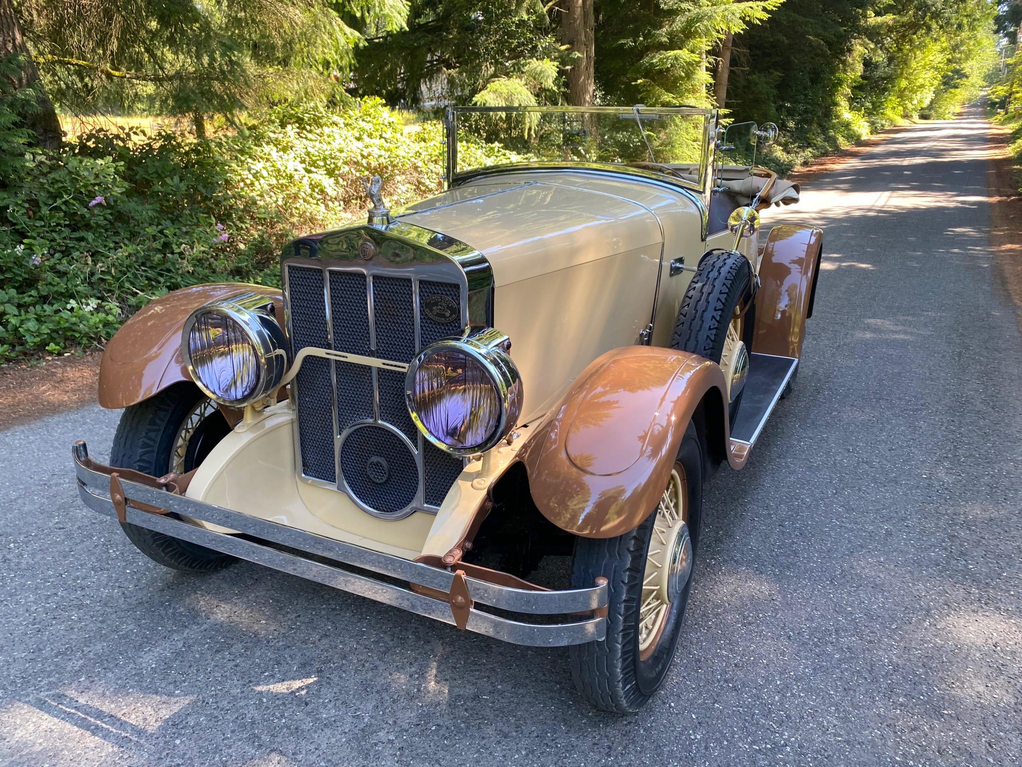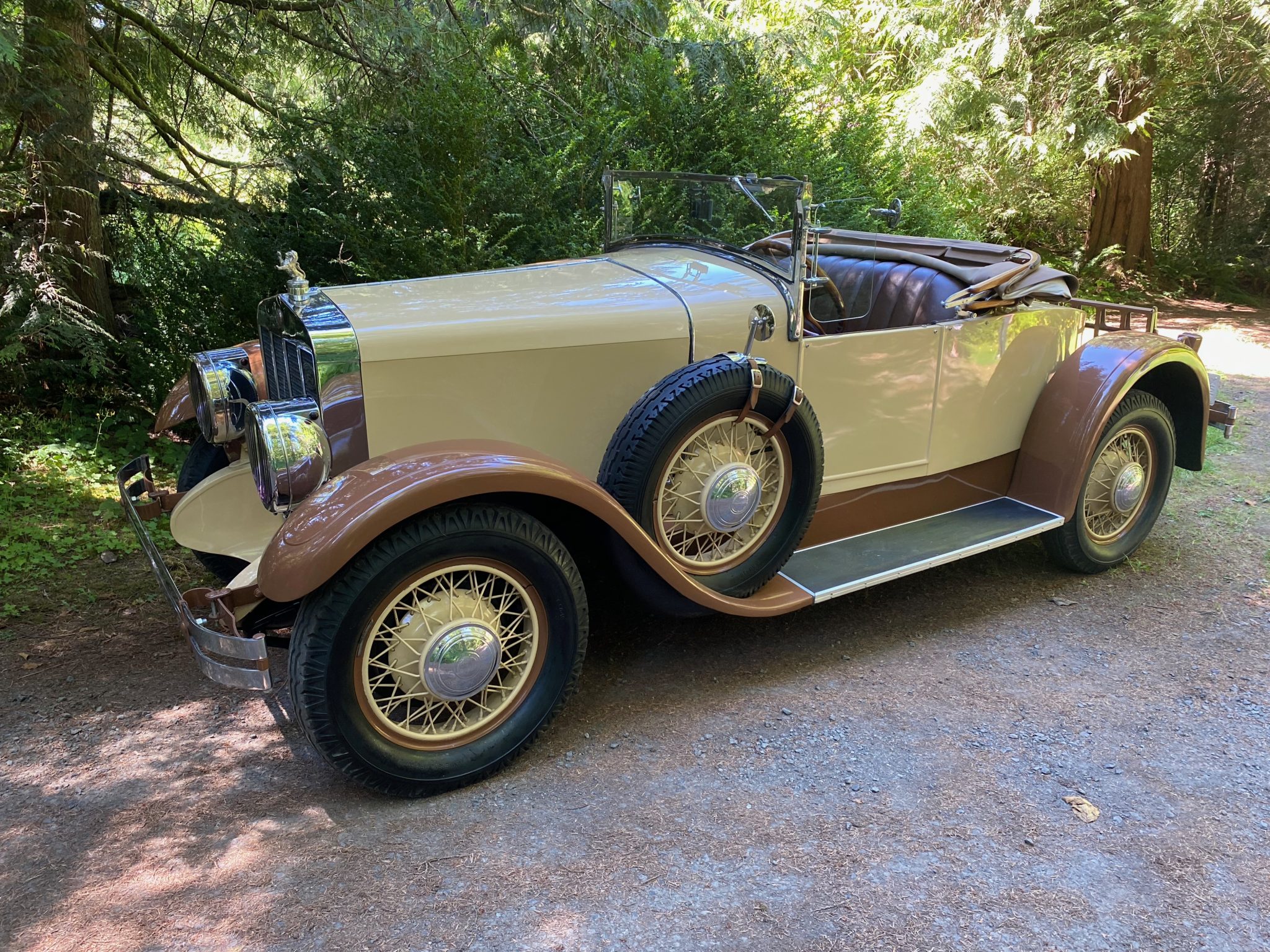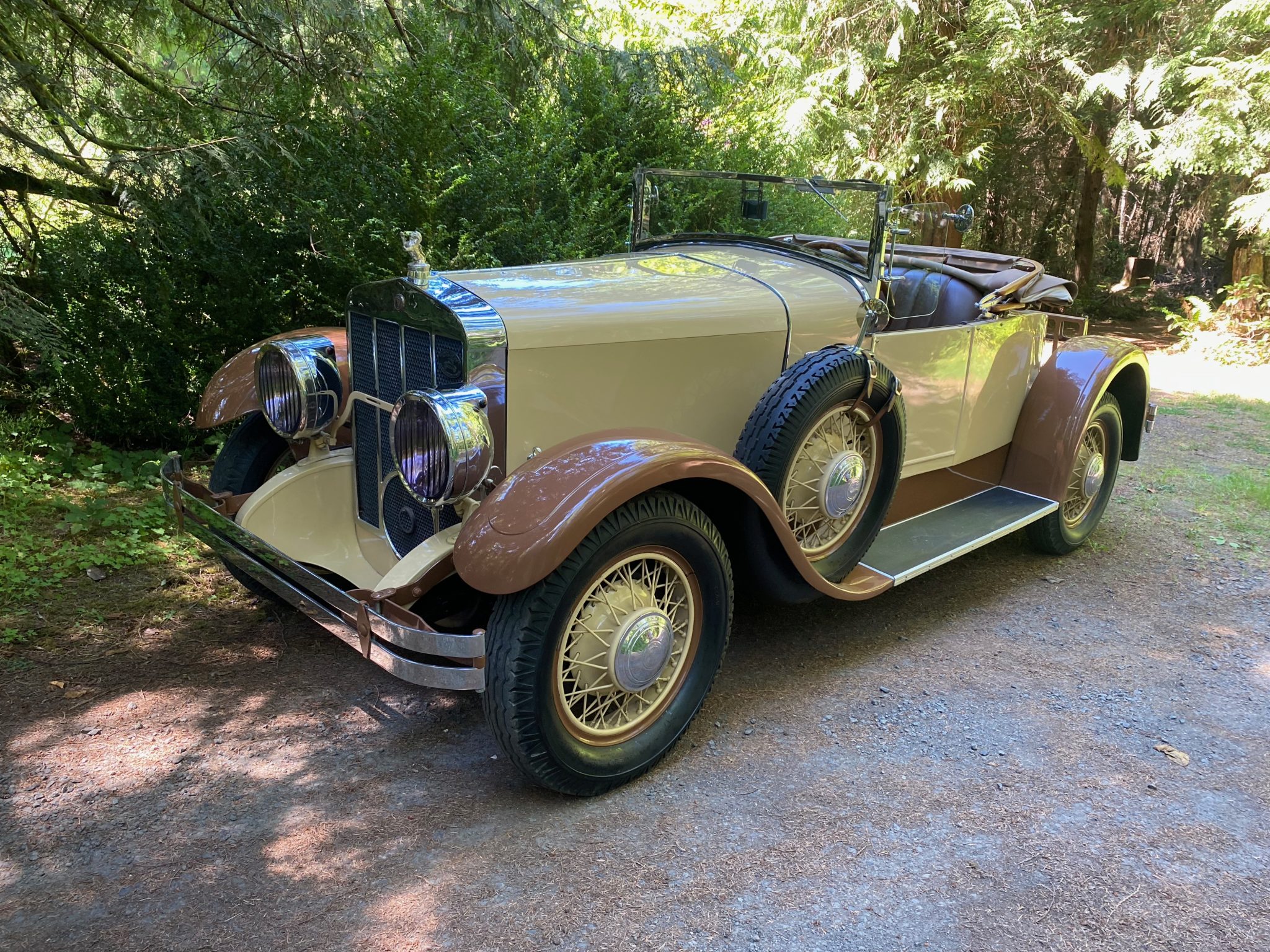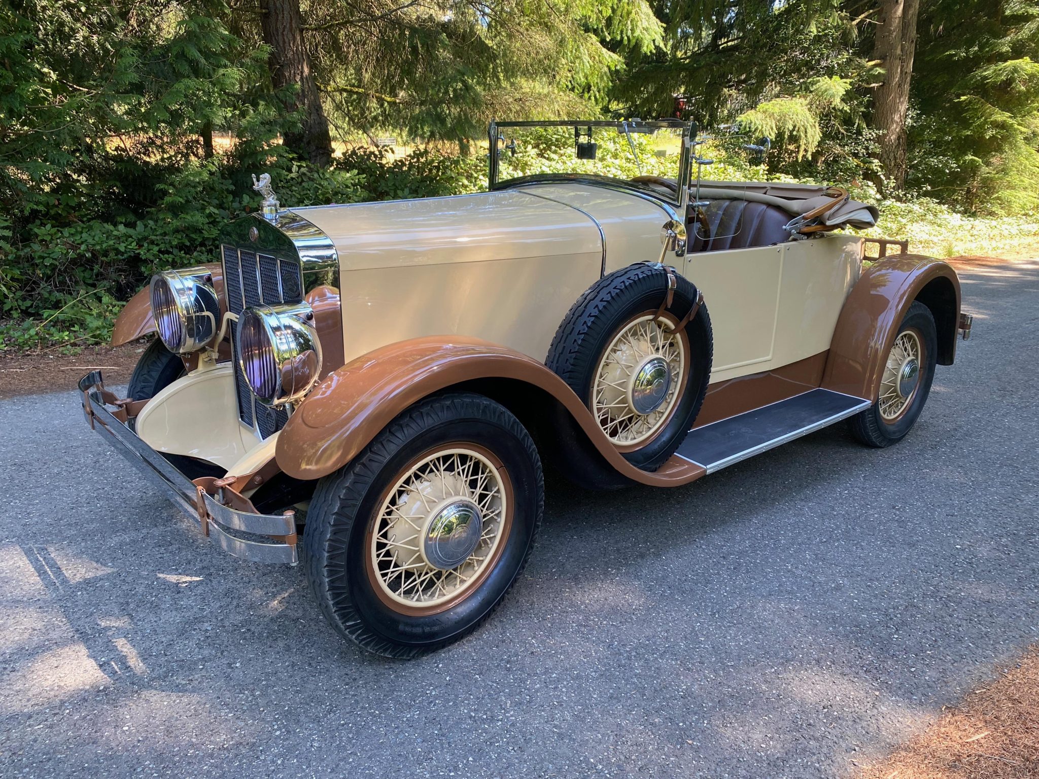 Body-color wire-spoke wheels feature brown rims and bright hubcaps, and they are mounted with 6.50–19 Universal bias-ply tires. A matching spare wheel topped with a mirror is mounted in the left fender. The car rides on a 119″ wheelbase and features fully elliptical leaf springs at all four corners as well as rear coil springs. Stopping power is provided by hydraulic drums at all four corners. The front brake cylinders were rebuilt by White Post Restorations of Virginia in 2019, and the brake shoes were also relined.
