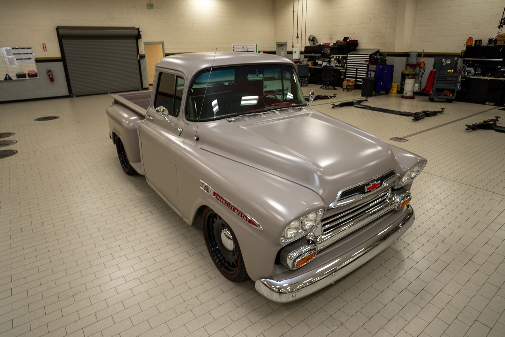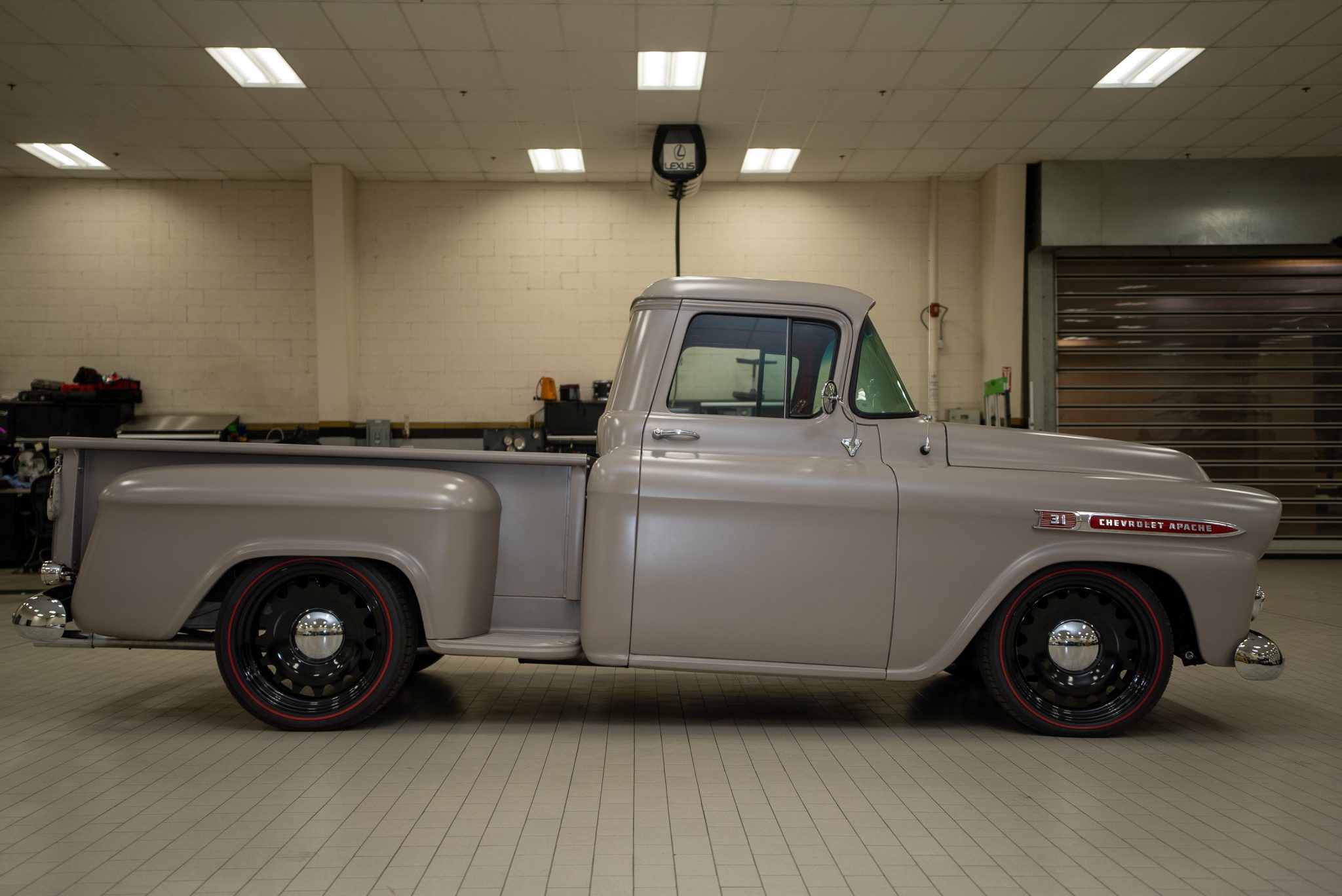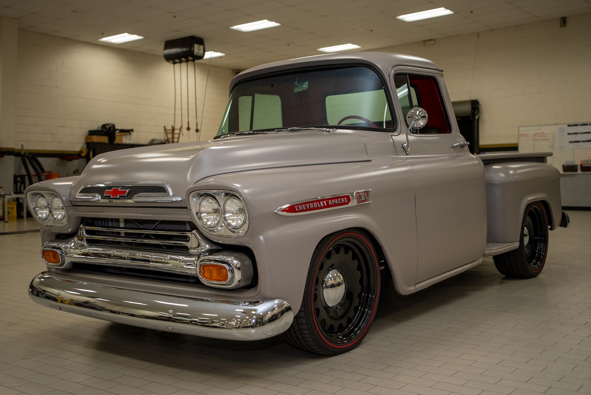The black-finished 20″ wheels wear chrome hubcaps and are mounted with 245/40 front and 275/40 rear Sumitomo redline tires. An independent front suspension setup with power steering has been added, while braking is handled by power-assisted front disc brakes paired with drums out back.